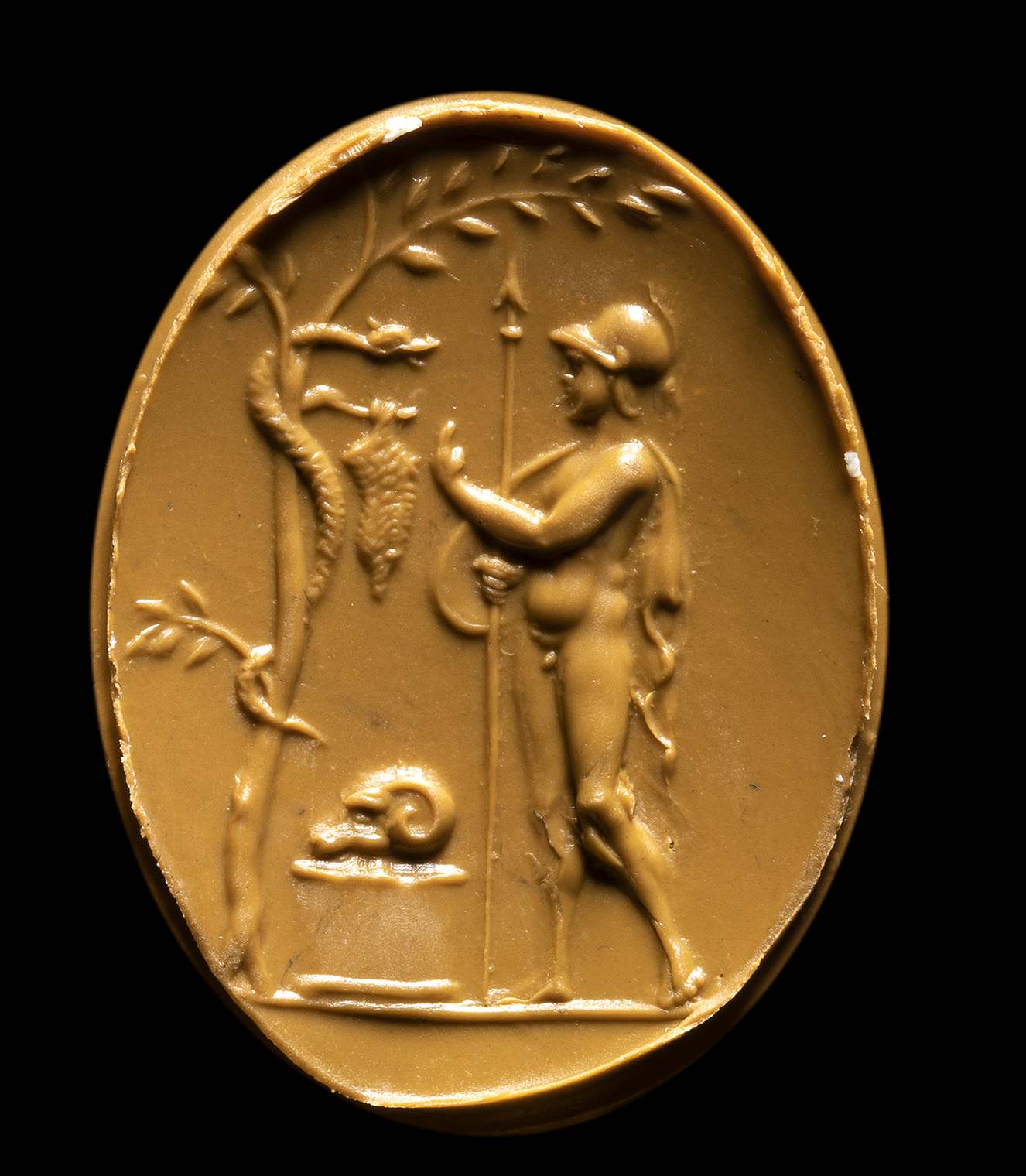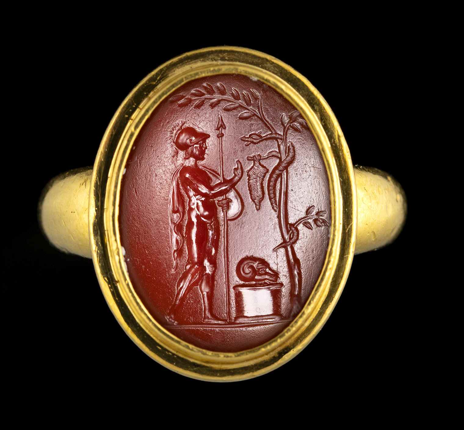 The oval stone slightly convex, engraved with Jason standing before the golden fleece which hangs in a tree before him. The hero is nude but with a mantle draped over his shoulder, holding a spear and a shield, its rim resting on his shoulder, and wearing a crested helmet, one hand raised before him in a gesture of contemplation, a serpent coiled in the tree, its head raised above the fleece, and a cylindrical altar for Zeus Laphystios in the center, upon which is the head of a ram, on a groundline. Slight wear marks. The stone is set in a later modern heavy collector gold ring.