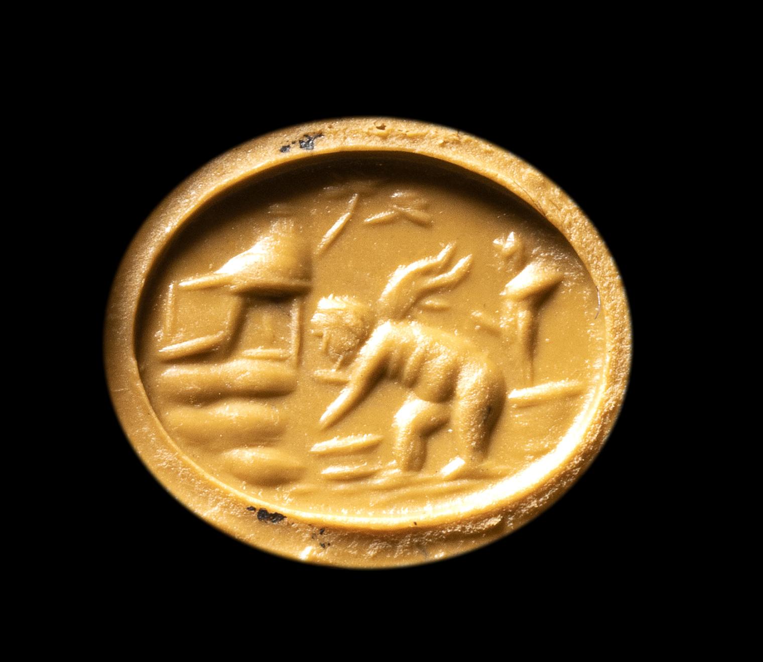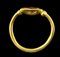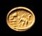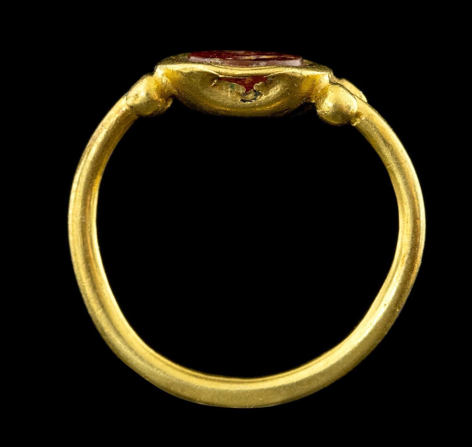 With rounded hoop, between the end is an oval box setting with an incised groove containing the carnelian intaglio: winged Eros making offers in a natural landscape. On either side of the hoop at each end are soldered large platted globules. Wear marks and missing material on the box-setting.