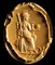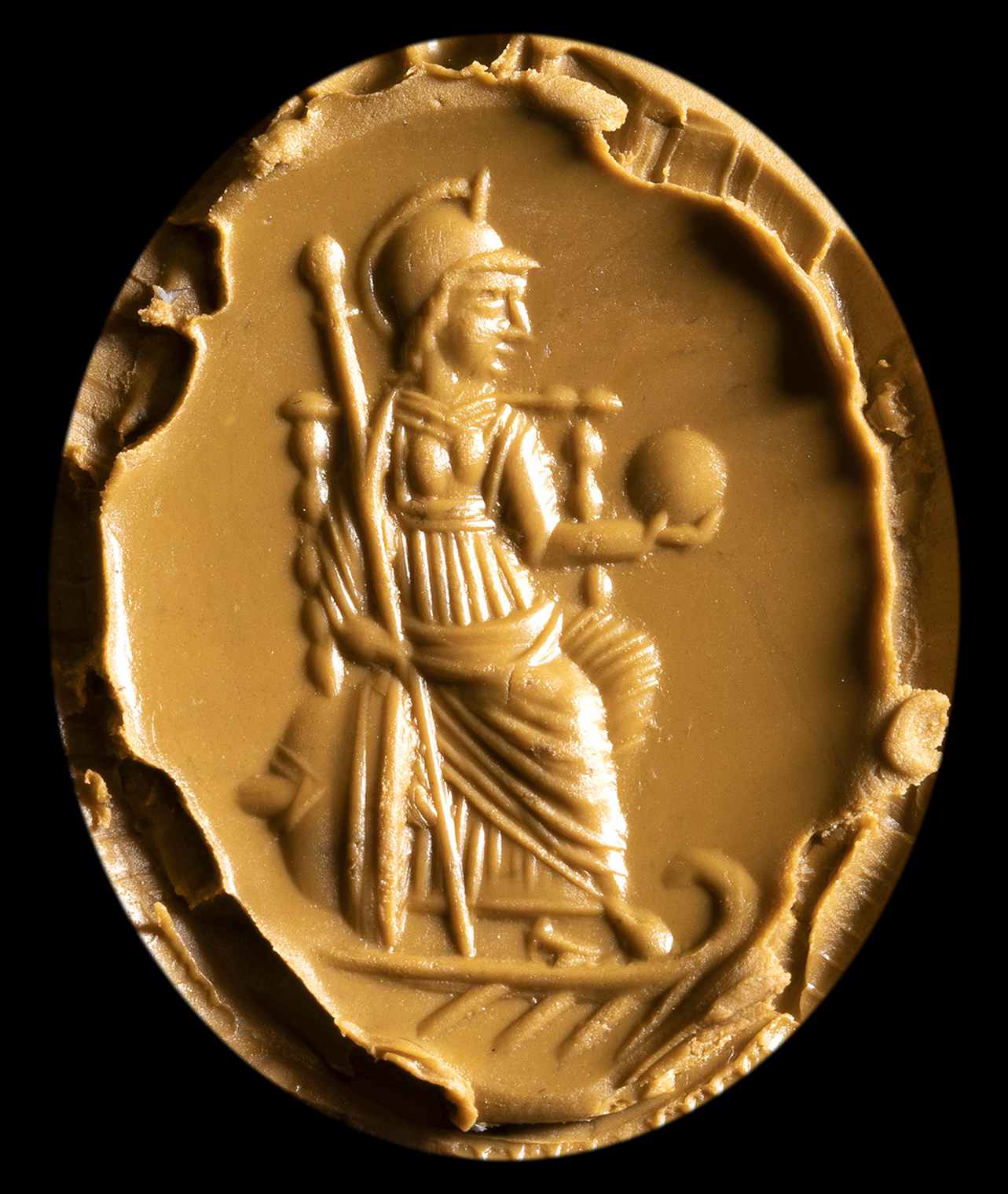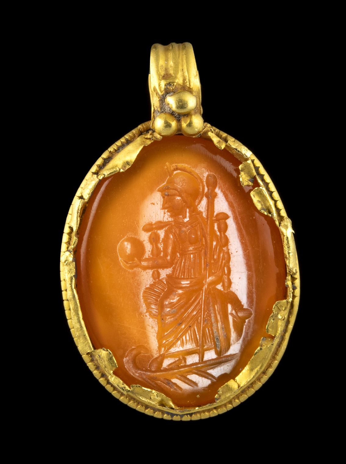 Composed of two gold sheets saldered, the suspension hook made of a separated gold sheet with three gold spherical beads. The intaglio depicts the personification of the city of Constantinople, enthroned, wearing helmet and holding scepter and globe, a shield lies at her side, a prow at her feet. Wear marks.