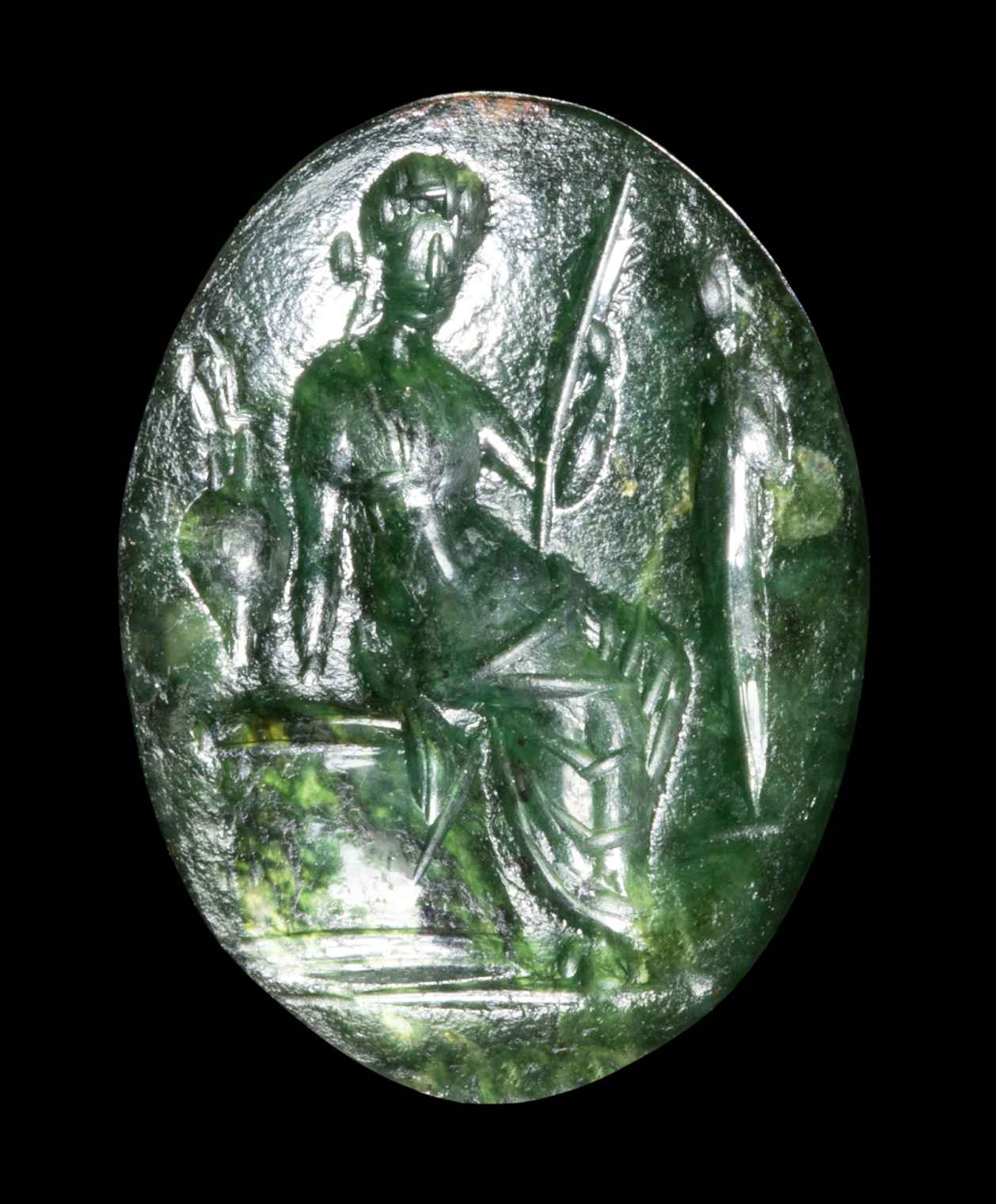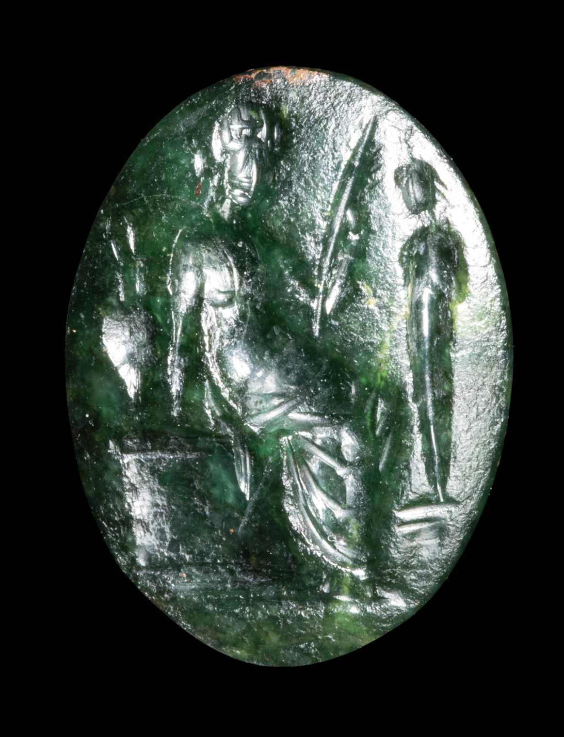 A ROMAN GREEN CHALCEDONY INTAGLIO. VOTIVE SCENE.