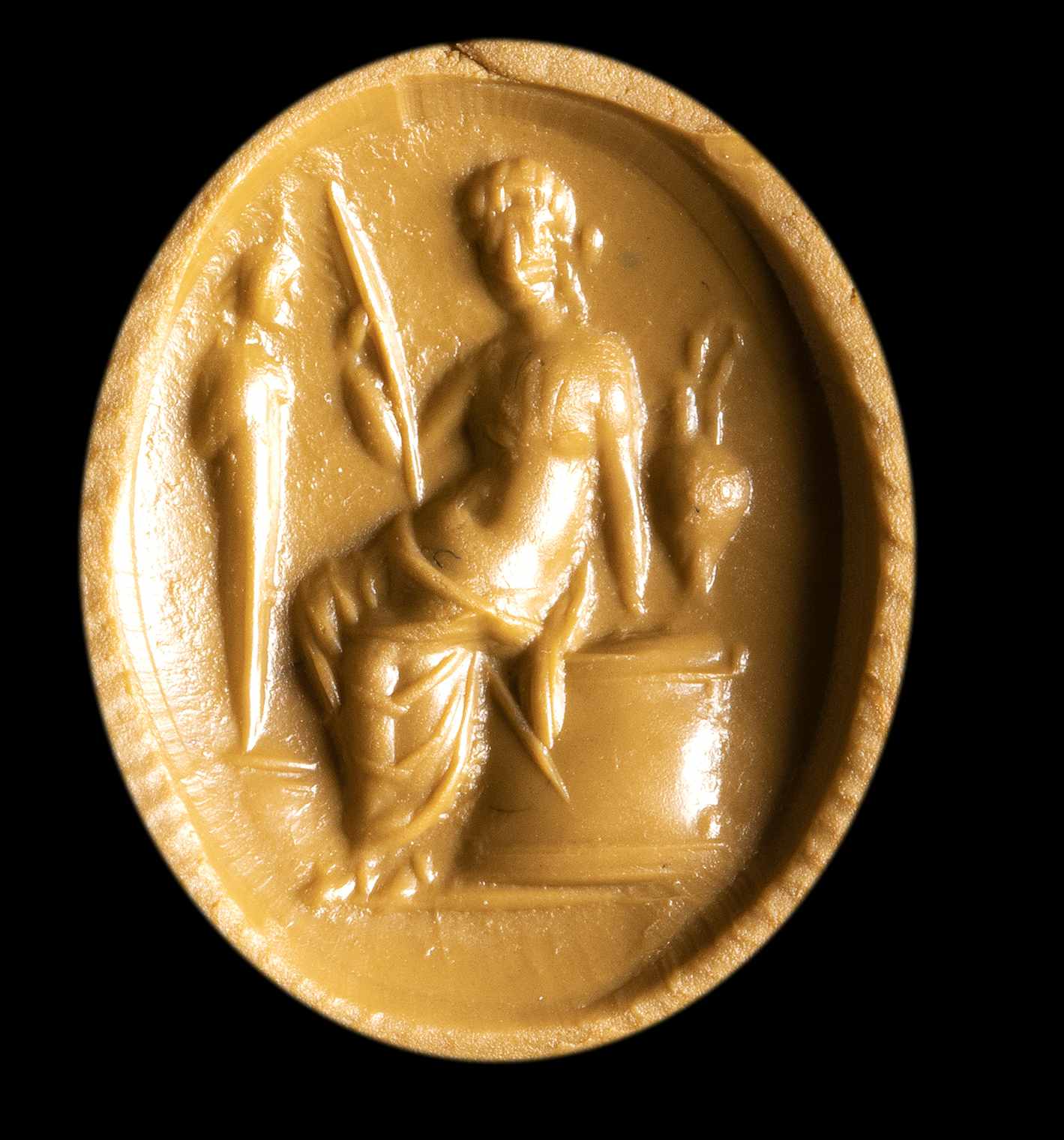 The female figure is seated in three-quarters on an altar, behind an oinochoe. She holds in a right hand probably a palm branch, in front of an herm. Groundline. The scene probably depicts a Muse. Beautiful colour of the stone and wear marks.