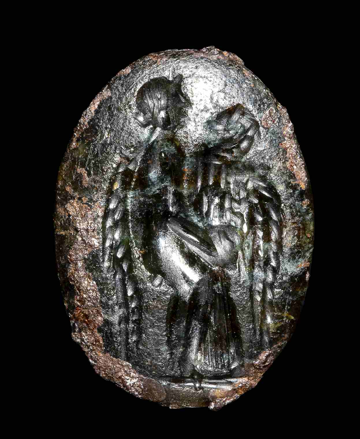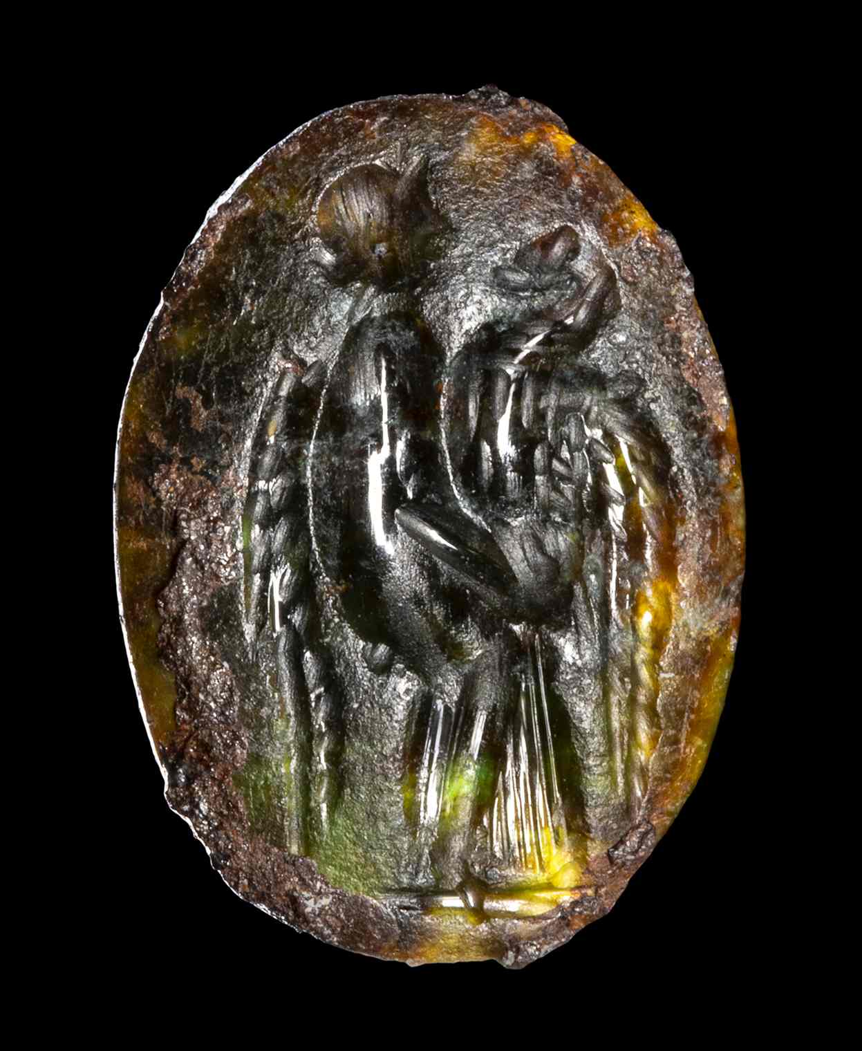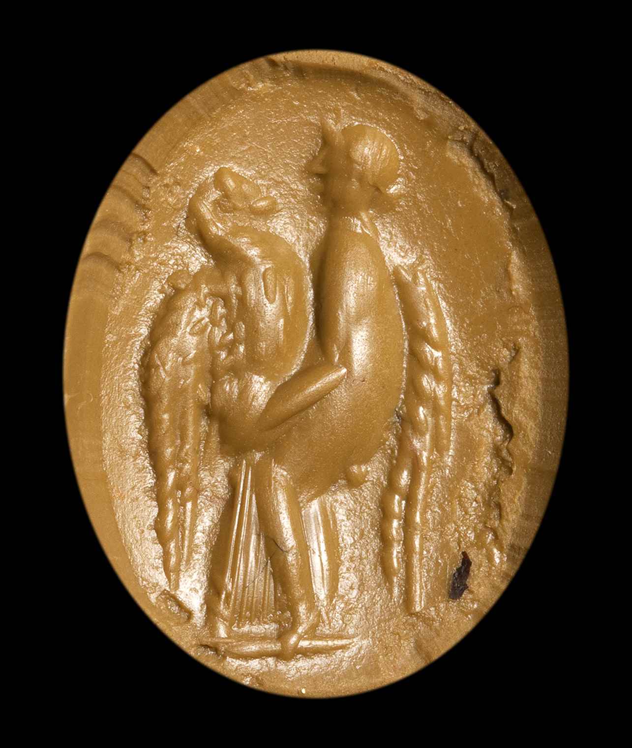Leda is embraced by the swan, metamorphosis of Zeus to seduce her. Groundline. Traces of the iron mounting on the back of the stone. Wear marks.