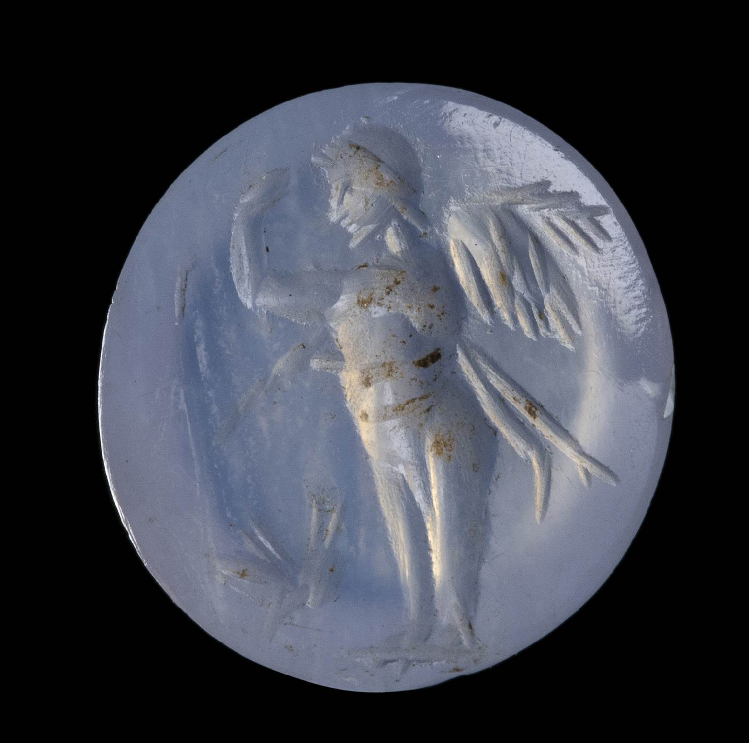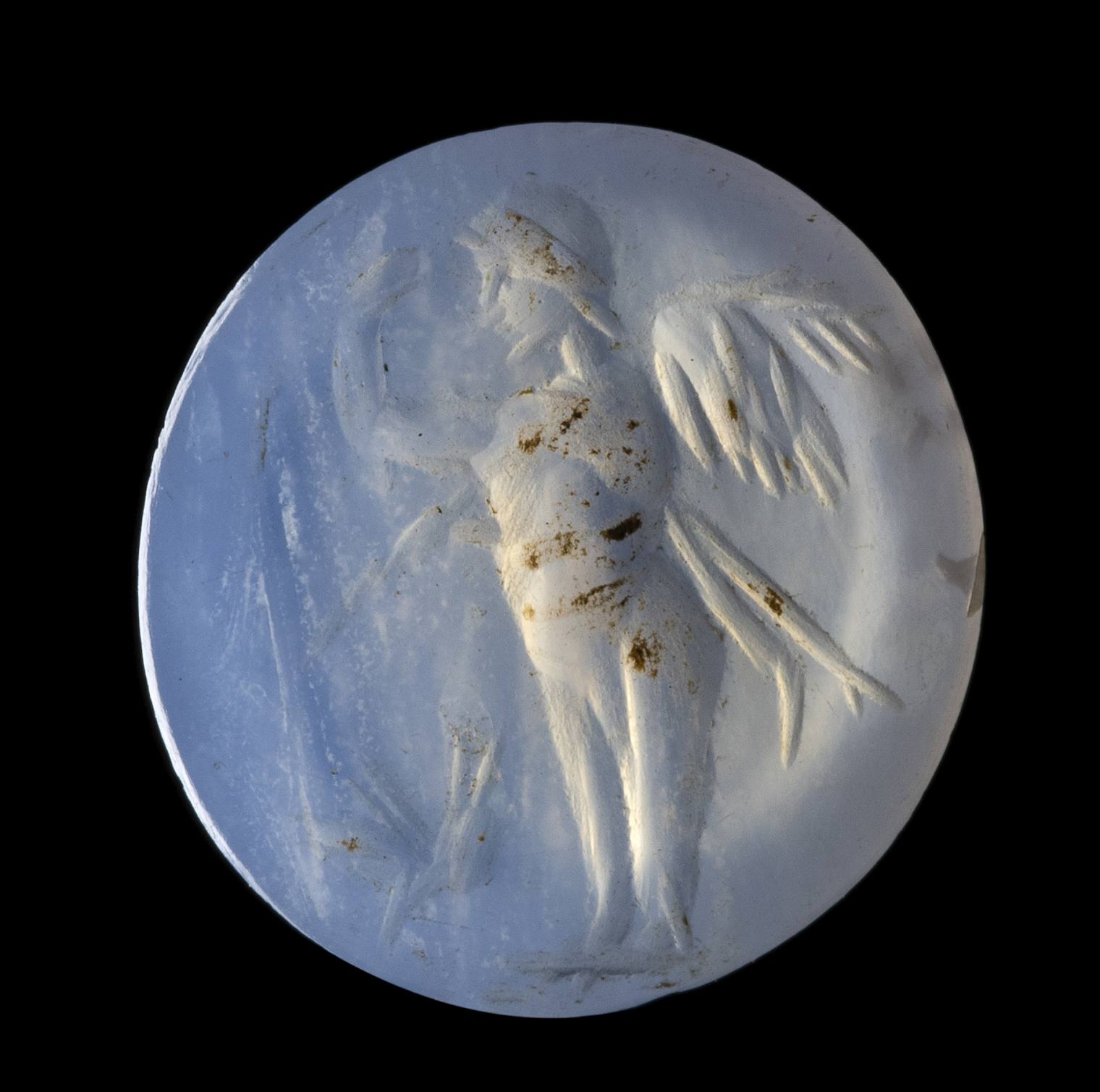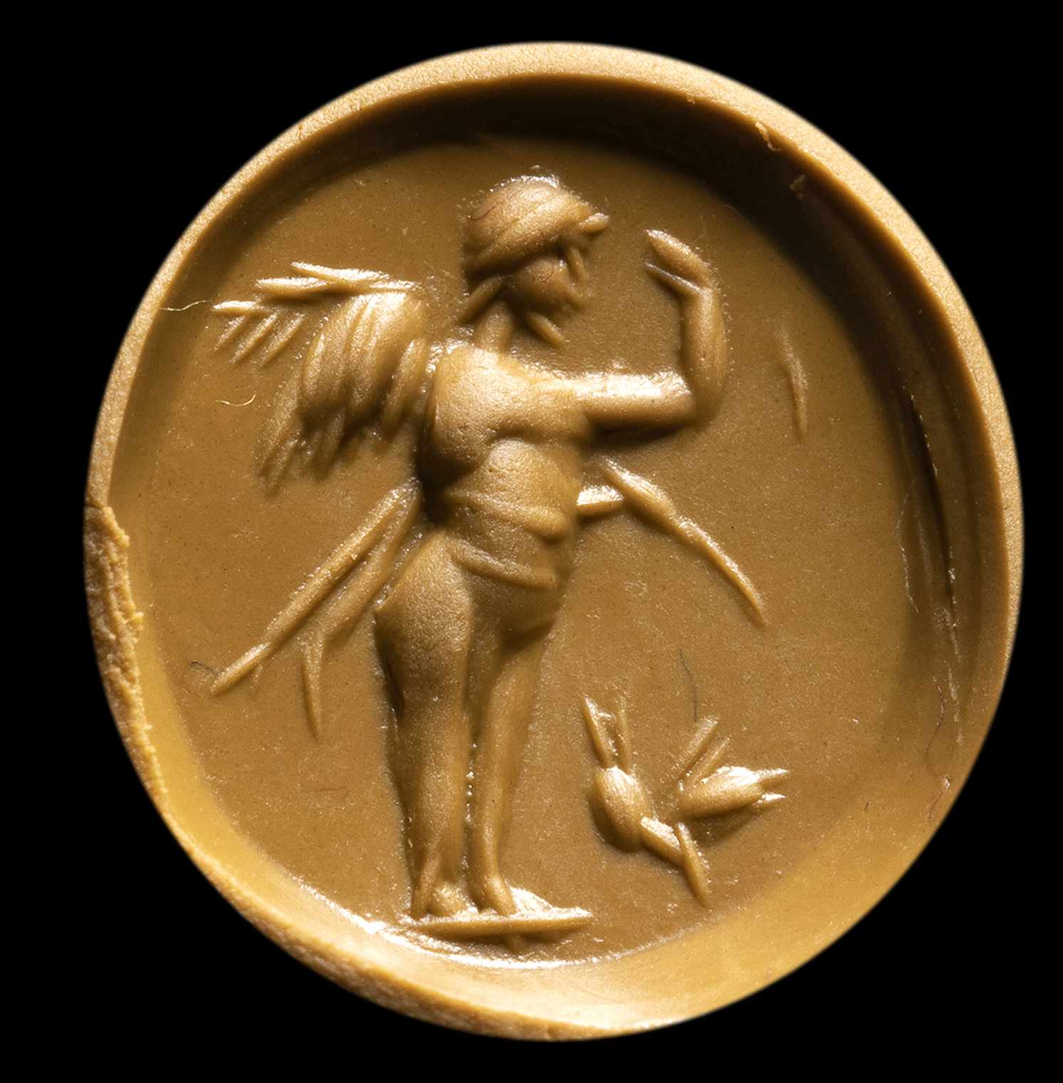 The winged god is shown standing left with the butterfly at his feet. Groundline. Allegory of Love through the Metamorphosis. Wear marks.