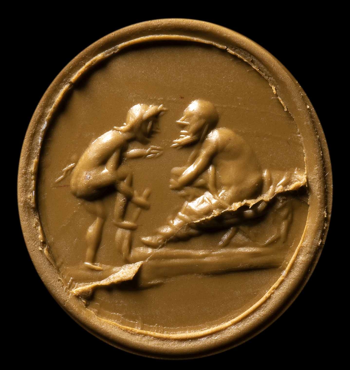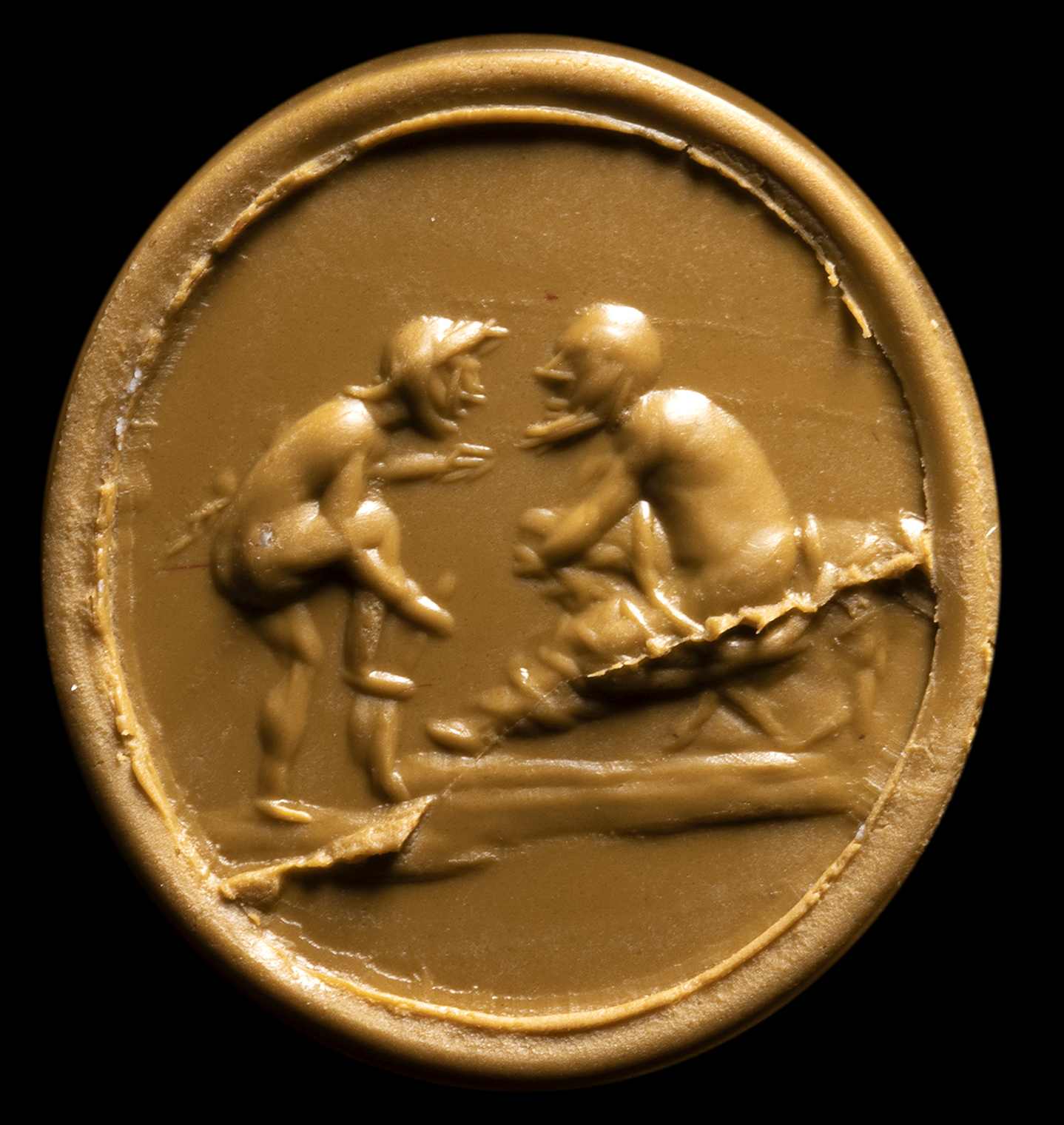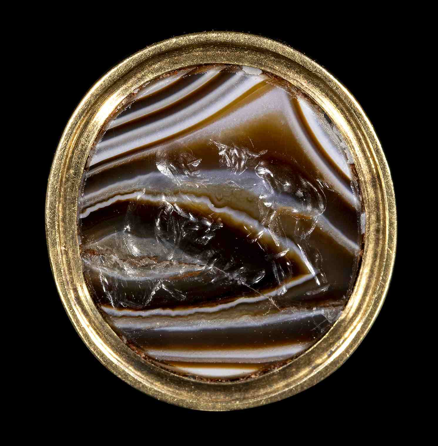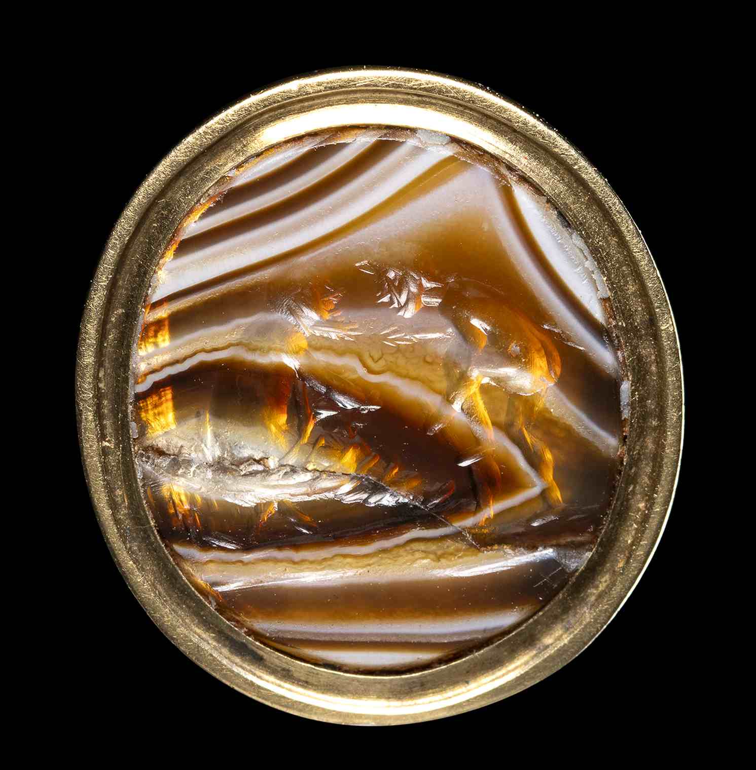 A ROMAN BANDED AGATE INTAGLIO SET IN A GOLD BOX-SETTING. MYTHOLOGICAL SCENE.