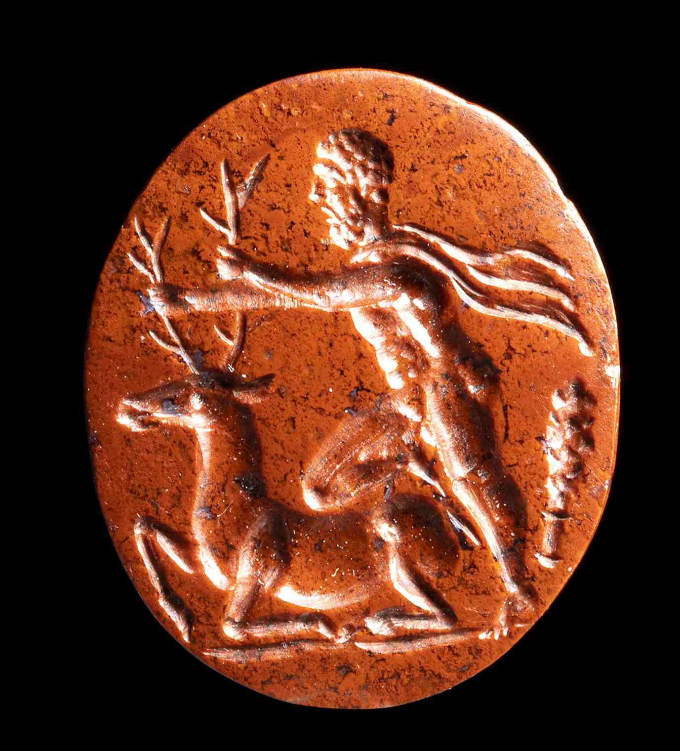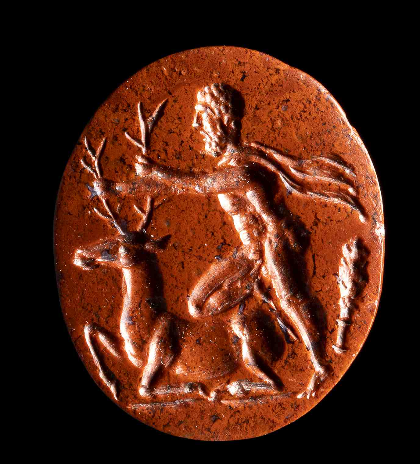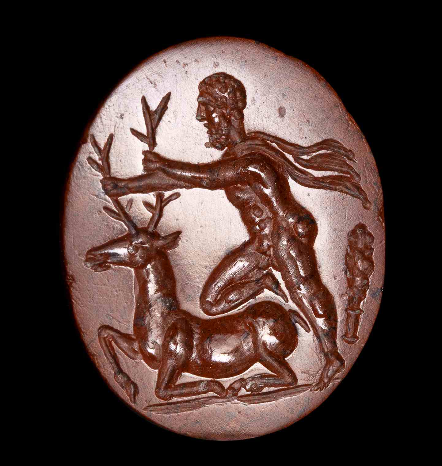 A ROMAN RED JASPER INTAGLIO. HERCULES CAPTURES THE DOE OF CERINEA.