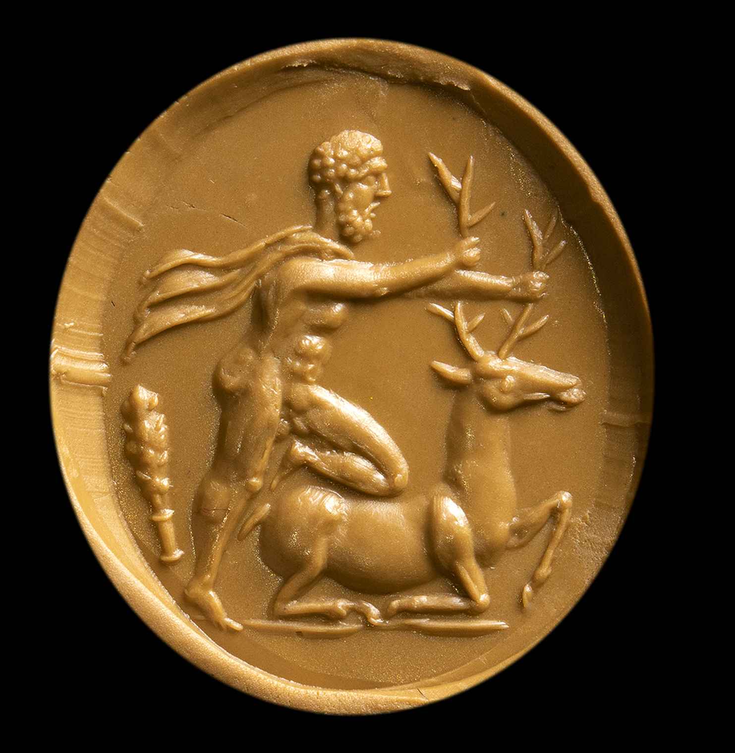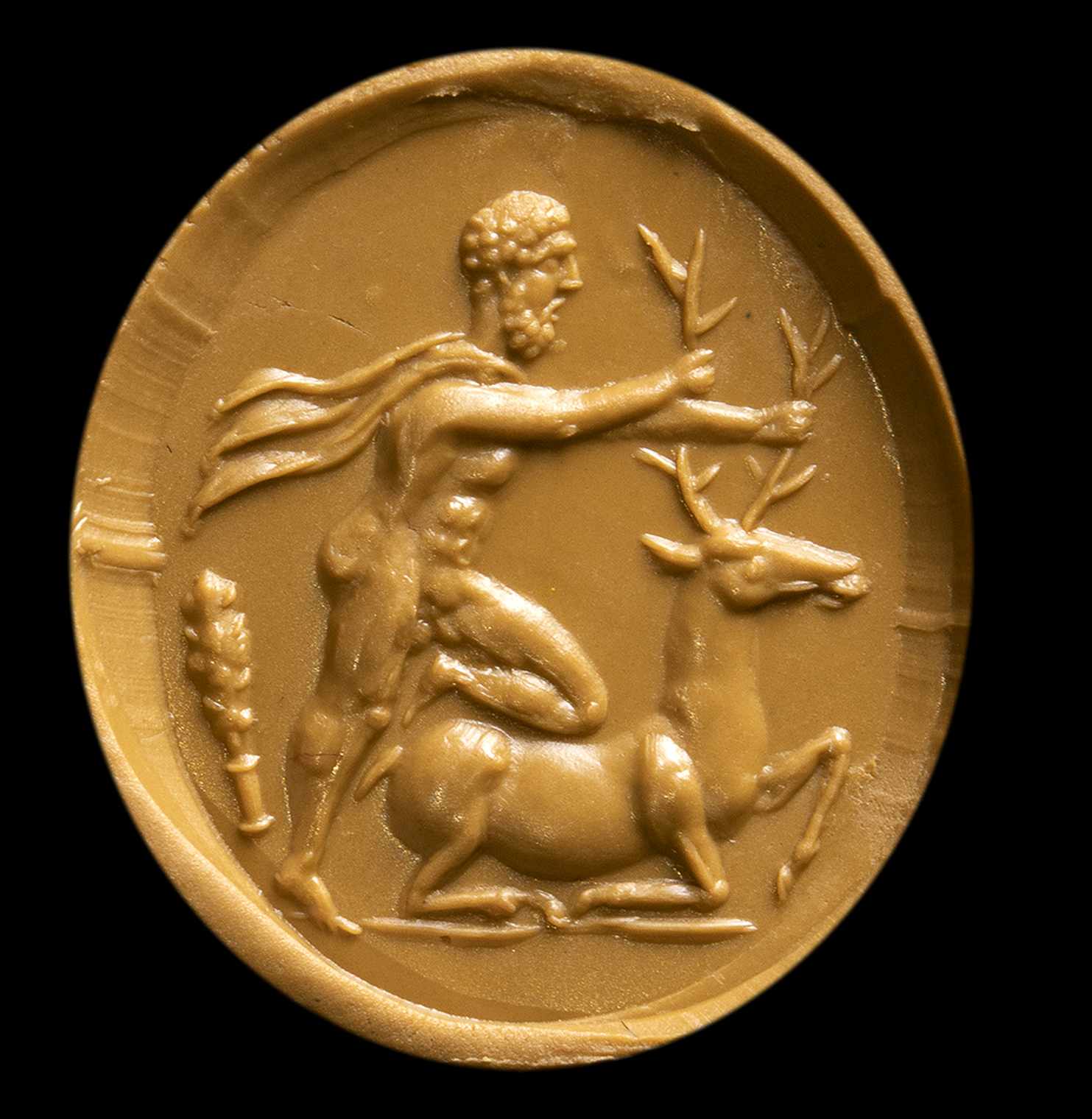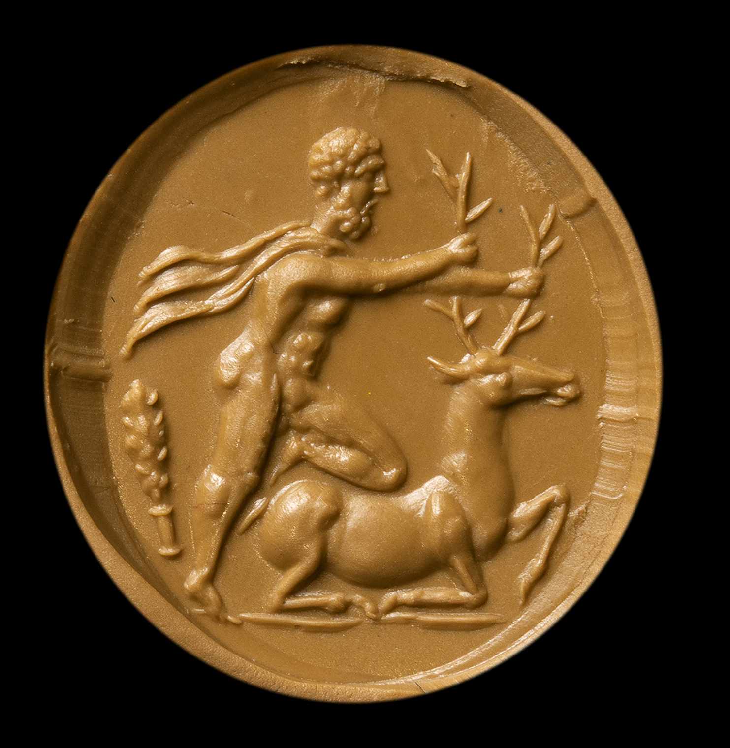 The doe of Cerinea was, in Greek mythology, a doe with golden horns, silver and bronze legs that have been dedicated to Artemis by the nymph Taygete when the goddess had saved her from being pursued by Zeus. Cerinea's doe fled without ever stopping, bewitching those who pursued her, thus dragging them to a country from which they would never return; since she was a sacred doe, her blood could not be shed. When Heracles was commissioned by Eurystheus to capture it, initially he limited himself to chasing it: the doe took refuge by climbing a mountain called Artemisio and tried to cross the Ladon river, but during the crossing Heracles managed to capture it by hitting it with an arrow in one point of the cartilaginous paw, therefore devoid of blood vessels; then loading it on his shoulders he carried it to Arcadia. The doe was finally taken to Mycenae and released there. The subject rarely appears on the gems. In this stone the hero faces left and stands over the sacred doe, holding it by the horns and pressing his right knee on his back to block it. Hercules' body is in muscular tension showing off all its legendary strength. A club behind him. Probably inspired by a Greek model. Fine detailed execution for the size. The physiognomic features of the hero recall the Antonine portraits. Signs of wear.