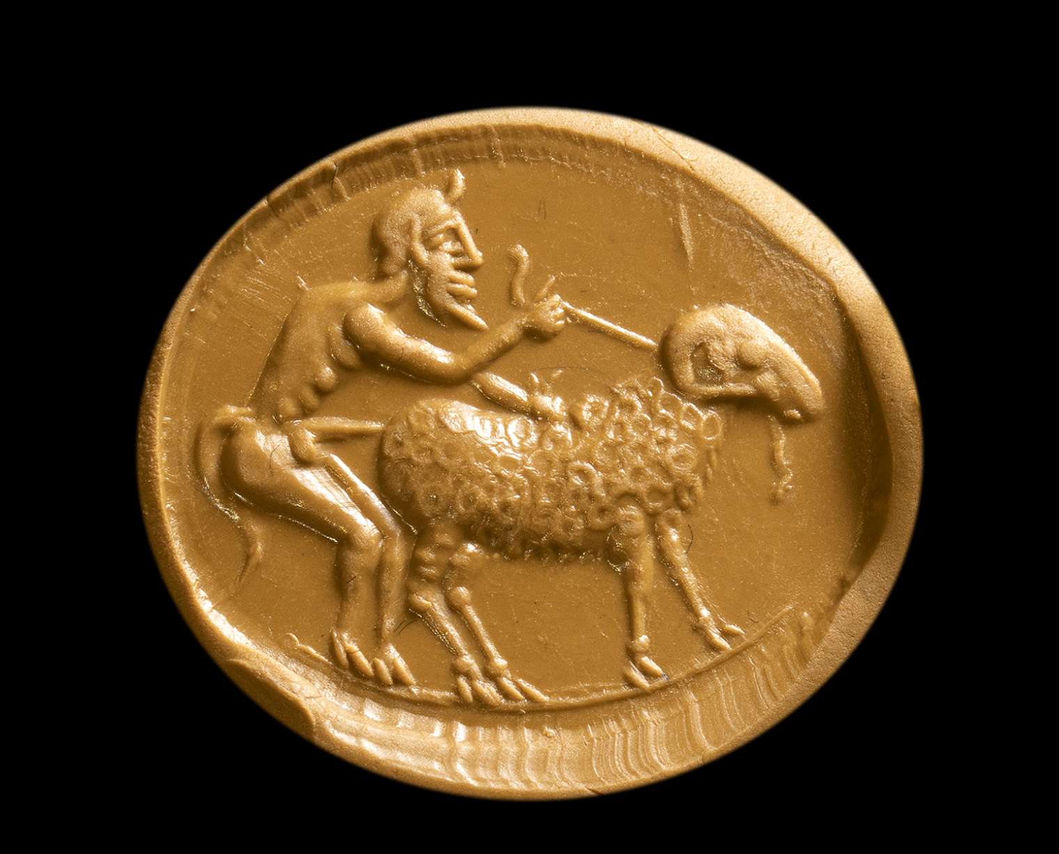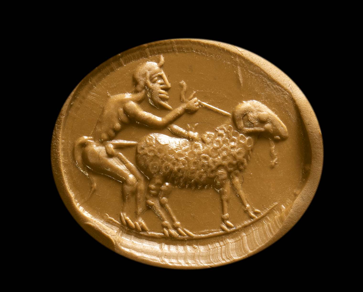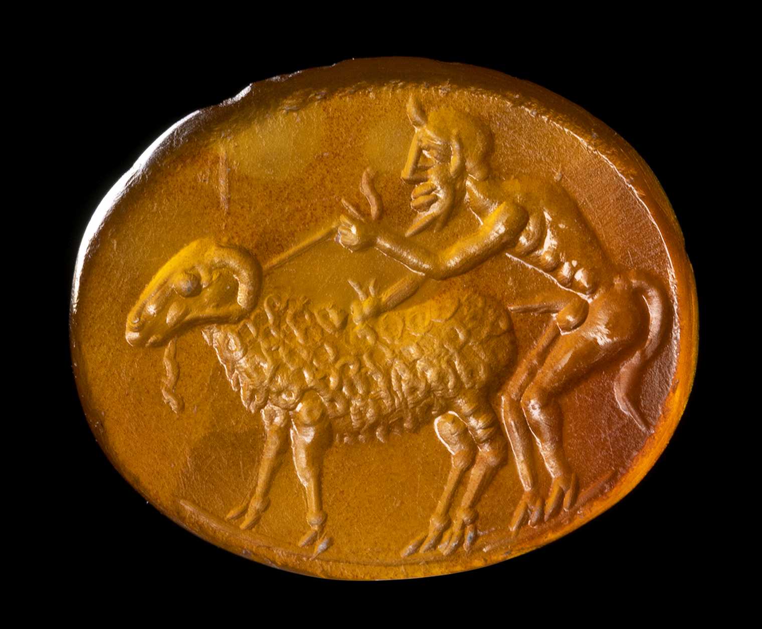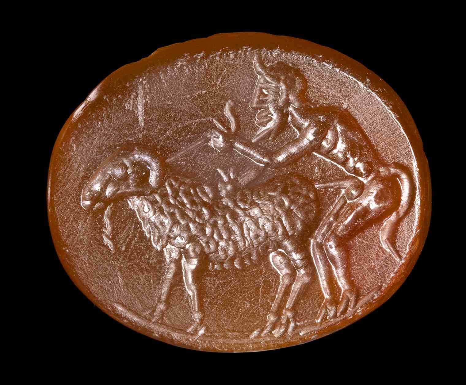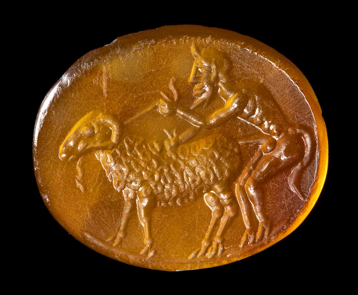 A satyr with an erected phallus threatens to rape from behind a ram, holding its fur on its back and a ribbon which the animal holds in its mouth. Groundline. Large size. Fine execution. Great subject. Wear marks