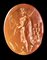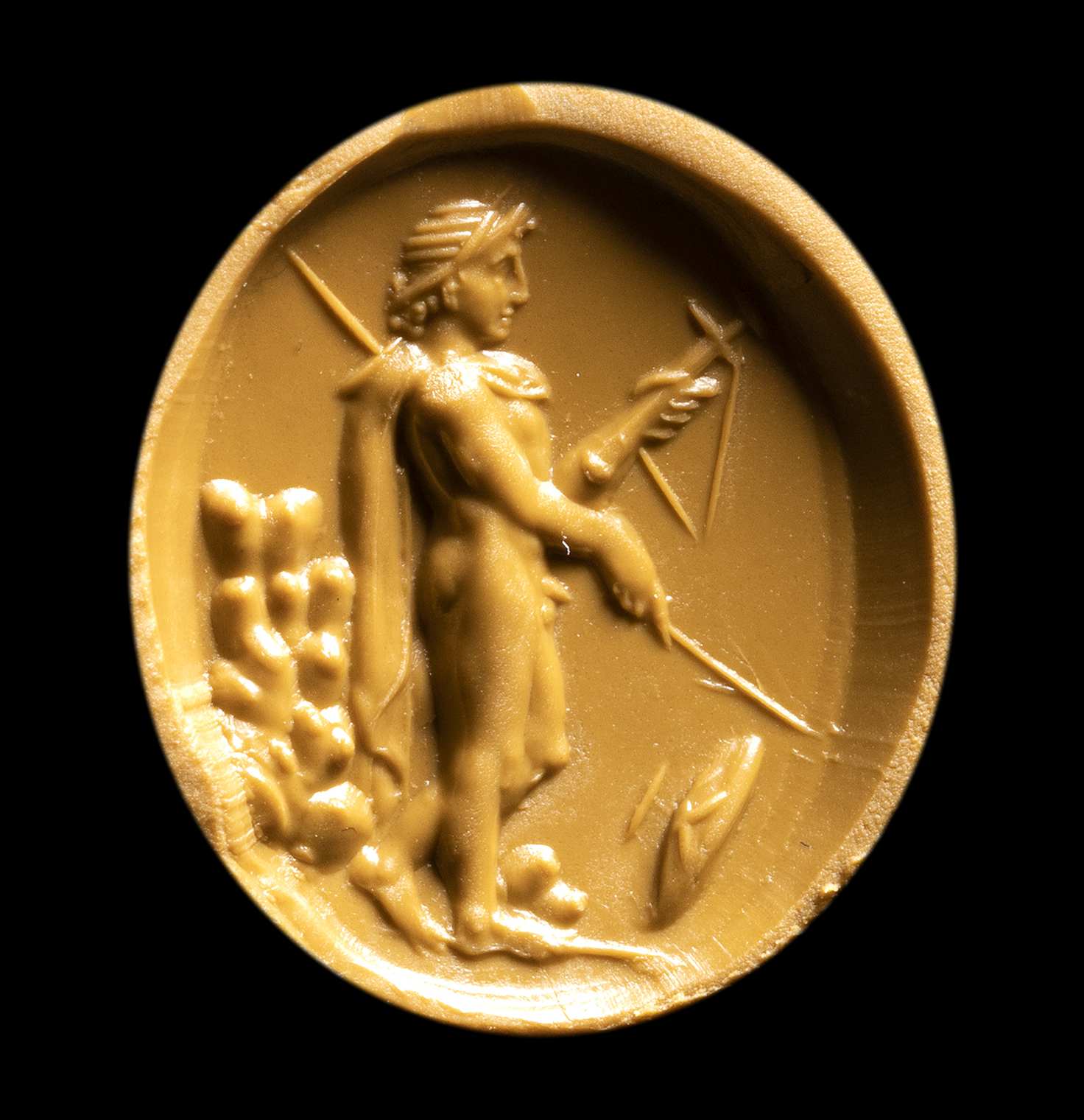 The warrior faces left and is characterized by a muscular and powerful body. He holds the sheathed sword in his right hand, the spear in his left. Below, the shield; long cloak over the shoulders. Rocks behind the figure. Wear marks and chip on the edge.