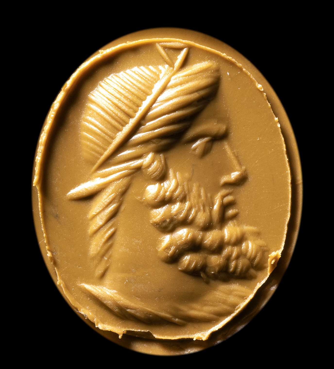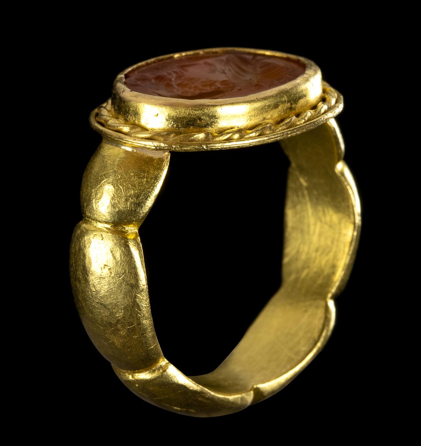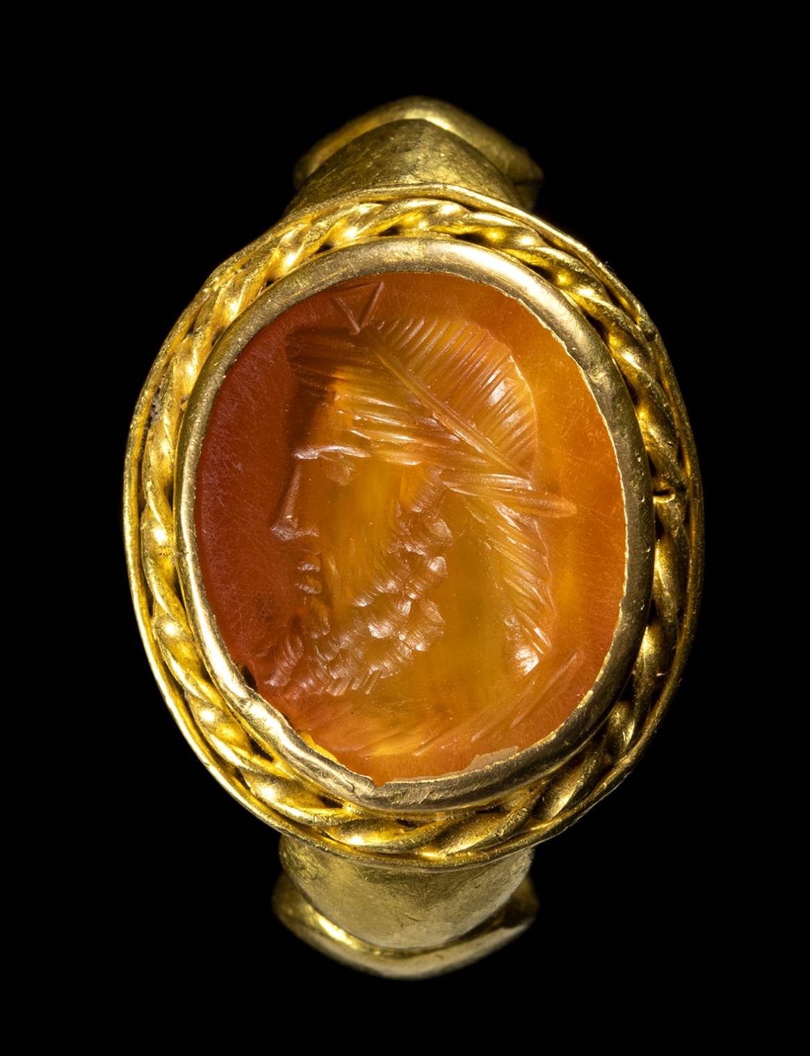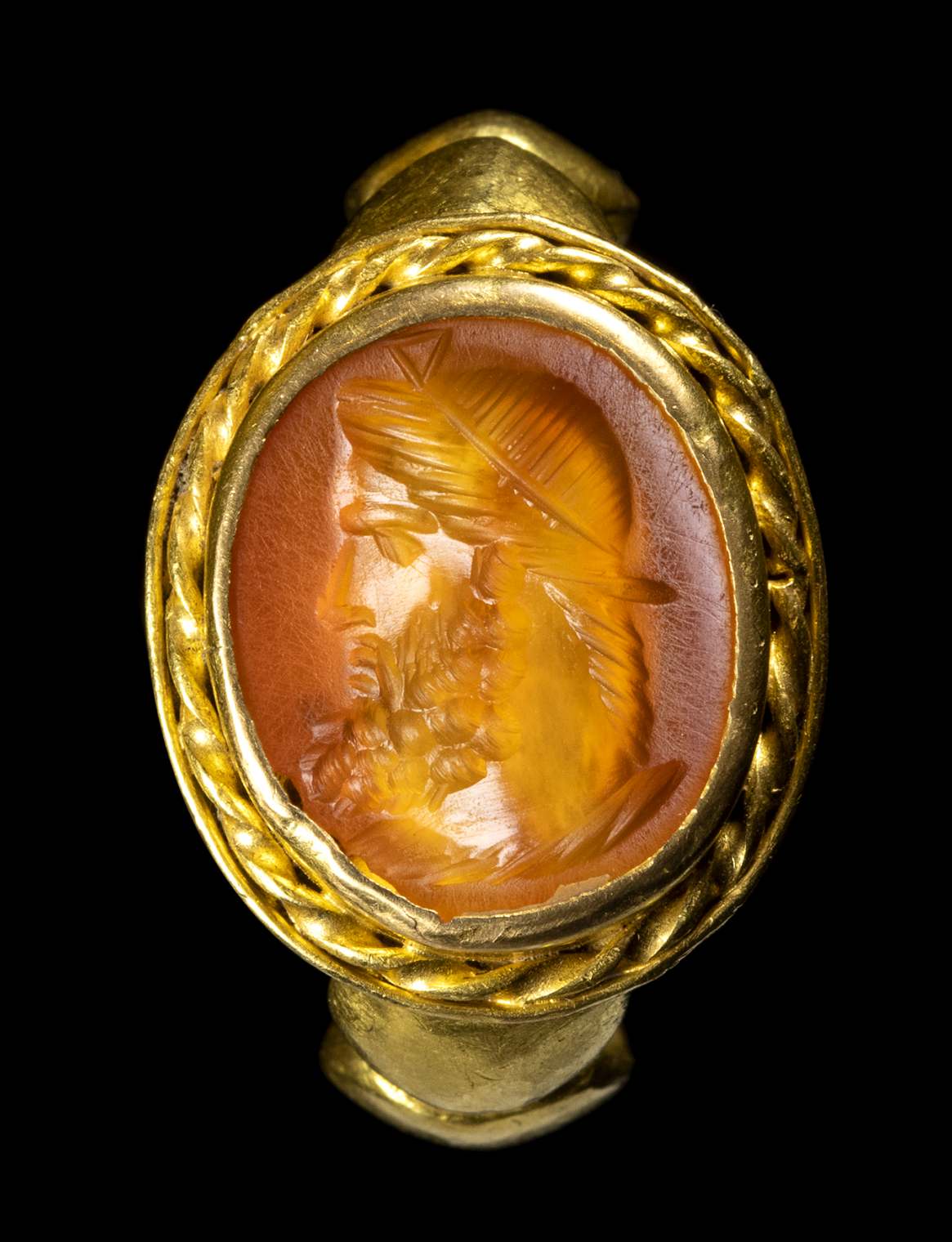 With lobed hoop, flatten within and surmounted by a large oval box setting with a twisted gold wire. The intaglio shows the god facing left, characterized by a long beard and hair adorned with a band and stylized triangular modius. Wear marks.