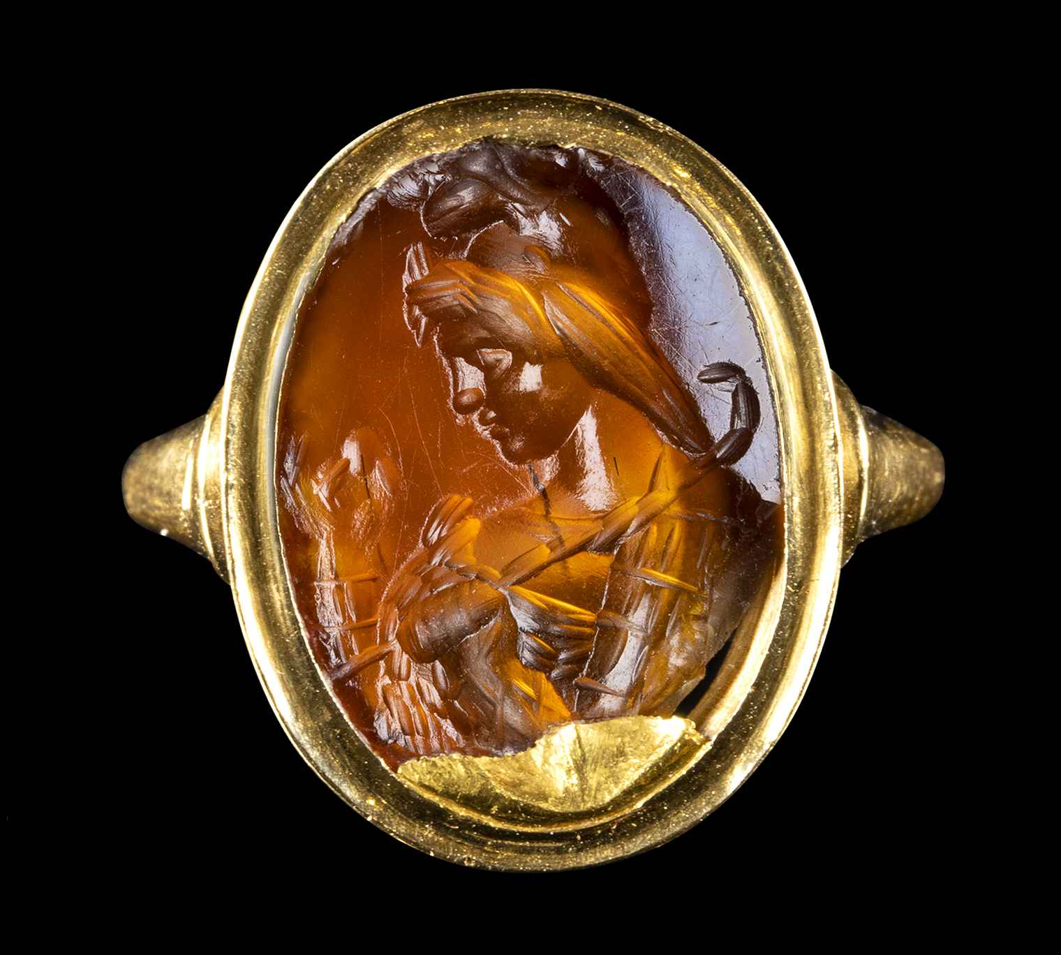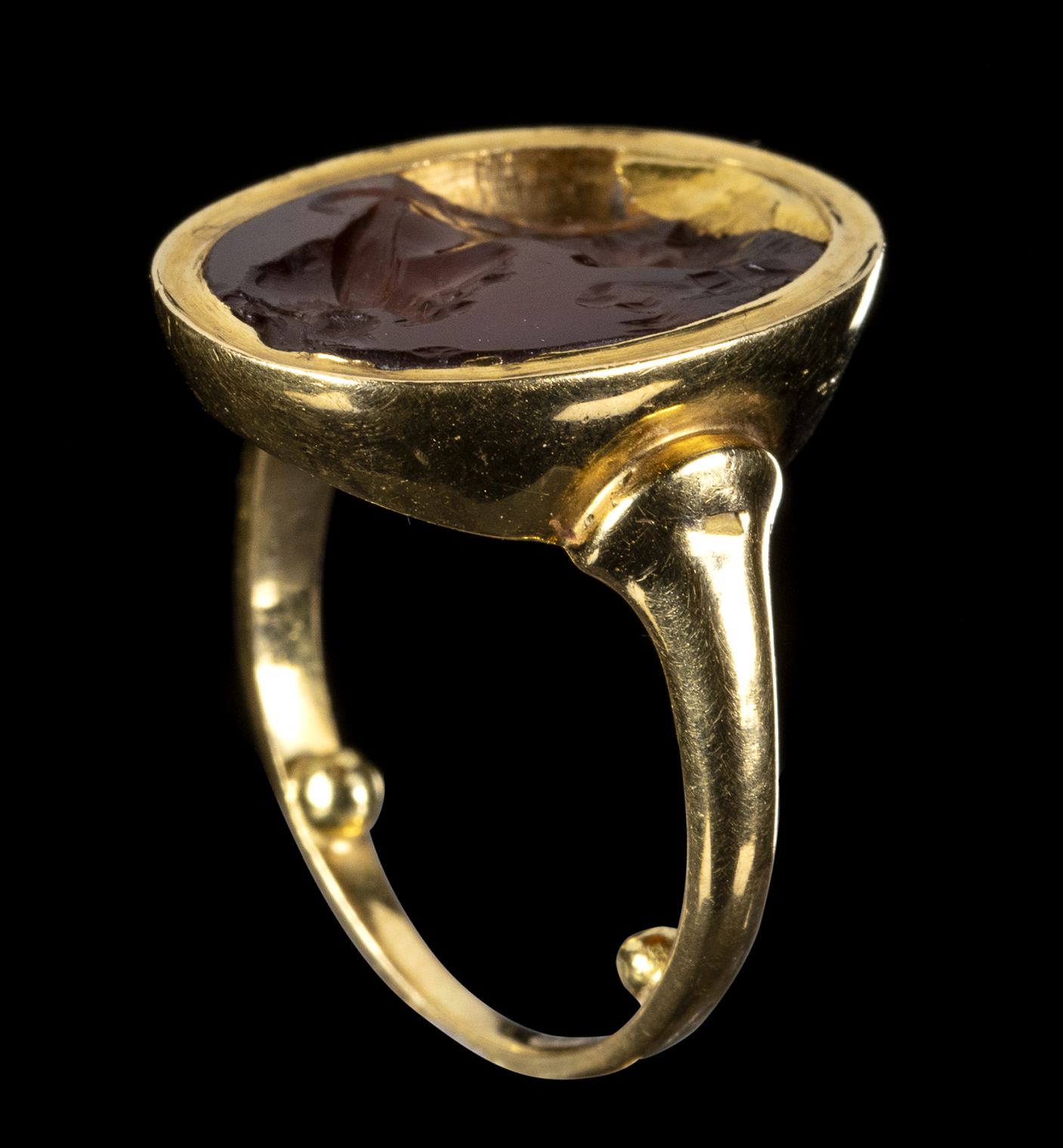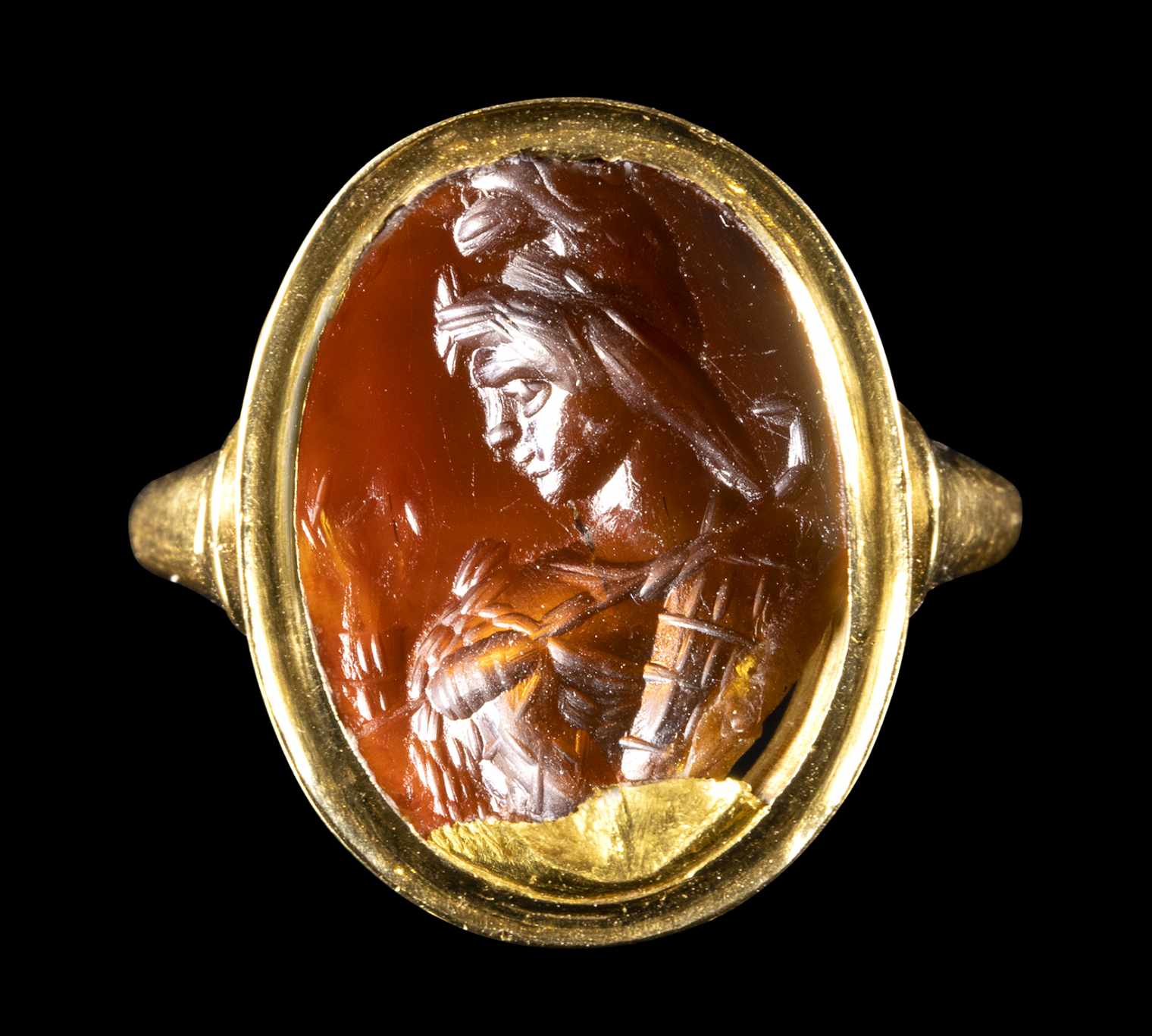 Lotto 171 | A ROMAN CARNELIAN INTAGLIO SET IN A GOLD RING. BUST OF ATTIS.