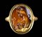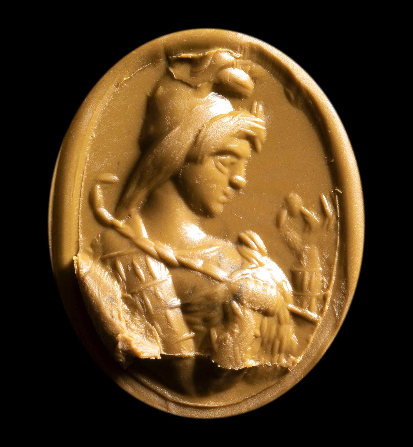 The young man is turned to the left, wearing his typical Phrygian cap (from which the long hair comes out) and a long sleeved, heavy, hatched "sweater". He is holding the pedum in his left hand; in his right hand, between two fingers, he is holding a small fruit (which can be identified with an almond), which he carefully observes. According to the myth, a plant, in the form of an almond tree, was born from the blood spilling from his father's (Adgistis) castration (Pausania); Nana, daughter to the king Sangarius, picked an almond and got pregnant, giving birth to Attis. Following the myth, in this intaglio Attis is contemplating the fruit which was the cause of his divine conception. Extraordinary iconography, and of a particular interest, also related to the cult of Cybele and to mysteries, with an allegorical reference to fecundation. The stone is chipped in its upper part, and fragmented at the bottom, partially reintegrated by the gold of the modern mounting.
