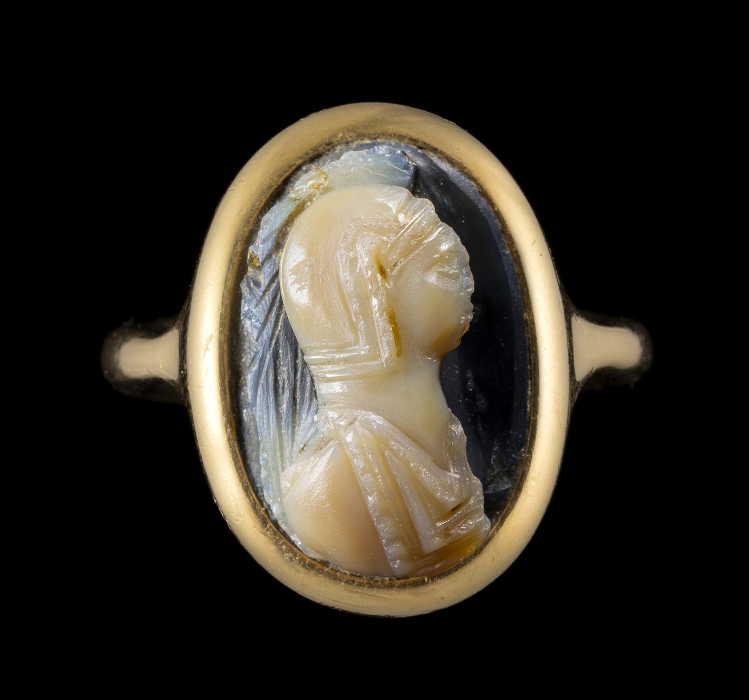Lotto 176 | A LATE ROMAN AGATE CAMEO SET IN A GOLD RING. HELMETED BUST.