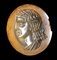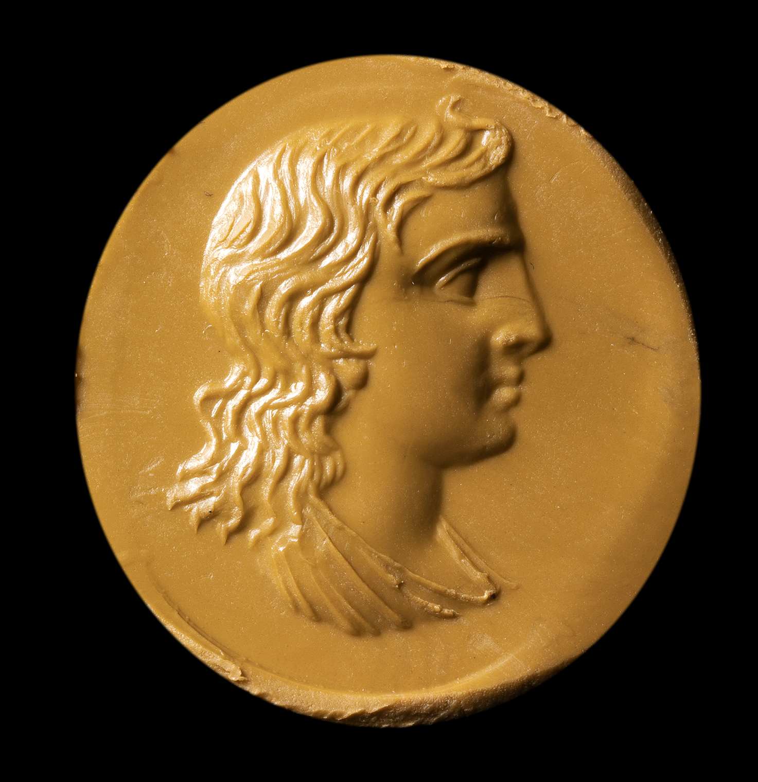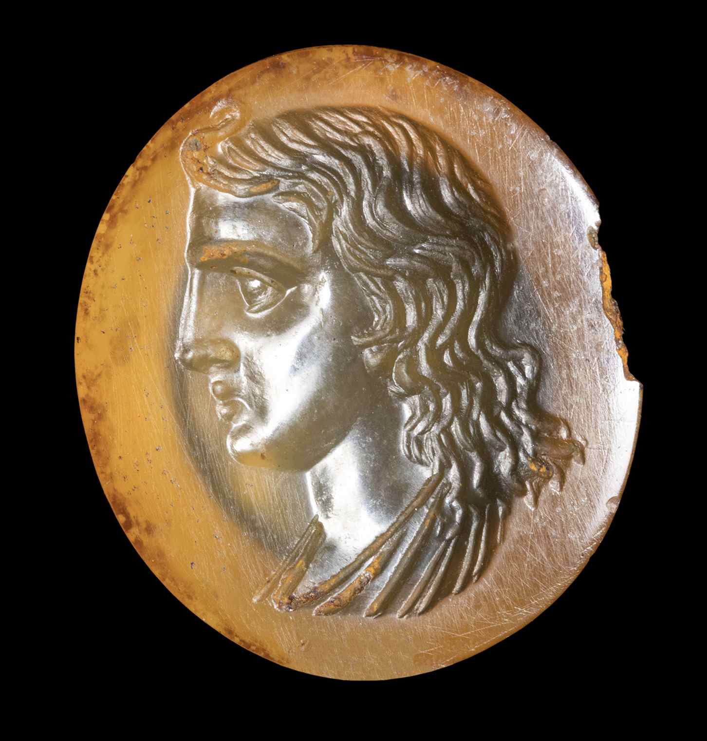 The young character is facing left and characterized by fine features and long wavy hair. Iron traces and wear marks on the surface of the stone. Chip on the edge.