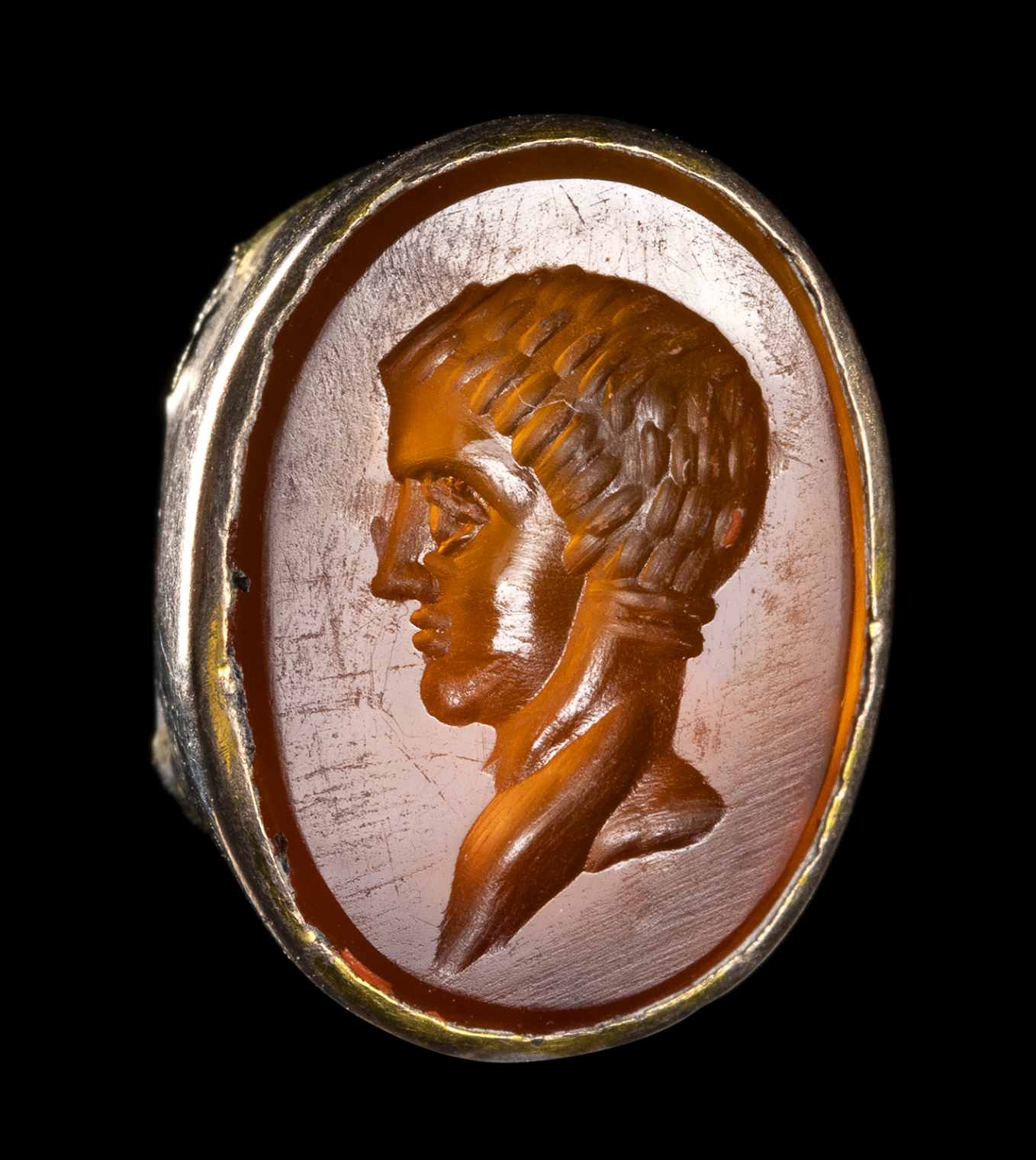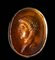 Male portrait of a young man in profile to the left. The stone is mounted in a gold frame likely from the 19th century. Wear marks.
