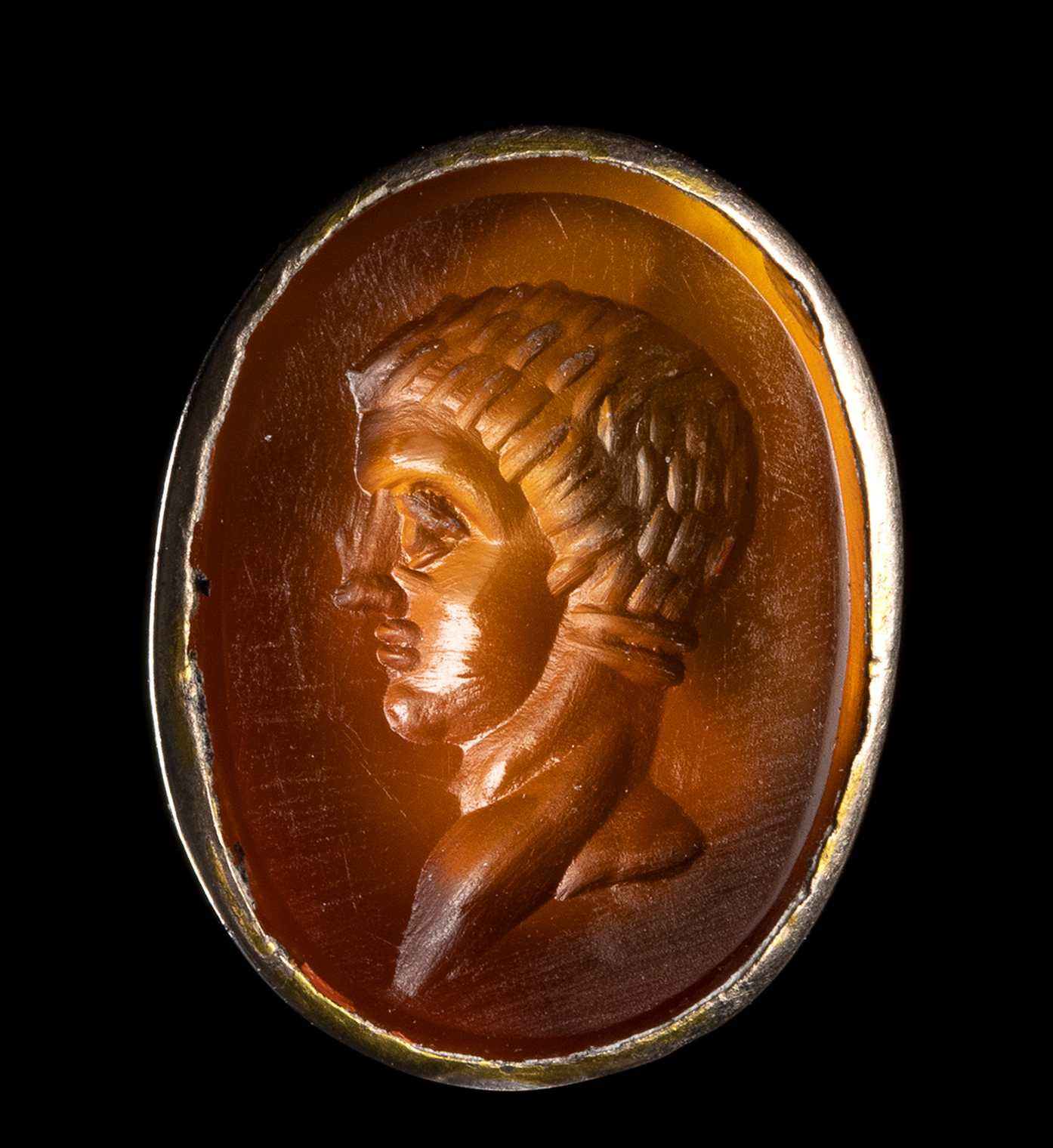 Lotto 187 | A ROMAN CARNELIAN INTAGLIO SET IN A GOLD FRAME. MALE PORTRAIT.