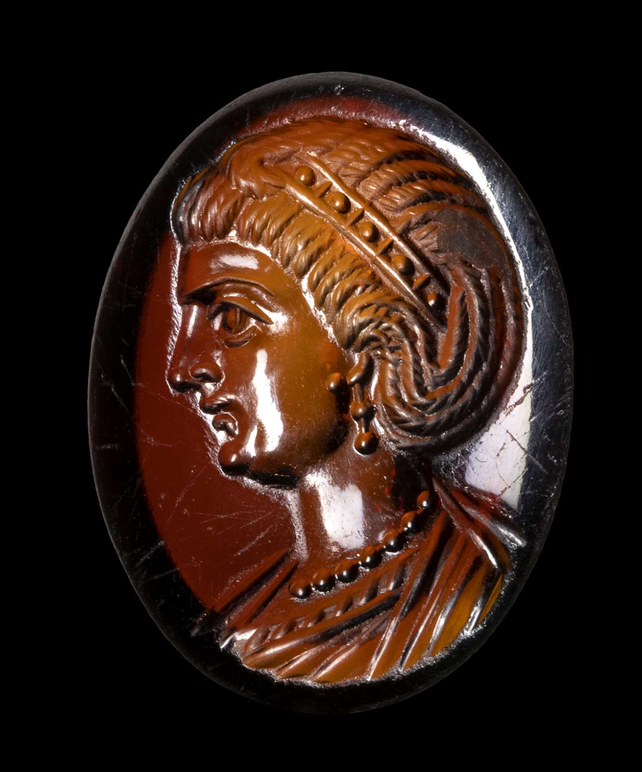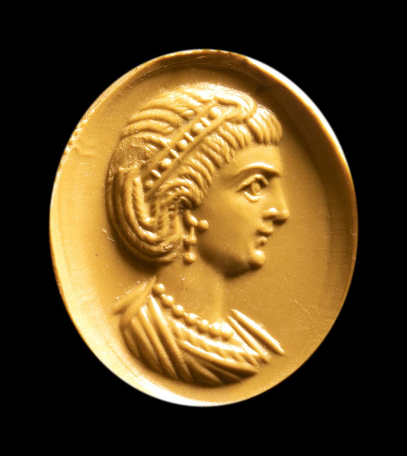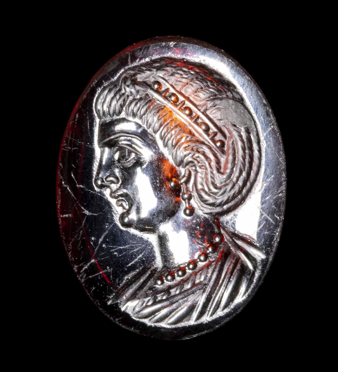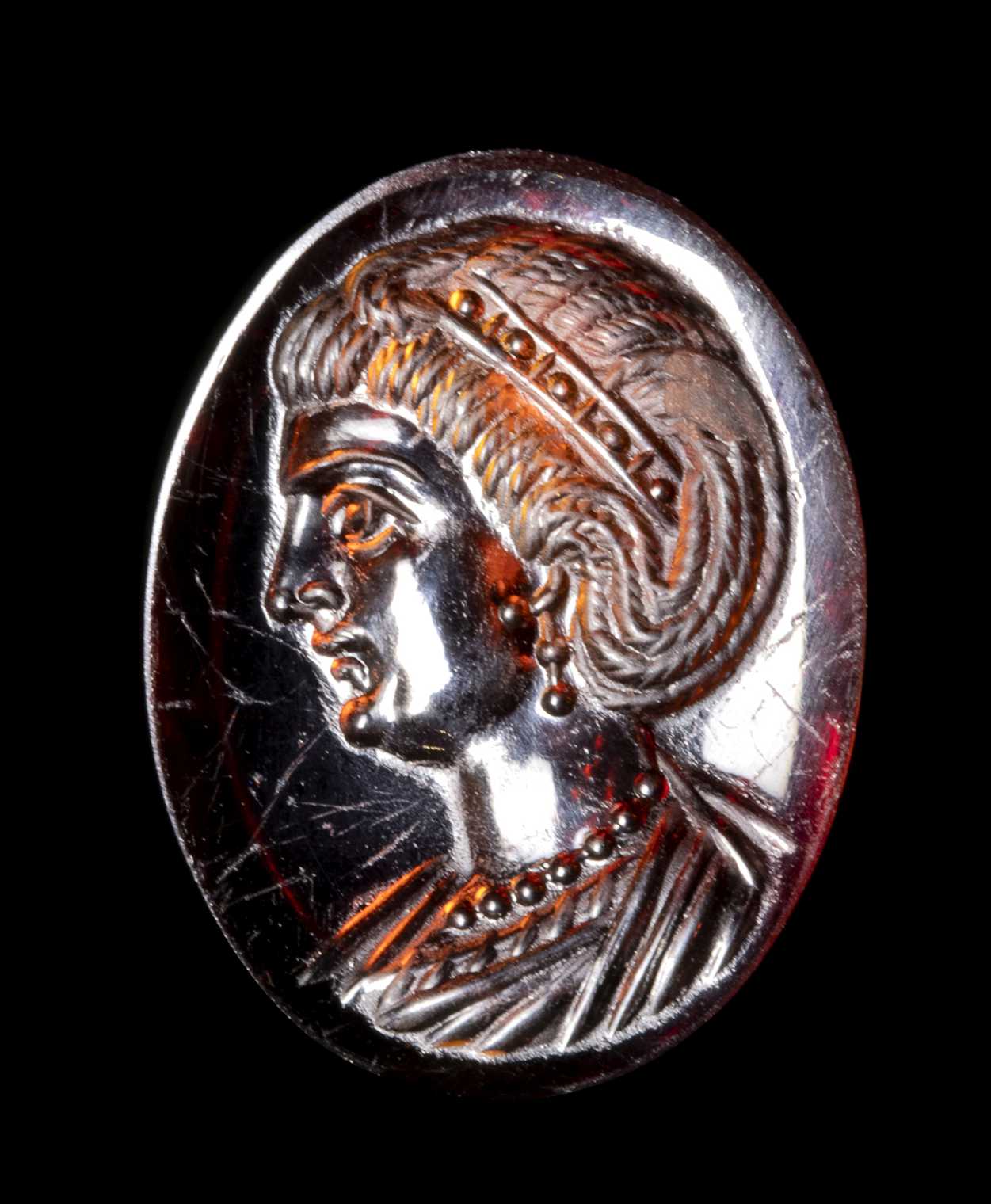 The portrait is facing left. She is characterized by elaborate hair, with a group of braids that goes down the nape of the neck going up to the ear; the other hair is pulled back and held by a diadem with pearls. The woman wears double pearl earrings and a precious pearl necklace. The bust is tunicated. The profile shows a straight and prominent nose, a small mouth, a small and rounded chin, a large eye. The anatomical details of the face and hair are certainly referable to a portrait of an empress of the late Roman period. The technical execution is very refined. The portrait is executed with great art, worthy of a commission from the imperial family. Even the choice of stone, a splendid, very thin garnet, with a concave back, can be attributed to a top-level atelier. Wear marks. The portrait approaches the effigies of Theodora. The empress Flavia Maximiana Theodora (c. 275 – before 337) had been married to the emperor Constantius I ‘Chlorus’ (A.D. 305-306). Her coin portraits become more elaborate over time, with the bust adorned with a necklace and a more elaborate hairstyle. A certain resemblance is also recognizable with the portraits of Fausta, the ill-fated wife of Constantine I 'the Great' (A.D. 307-337), and of Flavia Julia Helena Augusta (c. AD 246/248– c. 330) mother of Emperor Constantine the Great.