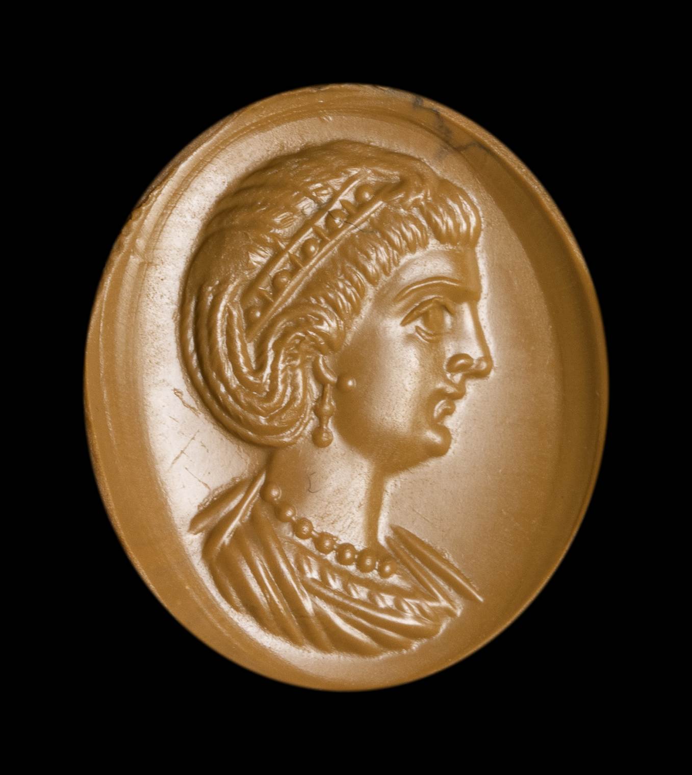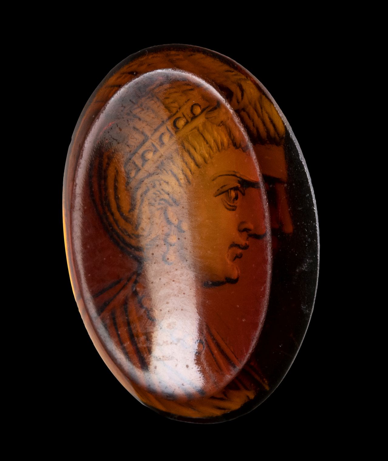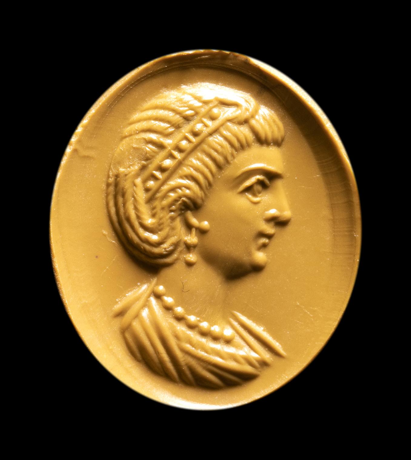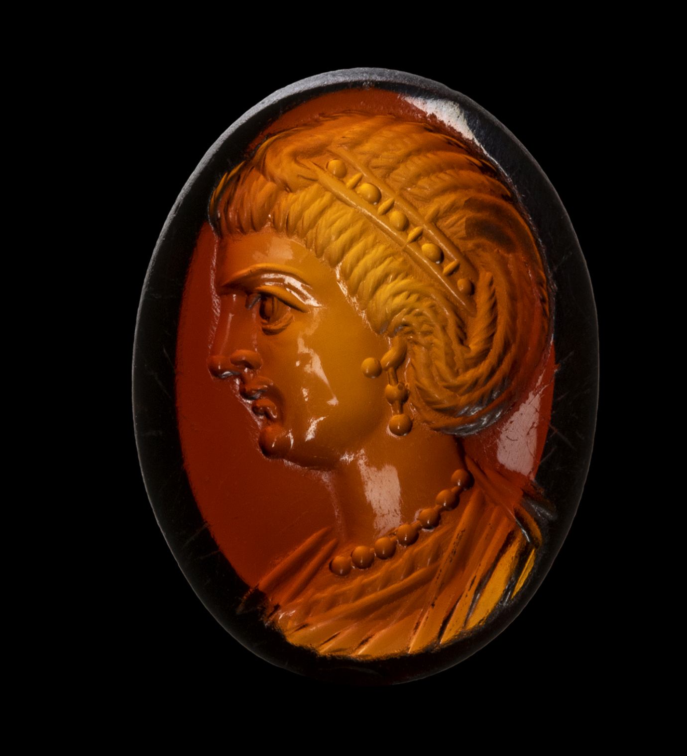 The portrait is facing left. She is characterized by elaborate hair, with a group of braids that goes down the nape of the neck going up to the ear; the other hair is pulled back and held by a diadem with pearls. The woman wears double pearl earrings and a precious pearl necklace. The bust is tunicated. The profile shows a straight and prominent nose, a small mouth, a small and rounded chin, a large eye. The anatomical details of the face and hair are certainly referable to a portrait of an empress of the late Roman period. The technical execution is very refined. The portrait is executed with great art, worthy of a commission from the imperial family. Even the choice of stone, a splendid, very thin garnet, with a concave back, can be attributed to a top-level atelier. Wear marks. The portrait approaches the effigies of Theodora. The empress Flavia Maximiana Theodora (c. 275 – before 337) had been married to the emperor Constantius I ‘Chlorus’ (A.D. 305-306). Her coin portraits become more elaborate over time, with the bust adorned with a necklace and a more elaborate hairstyle. A certain resemblance is also recognizable with the portraits of Fausta, the ill-fated wife of Constantine I 'the Great' (A.D. 307-337), and of Flavia Julia Helena Augusta (c. AD 246/248– c. 330) mother of Emperor Constantine the Great.