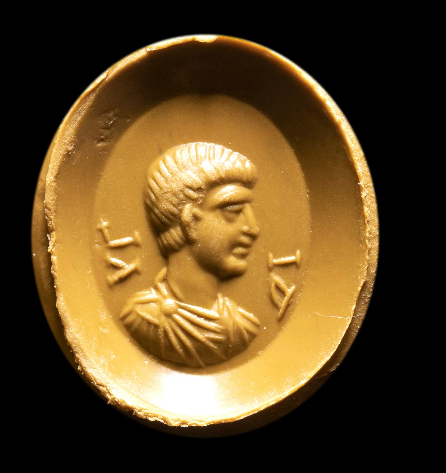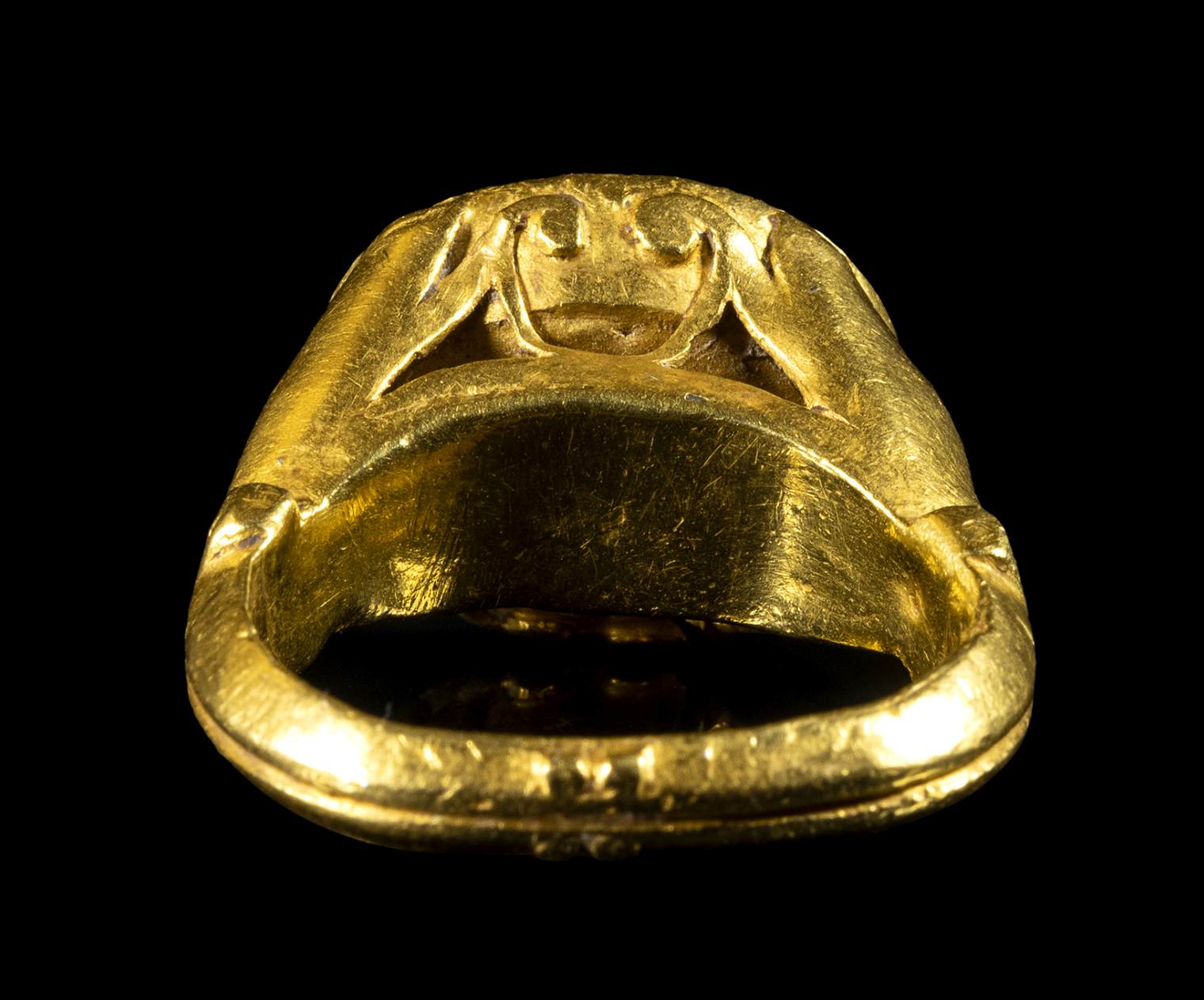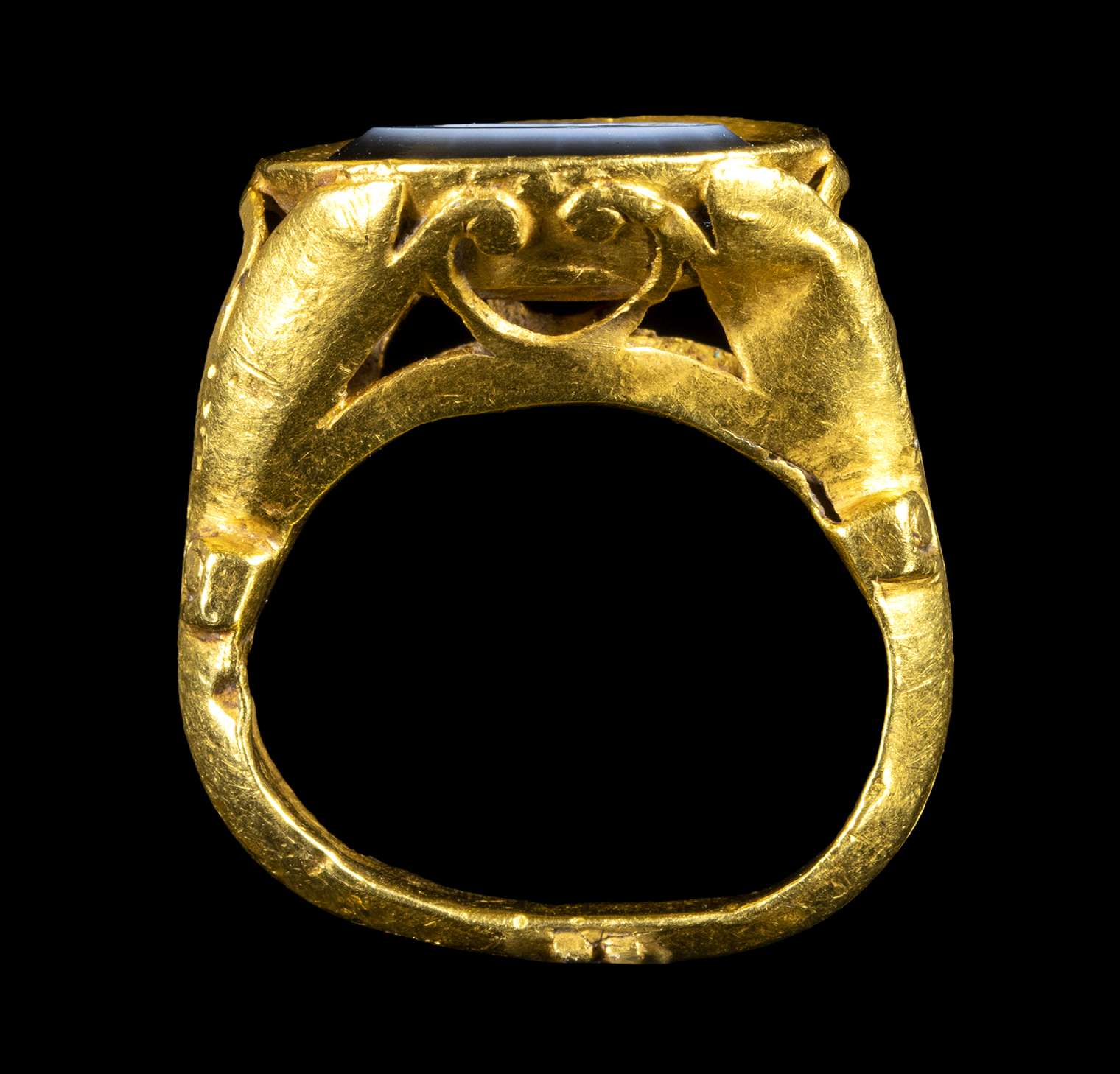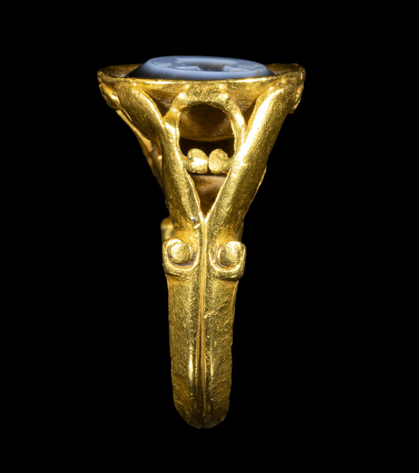 With large hoop with elaborated openwork shoulders with floral and volutes patterns extanding on an oval bezel set with a nicolo intaglio depicting a male bust. The effigy is facing left with draped bust. The portrait is characterized by physionomical and anatomical details typical of Constantine era. The subject is possibly referable to a prince portrait. The four letters surrounding the portrait can be linked to his identity (to be identified). Very good overall condition, slight wear marks and deposits.