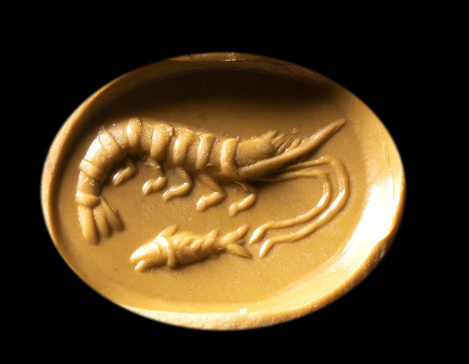 The shrimp facing left, beneath the fish facing right. Slight wear marks.