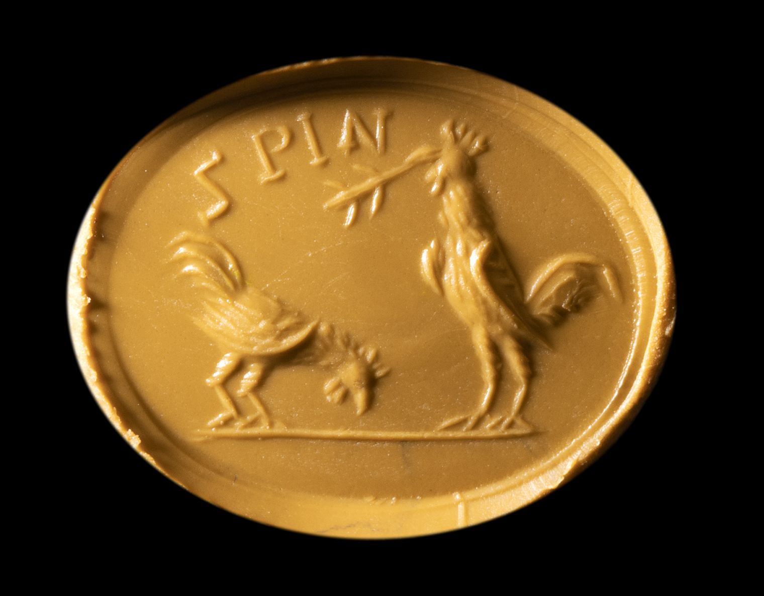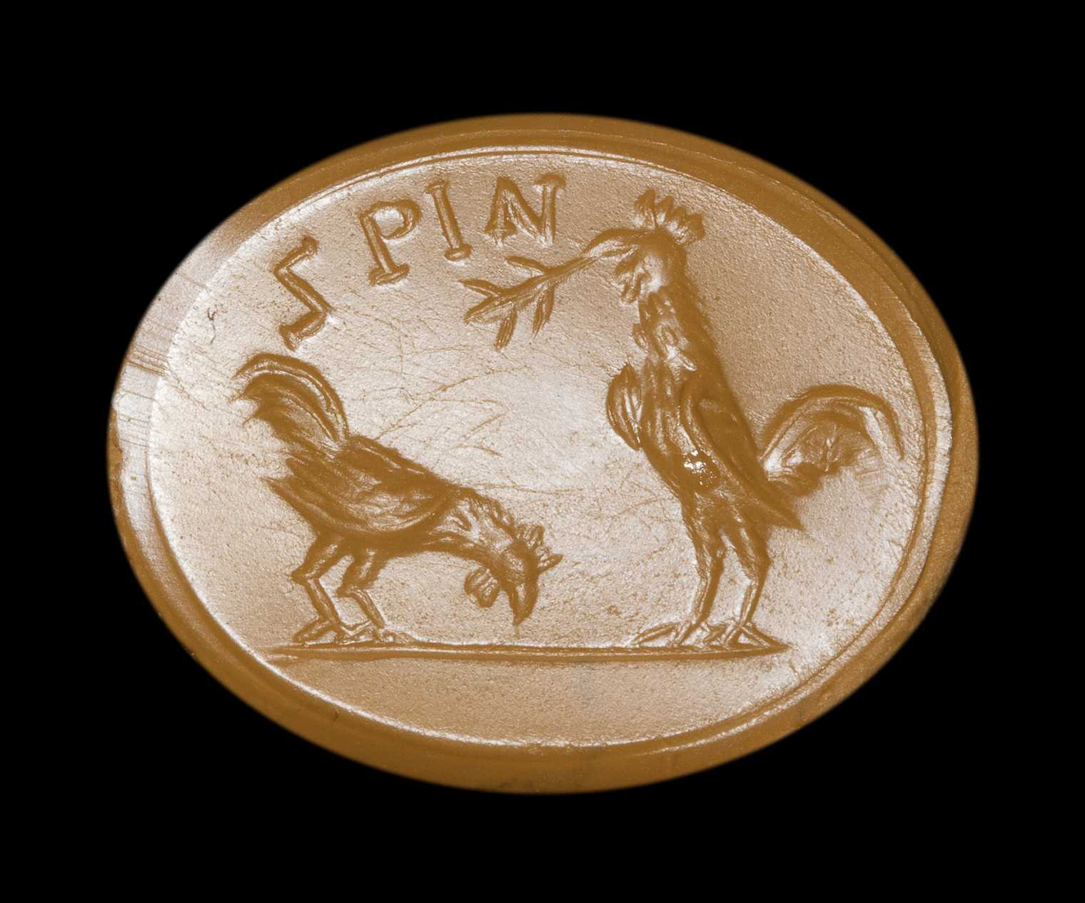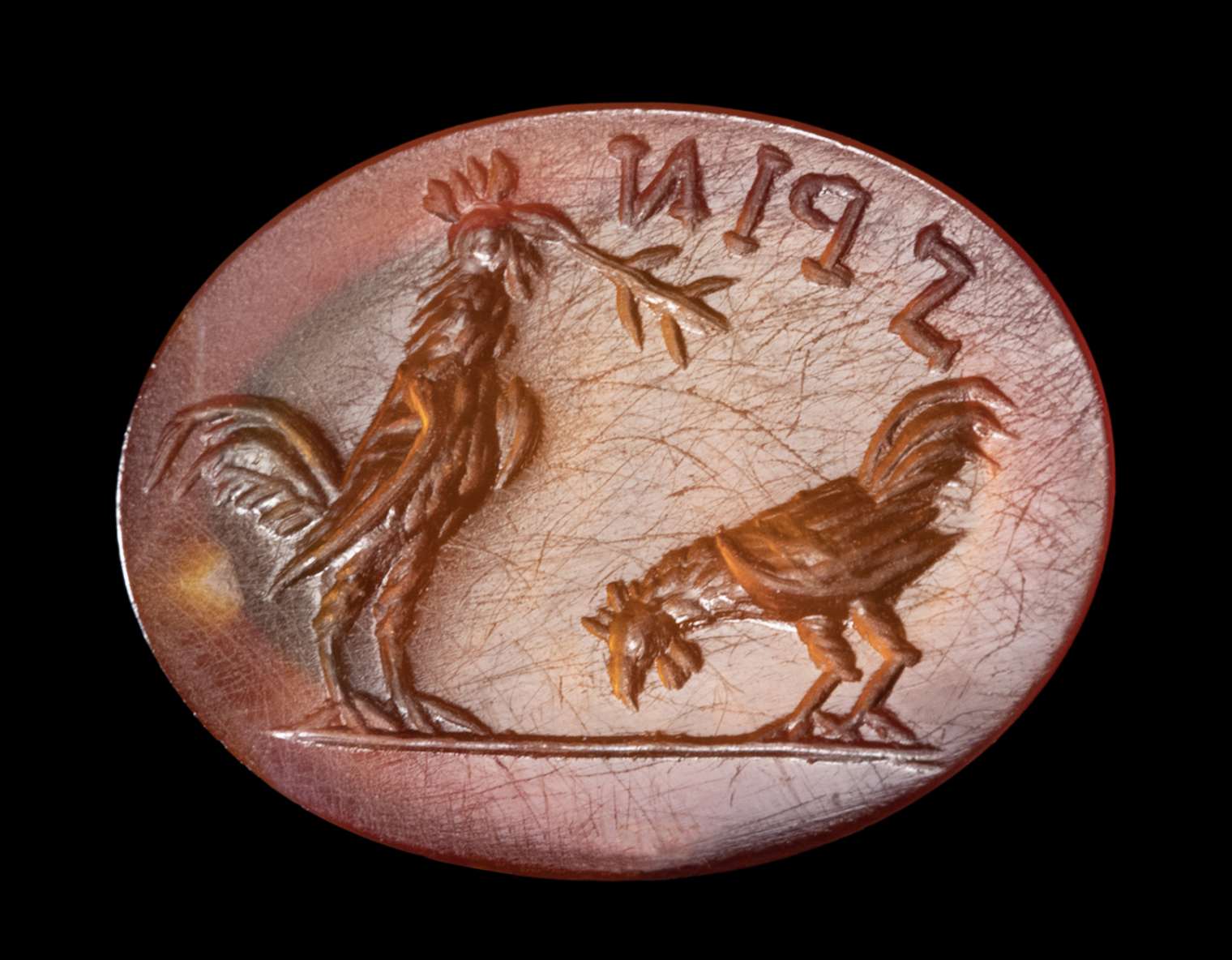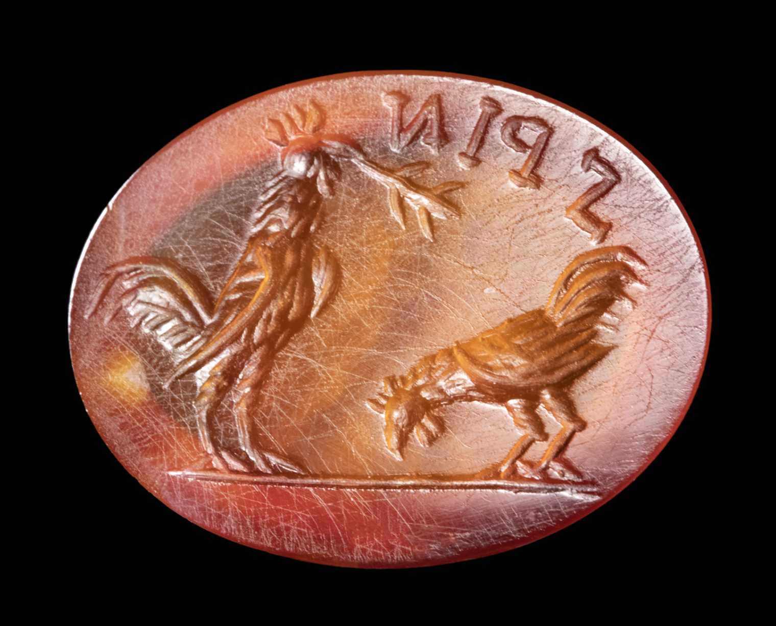 A ROMAN CARNELIAN INTAGLIO. TWO ROOSTERS WITH AN INSCRIPTION.