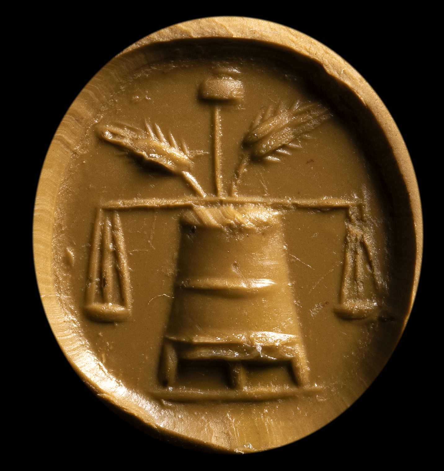 Modius with a poppy flower with two ear of corns and a scale. Groundline. Wear marks.
