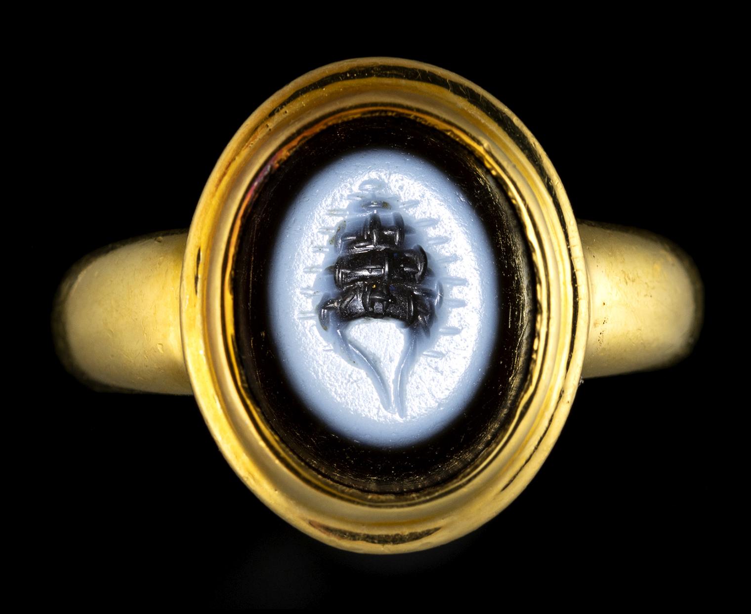 Lotto 243 | A ROMAN NICOLO INTAGLIO SET IN A MODERN SOLID GOLD RING. MUREX SHELL.