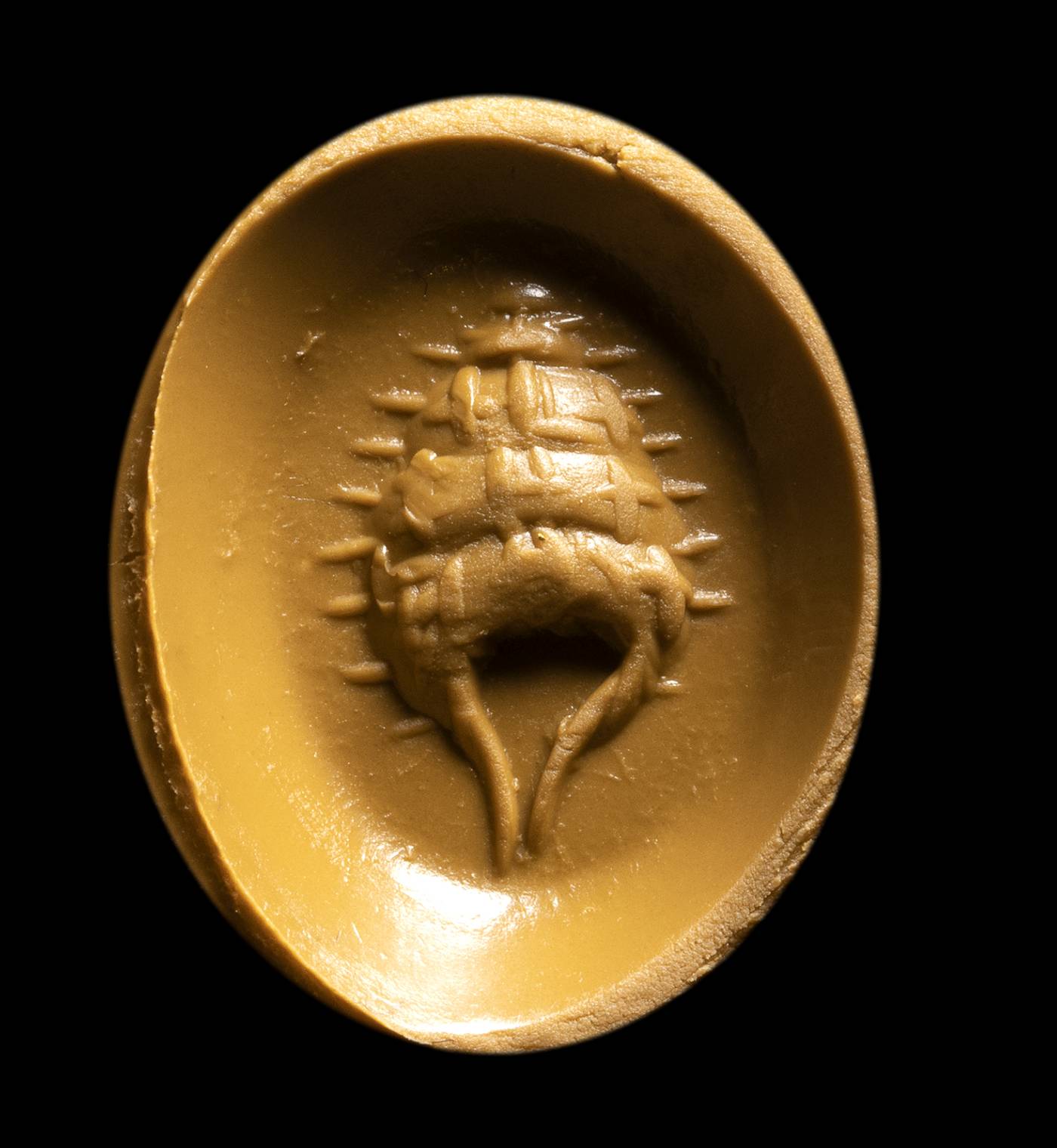 A fine and interesting representation of a spiny murex shell. Wear marks. Mucus from the hypobrachial gland of the murex was used to make purple dye, referred to as Tyrian purple or royal purple, as it was primarly used for dying royal garments. Tyre was the main production centre for purble dye in the Mediterranean.