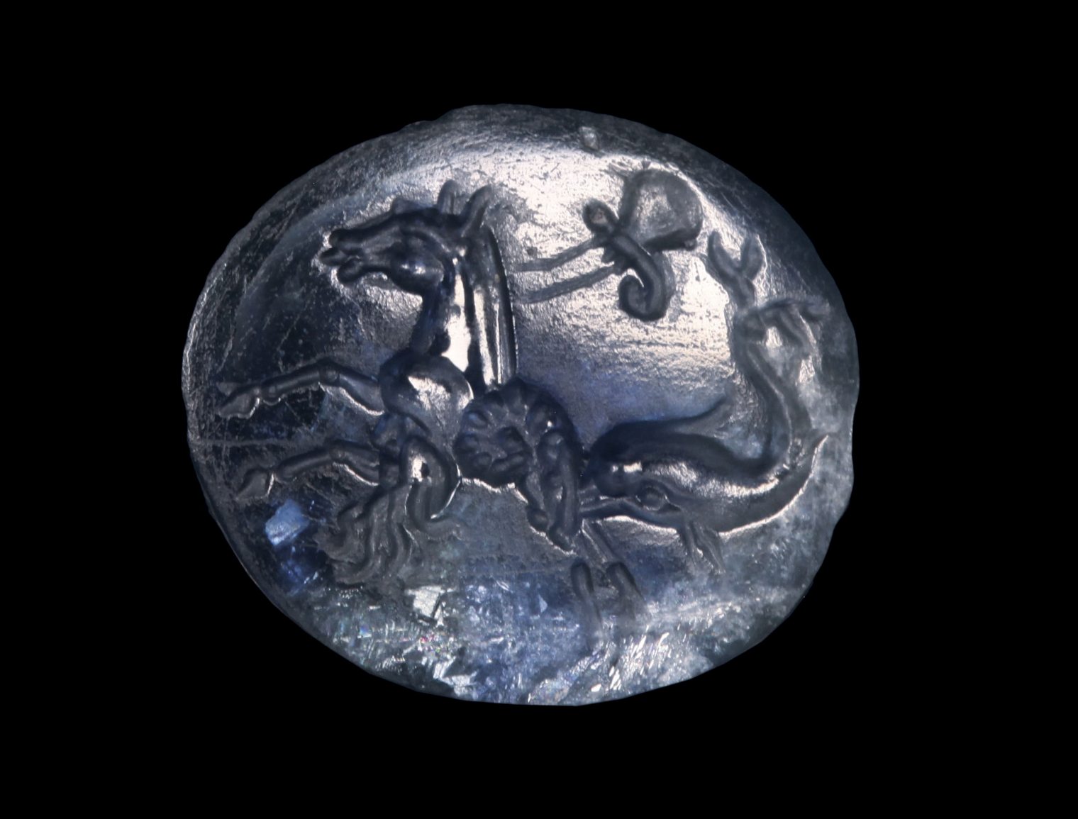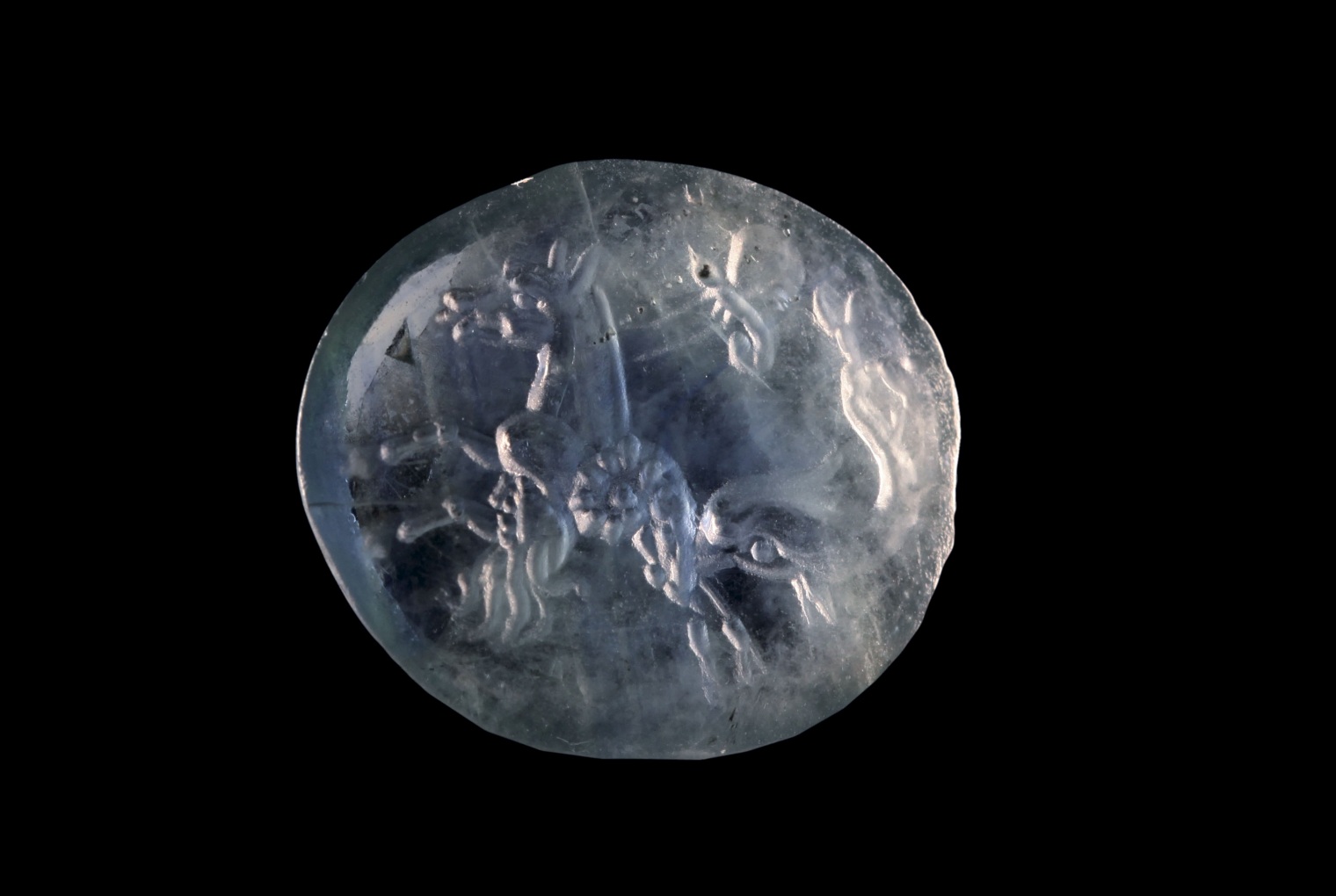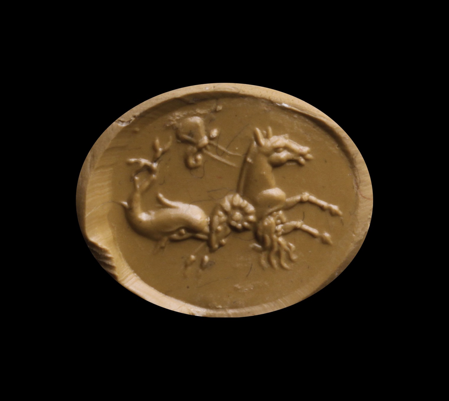 The hybrid creature is composed of a horse protome with a silenus mask on its chest, a ram's head with an ear of corn as its body and a dolphin as an ending. The fantastic creature is guided by a butterfly using reins. The scene is engraved on a natural sapphire which is characterized by thin thickness, almost sharp edges, slightly convex surfaces, beautiful color and polish. The marine subject matches perfectly with the color of the stone. Rare. Minor lacks on the edge and signs of wear.