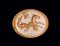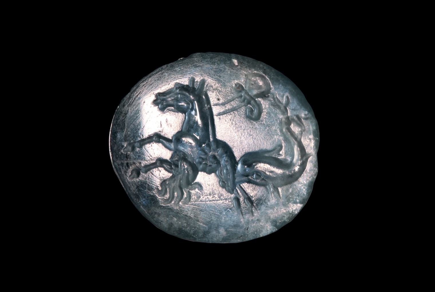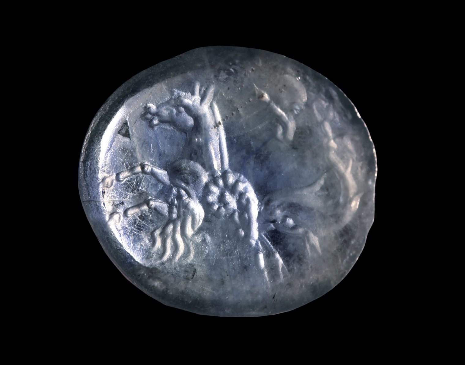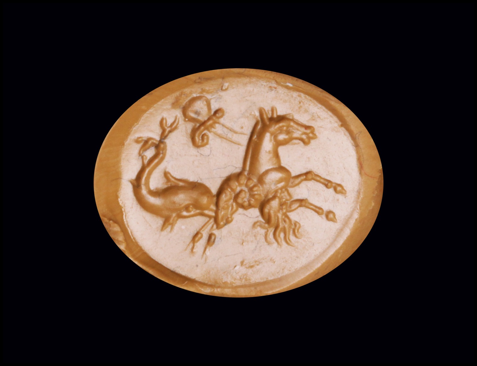 The hybrid creature is composed of a horse protome with a silenus mask on its chest, a ram's head with an ear of corn as its body and a dolphin as an ending. The fantastic creature is guided by a butterfly using reins. The scene is engraved on a natural sapphire which is characterized by thin thickness, almost sharp edges, slightly convex surfaces, beautiful color and polish. The marine subject matches perfectly with the color of the stone. Rare. Minor lacks on the edge and signs of wear.