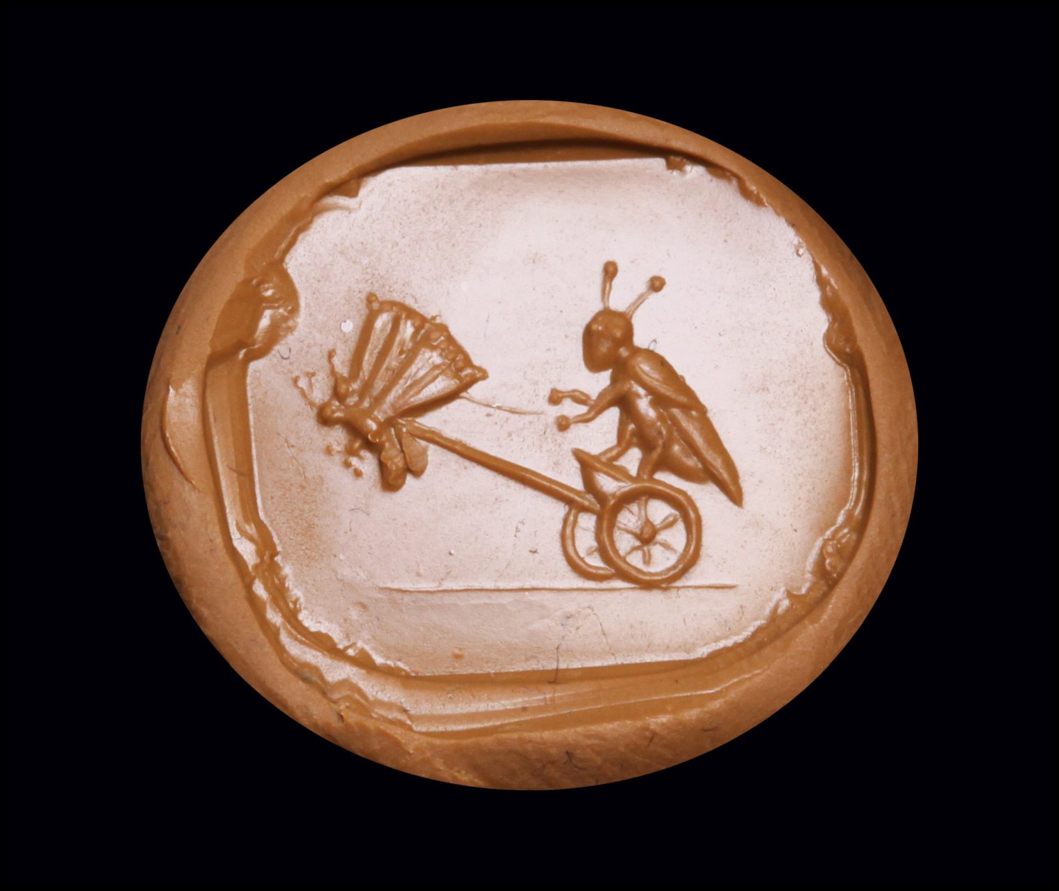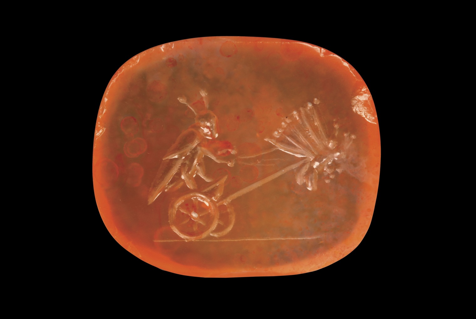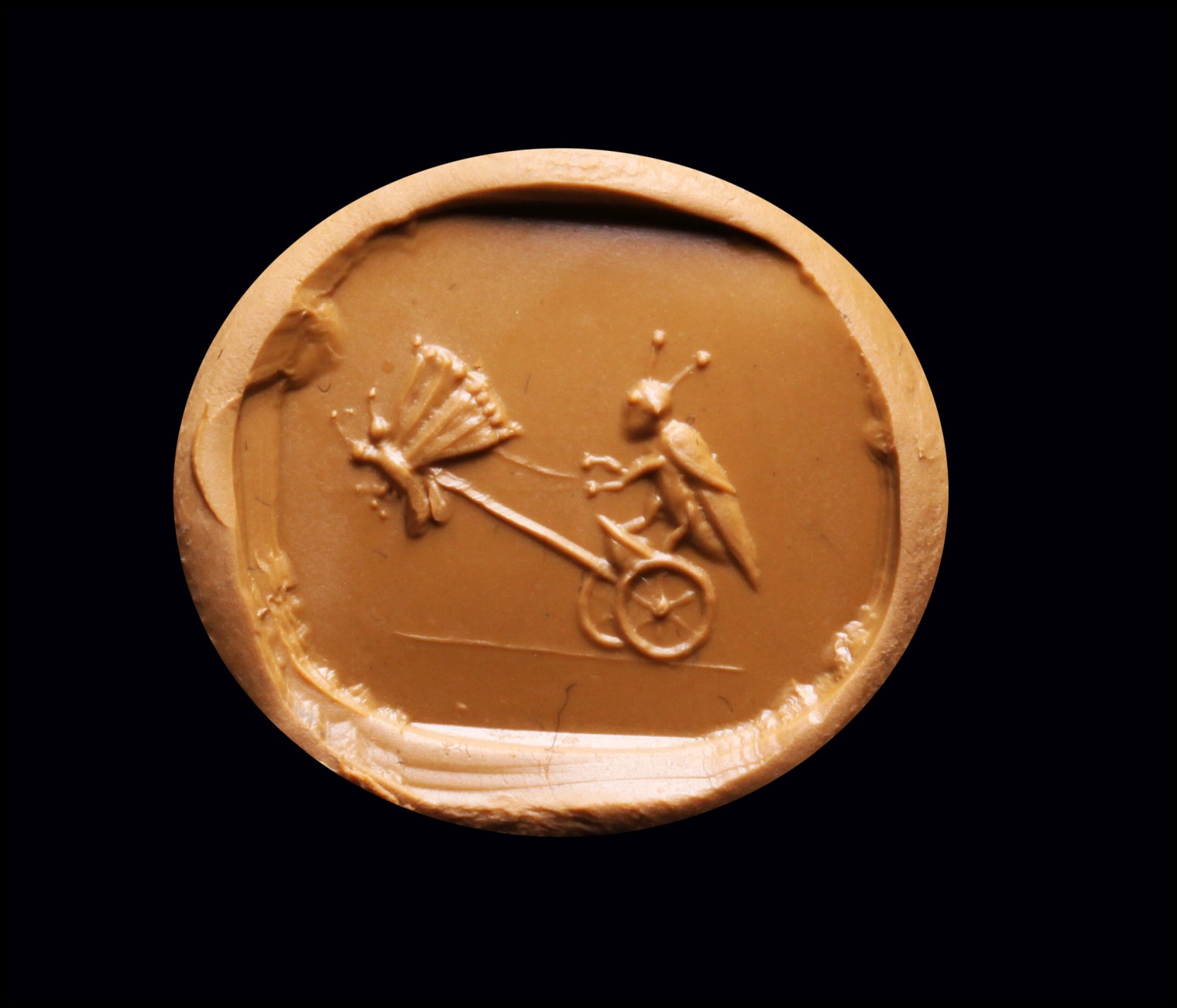 A ROMAN CARNELIAN INTAGLIO. GRASSHOPPER DRIVING A CHARIOT DRAWN BY TWO BUTTERFLYES.