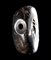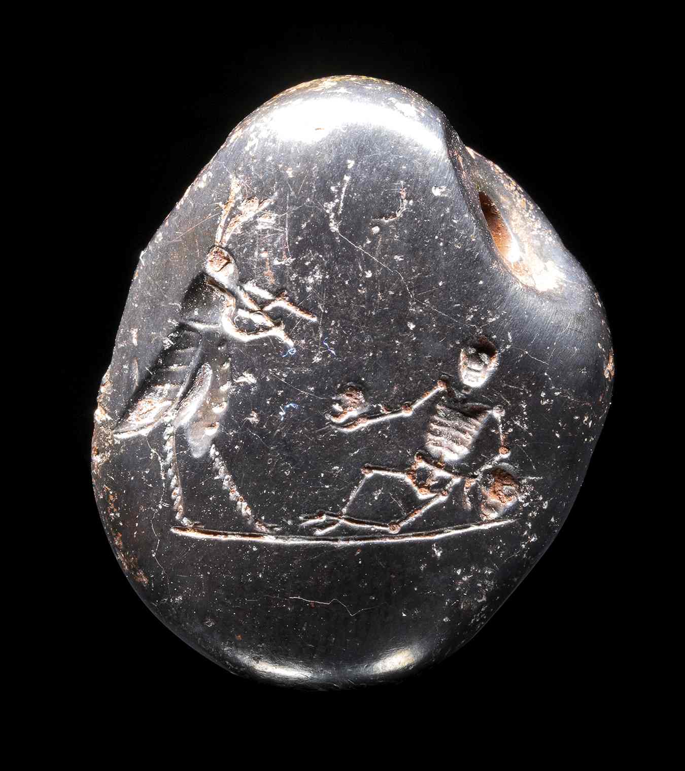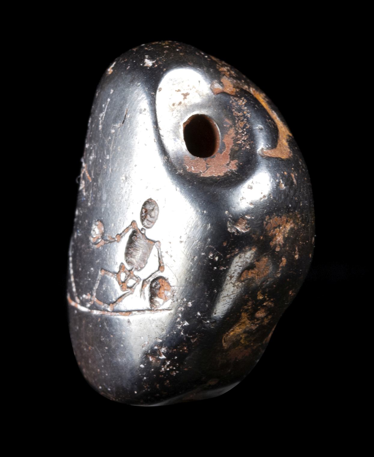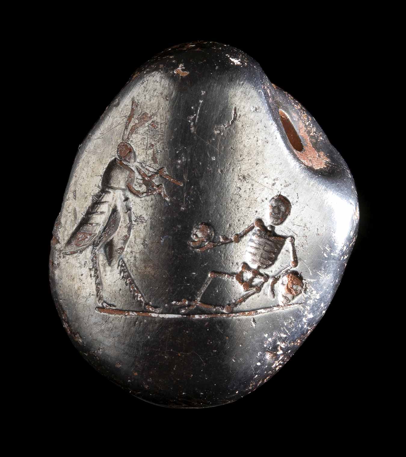 Irregular in shape and pierced lengthwise this bead is engraved with a particular design; a grasshopper standing right playing the double flute to a skeleton leaning on the ground with a skull in his right hand and another one beneath his left elbow. Groundline. The playing grasshopper representing life is thus confronted with the Death symbolized by the skeleton. This engraved bead is an allegory of the fleetingness of life.