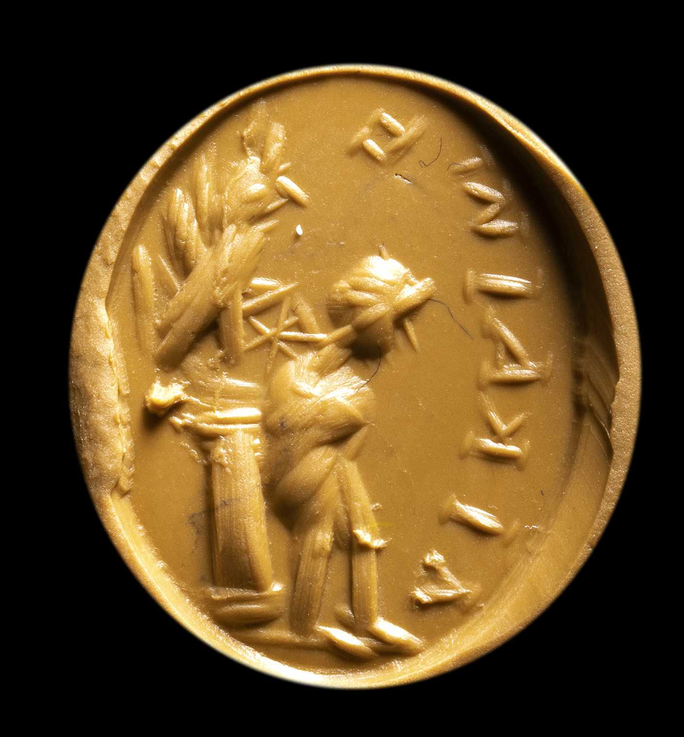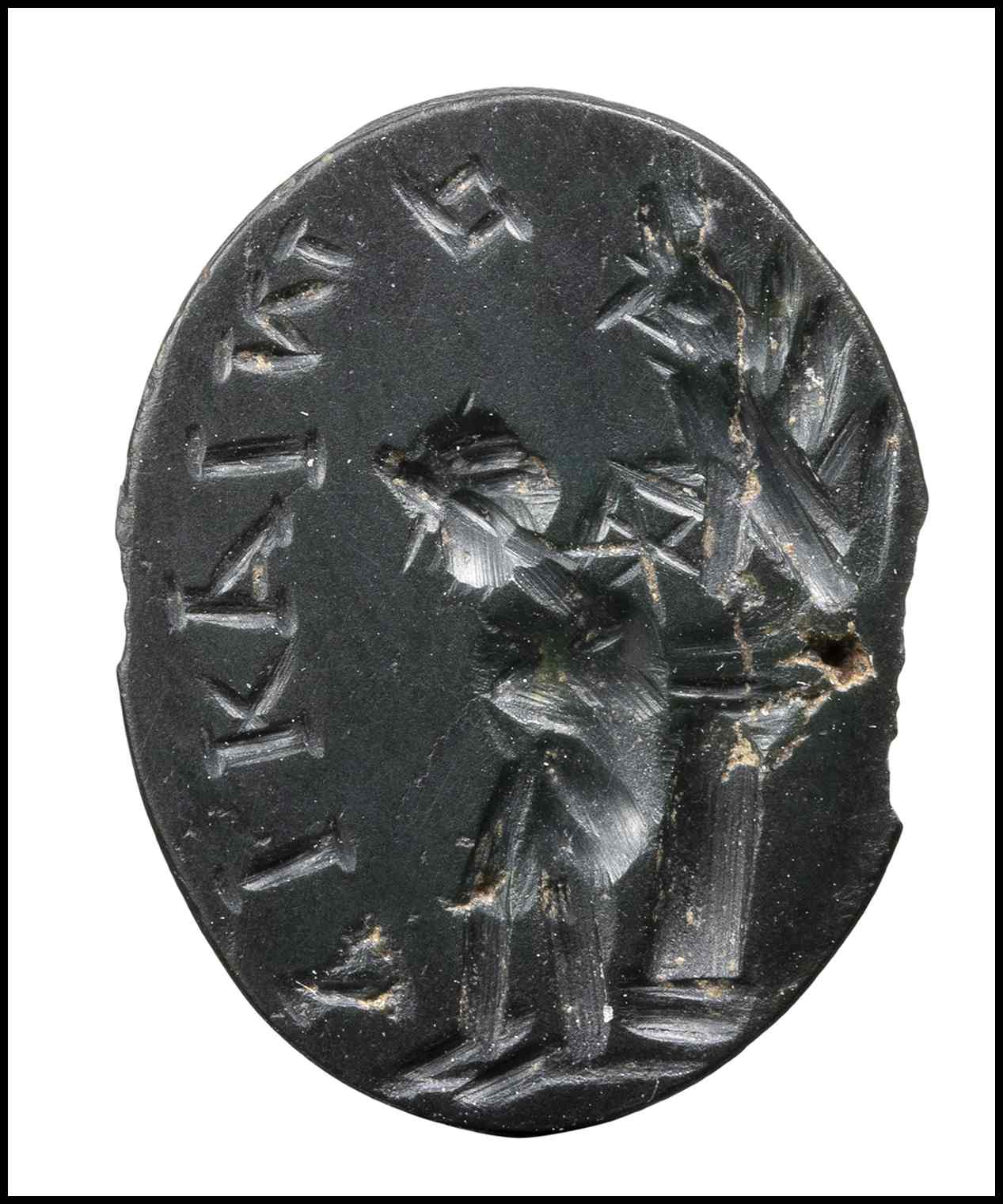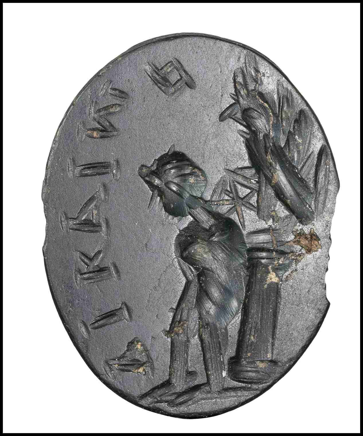 Eros is facing left, tied to a column with the inscription "ΔΙΚΑΙΟΣ", meaning "just deserved". A griffin with the wheel (the Nemesis) over the column. Magical stone referred to the allegory of Love and the Revenge. Missing on the edge. Wear marks.