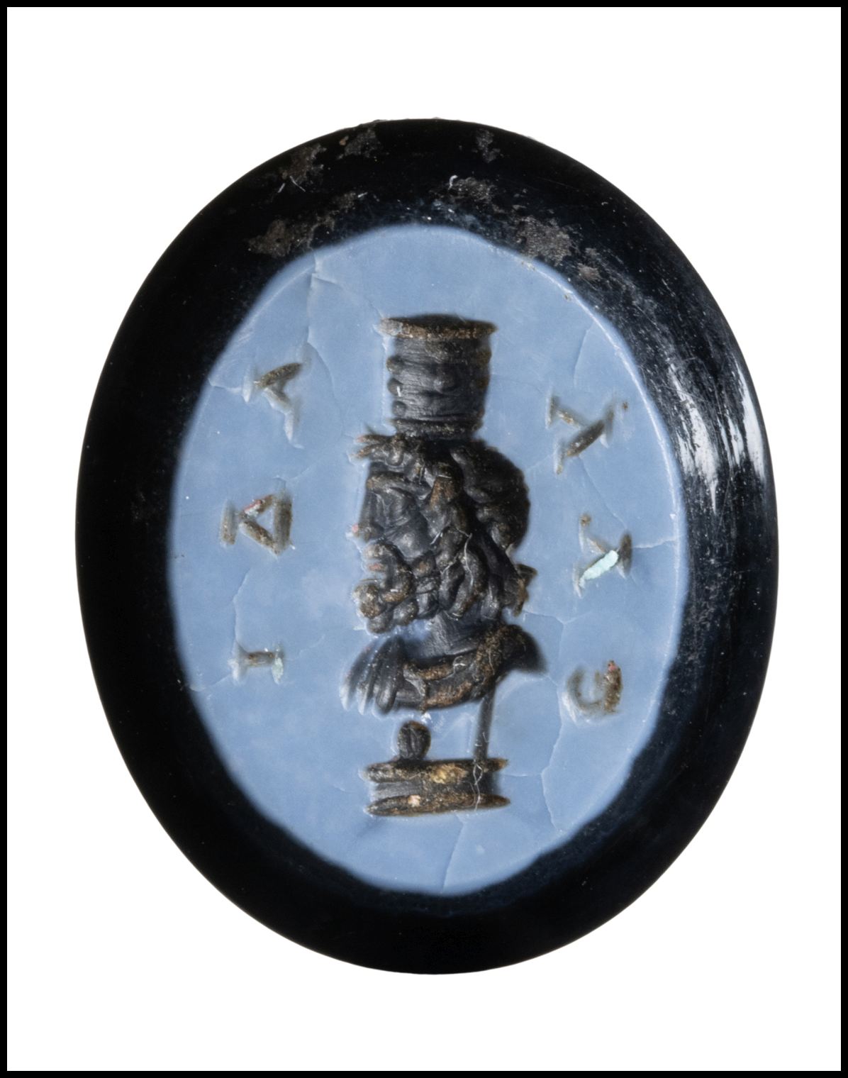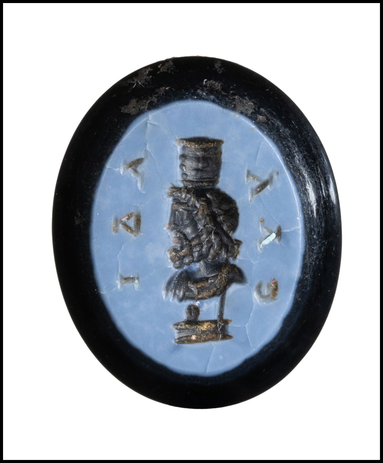 A ROMAN NICOLO INTAGLIO. BUST OF SERAPIS WITH A GREEK INSCRIPTION.