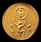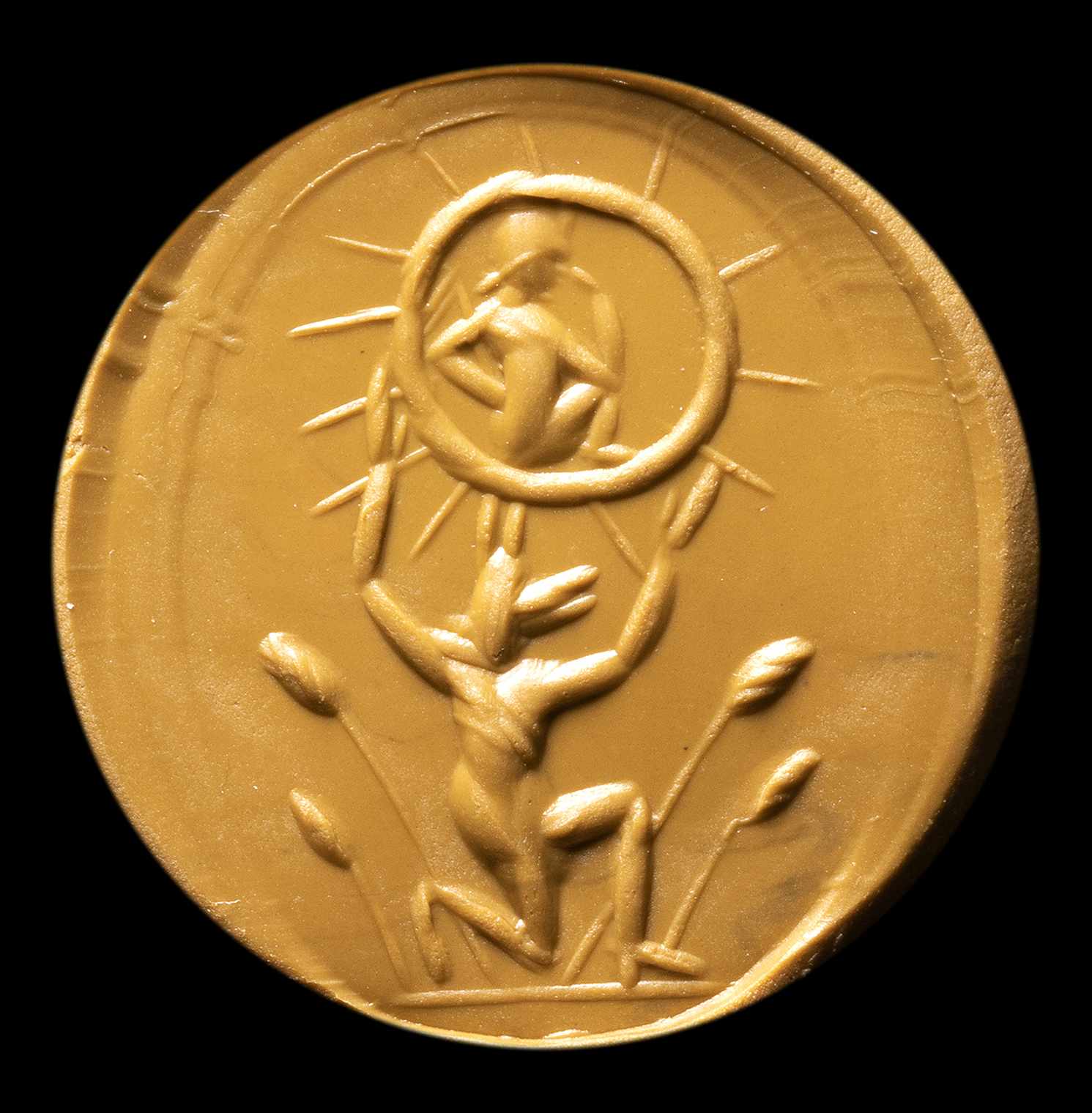 The child god is seated inside a sun hold by a kneeled Anubis, arms upraised. In the field, lotus flowers. Groundline.