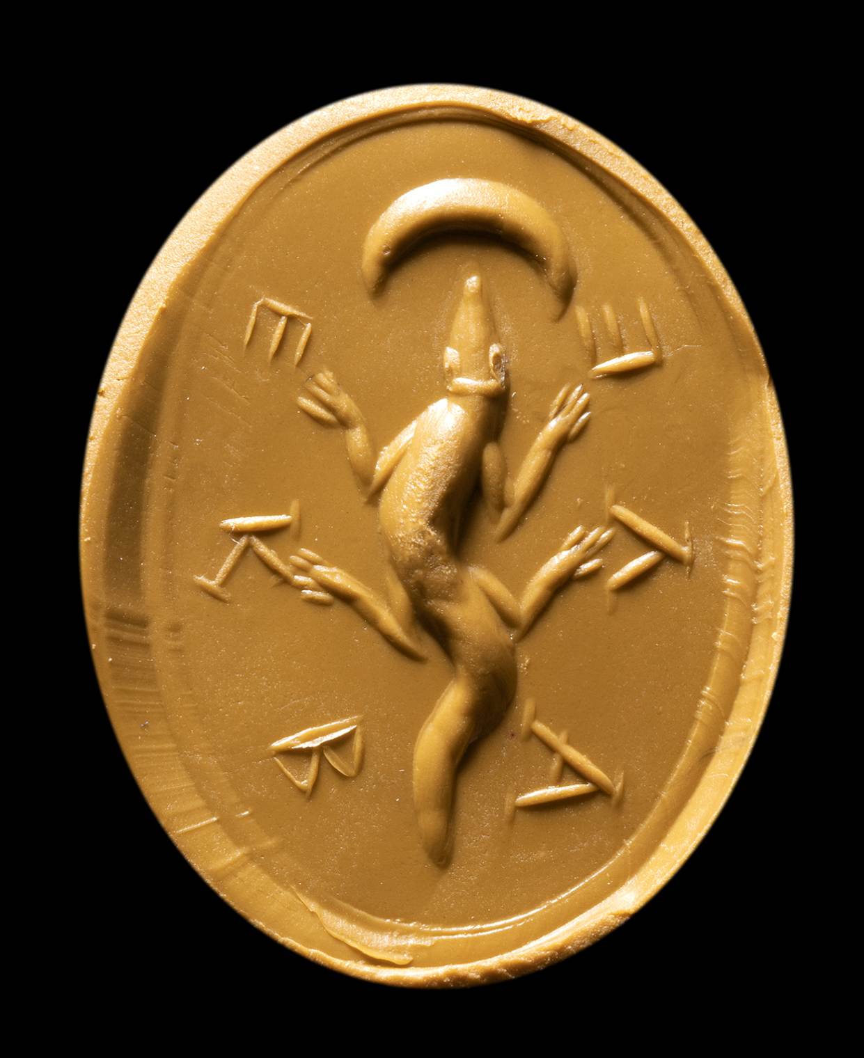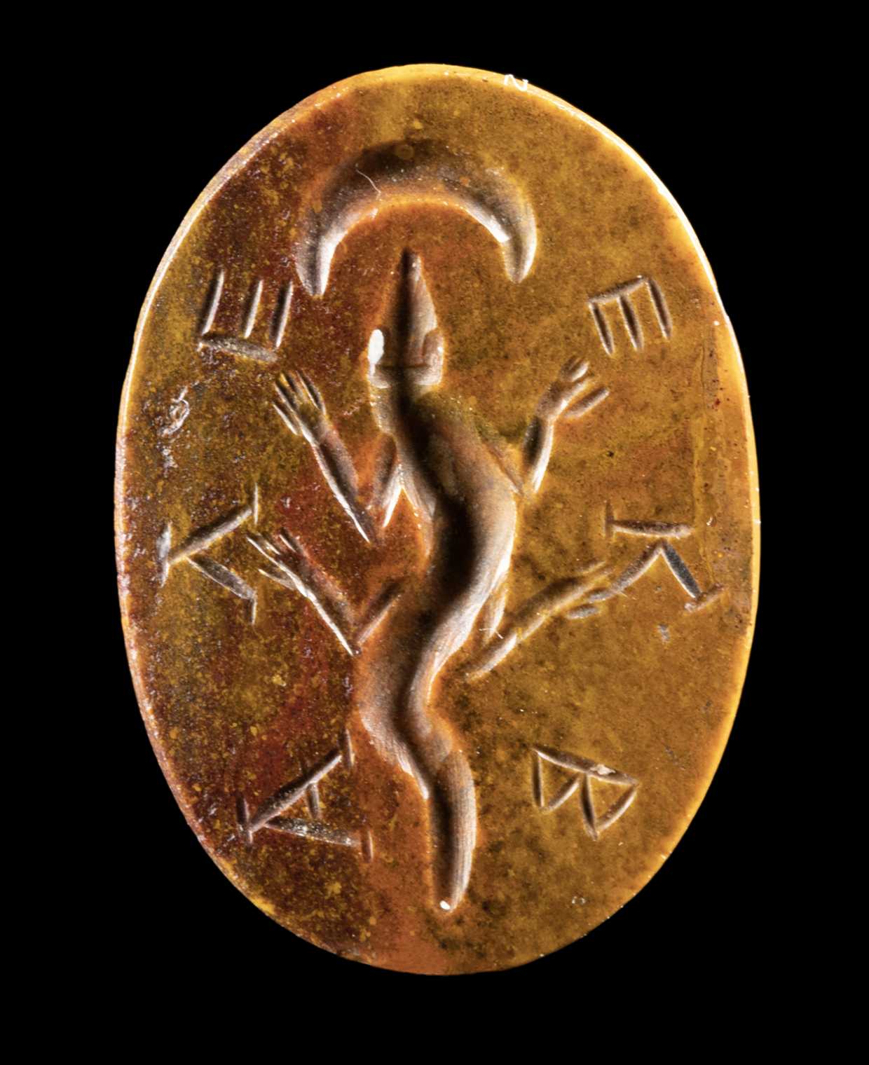 A ROMAN GNOSTIC YELLOW JASPER INTAGLIO. LIZARD WITH CRESCENT MOON AND LETTERS. INSCRIPTION.