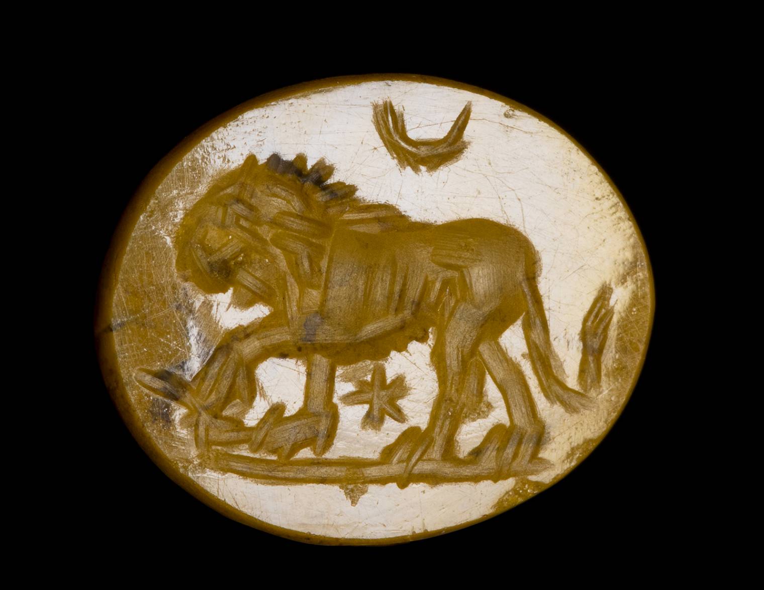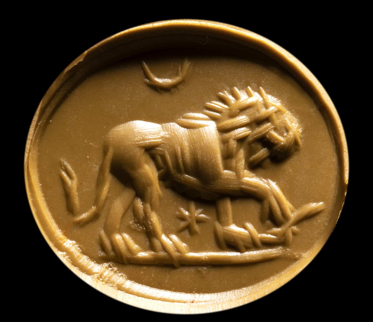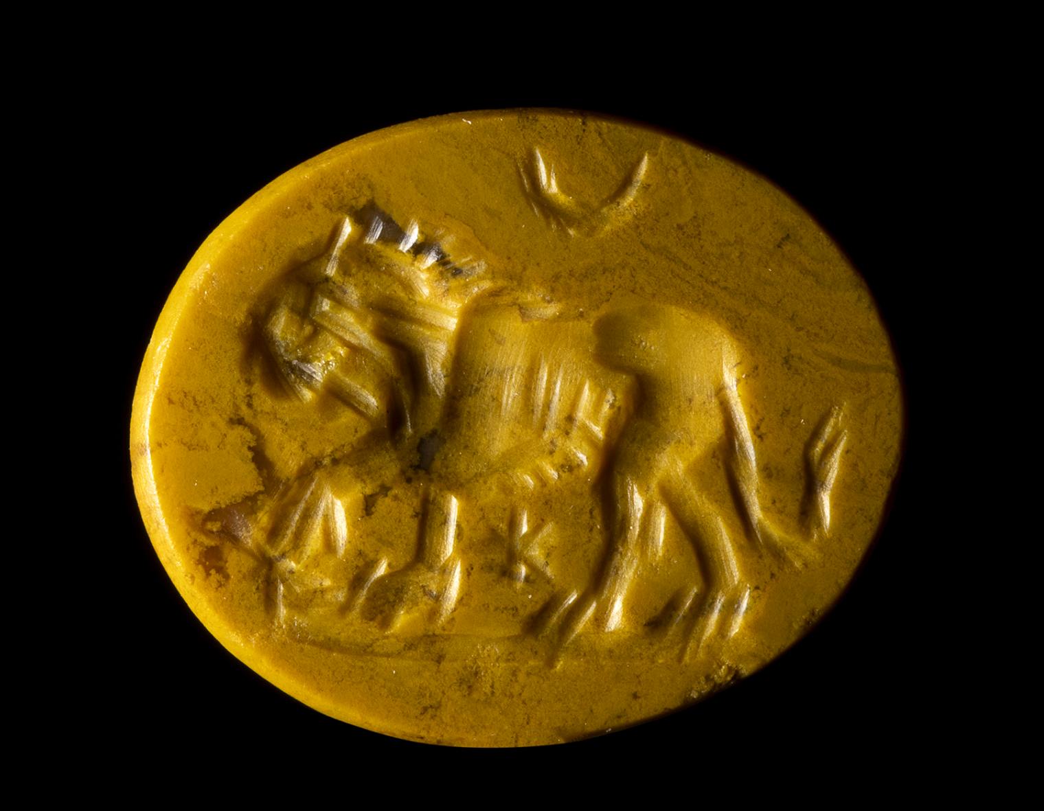 A ROMAN YELLOW JASPER INTAGLIO. LION WITH ASTROLOGICAL ATTRIBUTES.