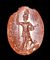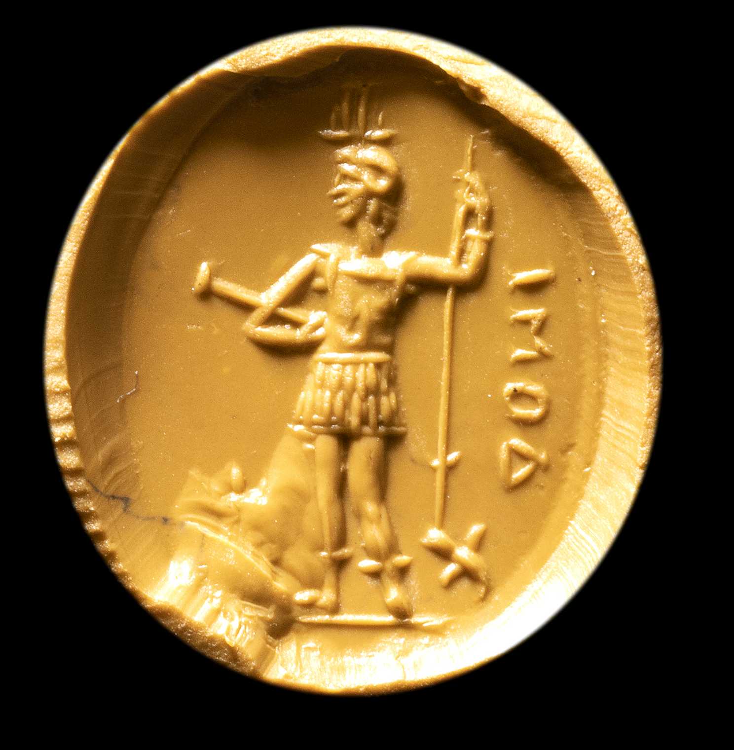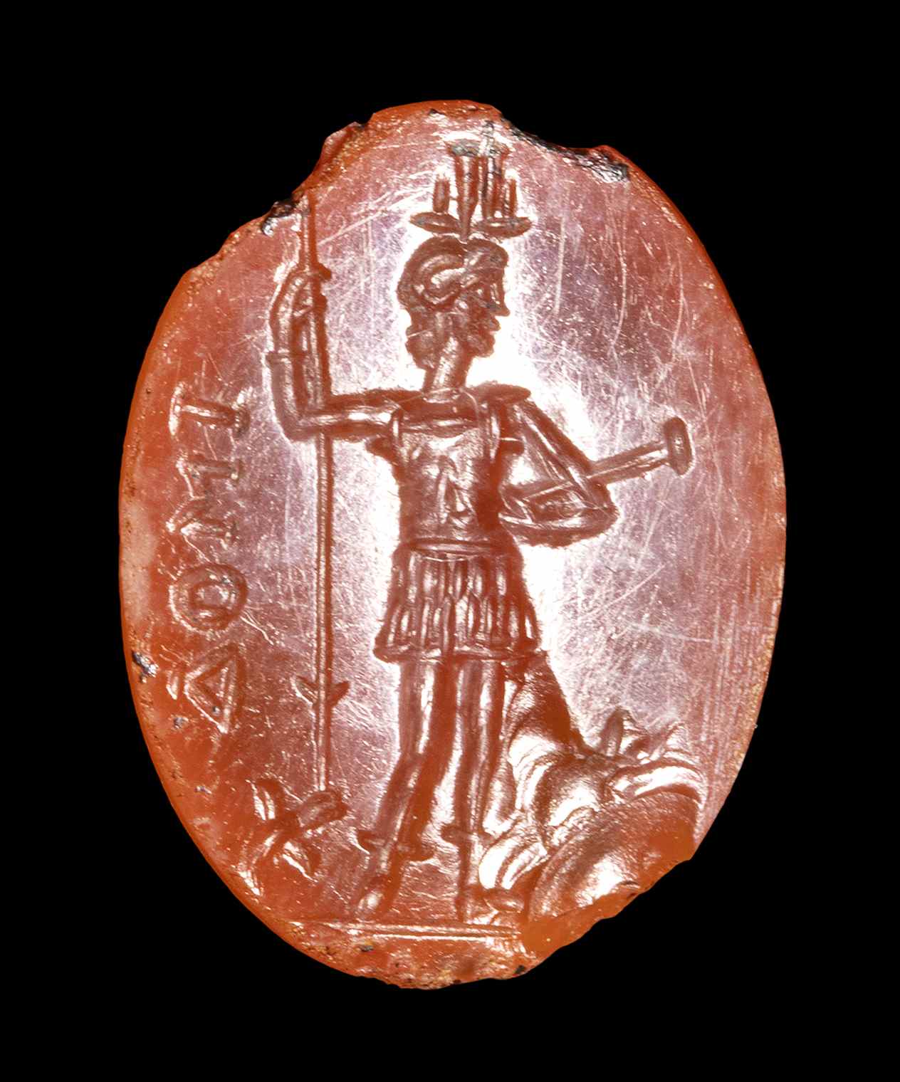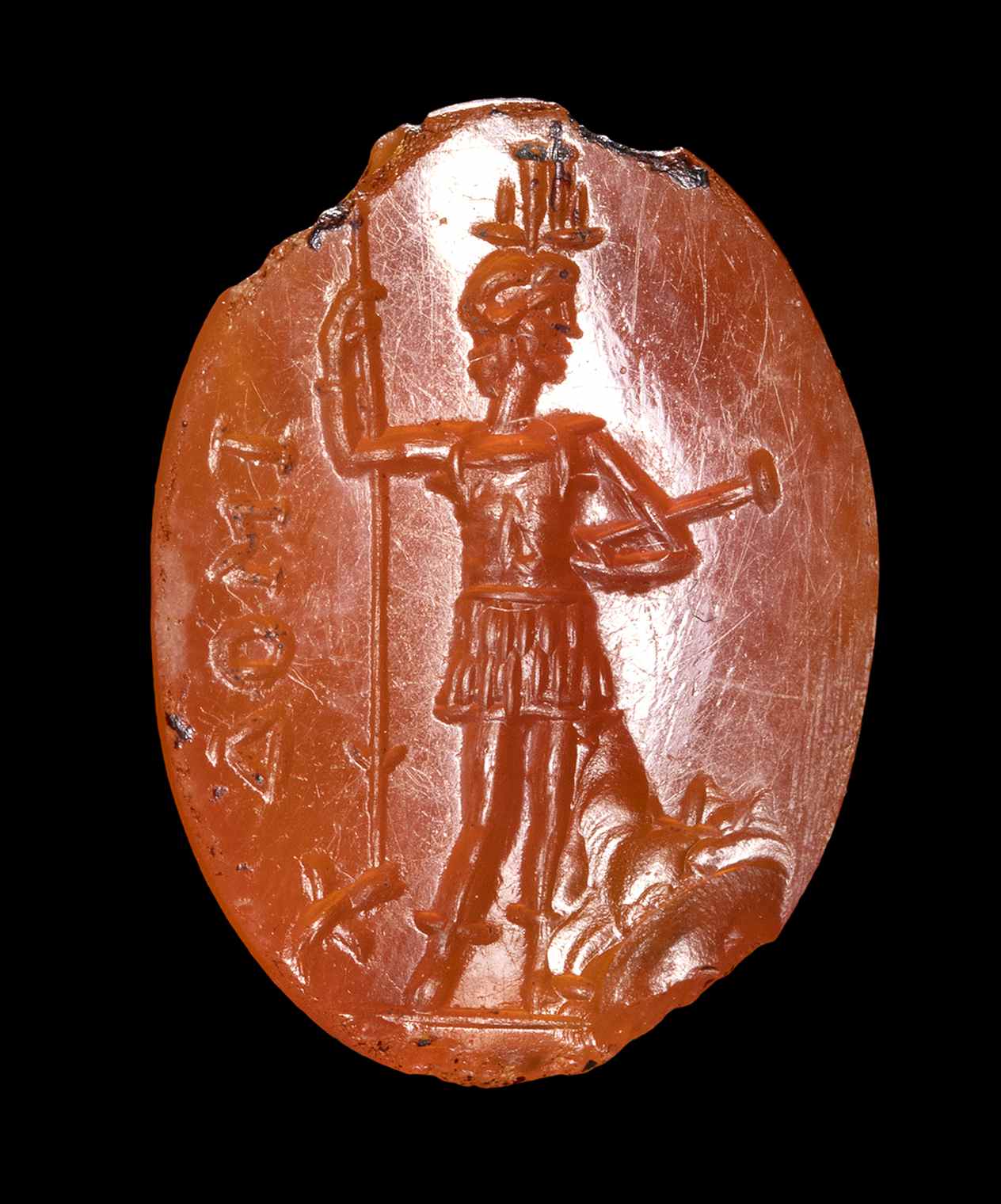 The god is standing front, his head facing right. He wears the atef crown, Amon's horns and an armour. In his right hand, he holds a spear, meanwhile in the left, a weapon (probably). In the field, "ΔΟΜΙ". Groundline. Wear marks. Chips and missing on the edge.