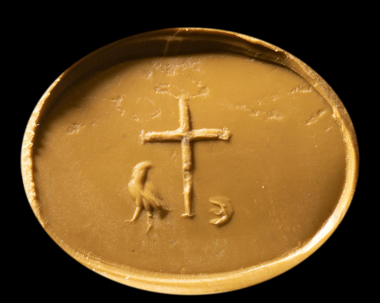 In the center the cross, on the left the letter "E", on the right an eagle. Traces of deposits on the surface of the stone. Intact. Wear marks.