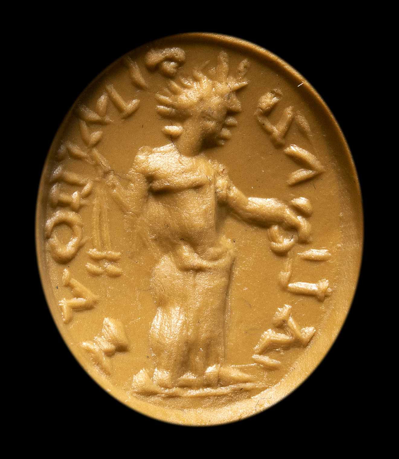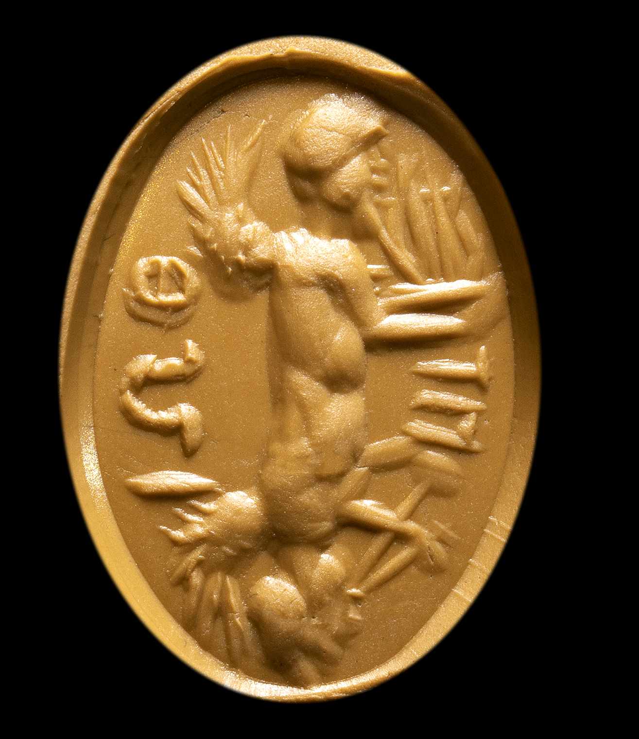 A green jasper intaglio, with a standing figure surrounded by a magical inscription; a larger carnelian intaglio with a conjoined double bust of Eros playing the lyra and the double aulos, with a greek inscription. Wear marks.