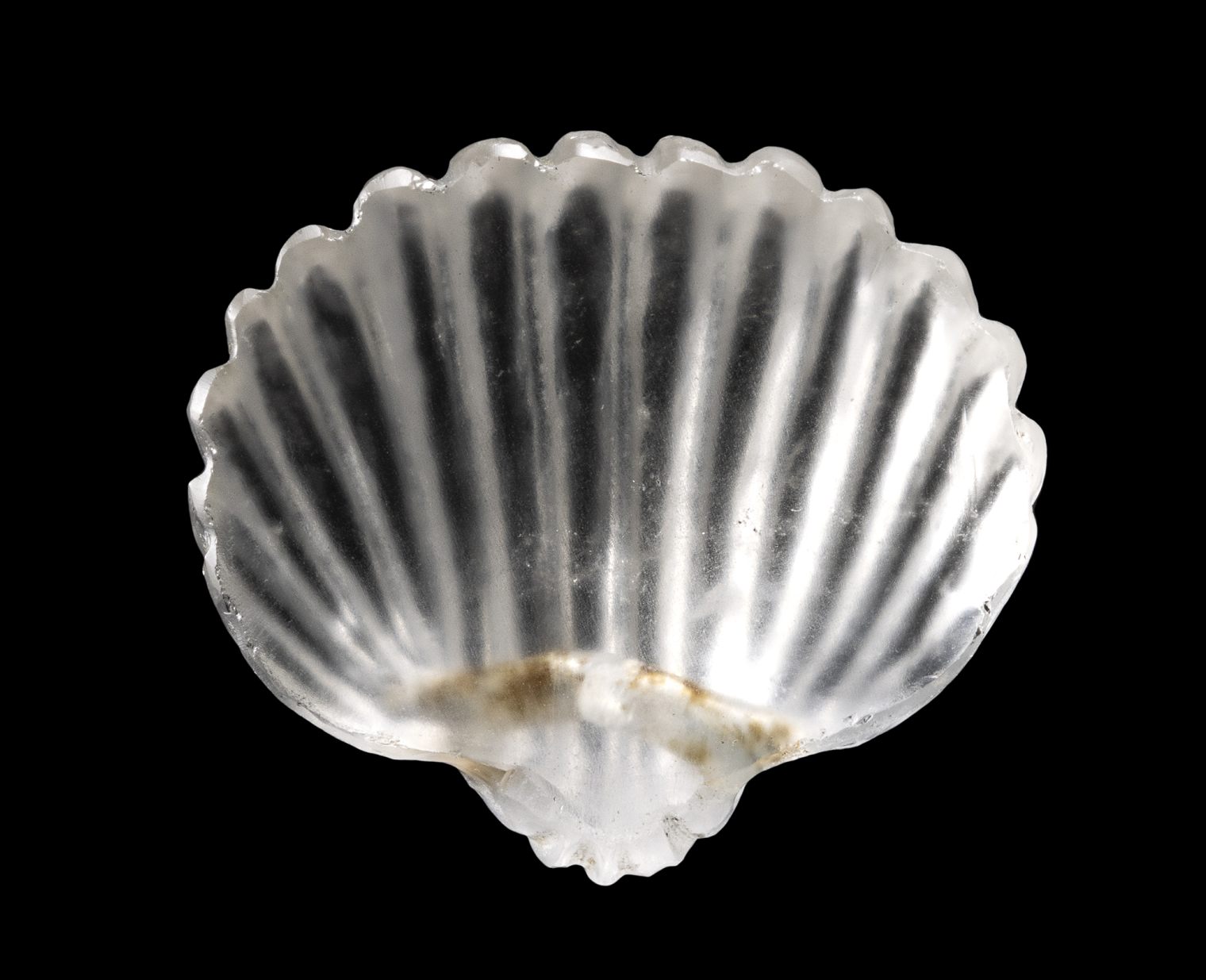 Decorative element in the shape of a shell characterized by radial ribs (of the type Acanthocardia tuberculata, bivalve). Through hole with deposits. Slightly concave inside. Wear marks. These shells in rock crystal are usually considered playing pieces (game counter), even if it is not fully proven, otherwise funerary ex voto later used as a pendant (through hole). Otherwise as toiletry elements to contain the make-up for the funerary equipment. Rare.