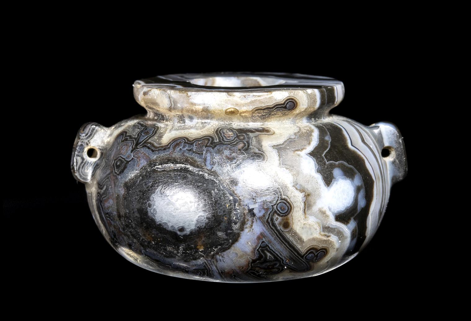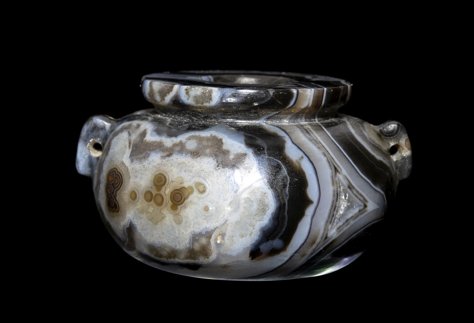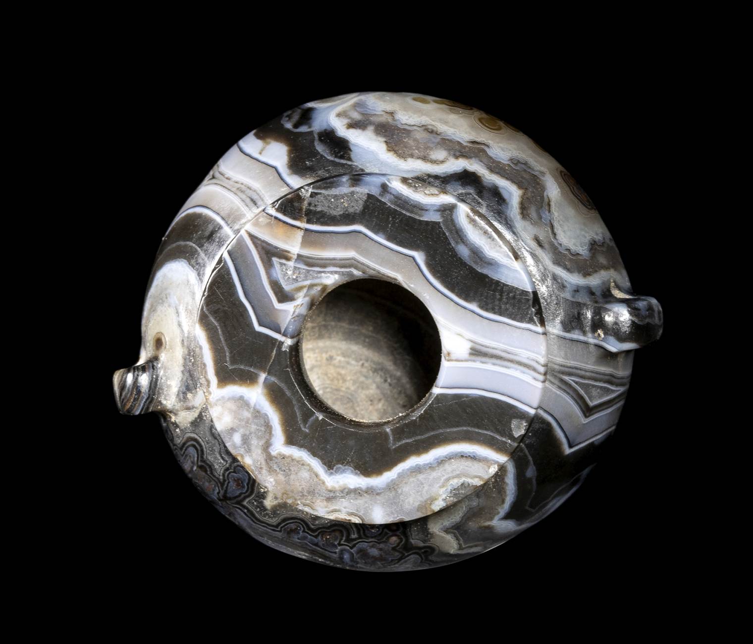 With rounded body and wide disc flat rim off set from the shoulders, with two perforated horizontal lug handles. The vessel form is typical from the Egyptian predynastic jar. Beautiful choice of the stone variety, rich of unusual inclusions and verrucae. Wear marks.