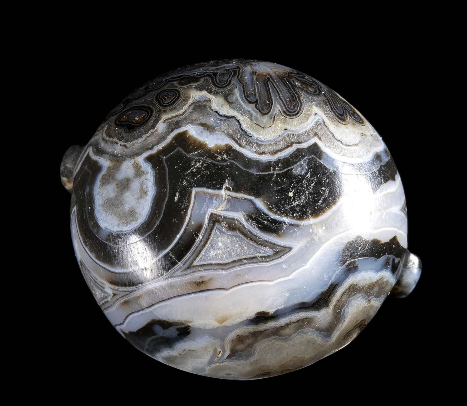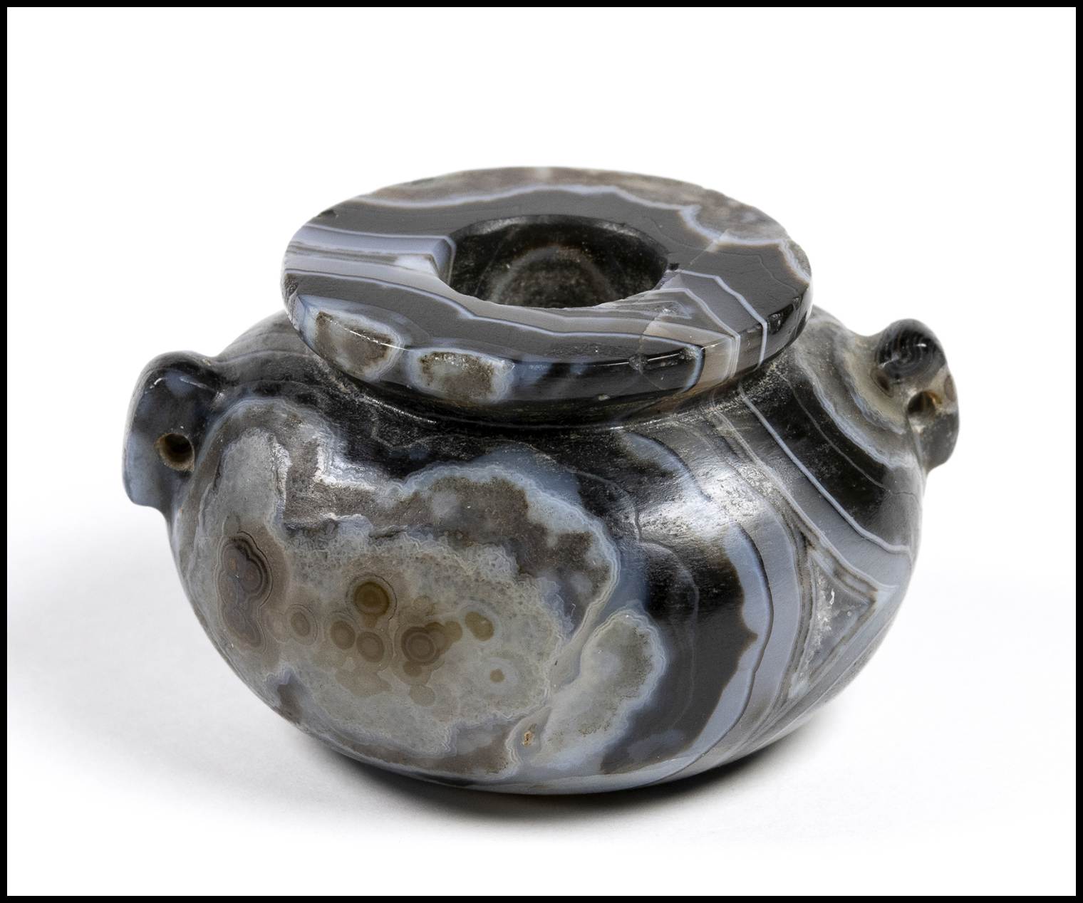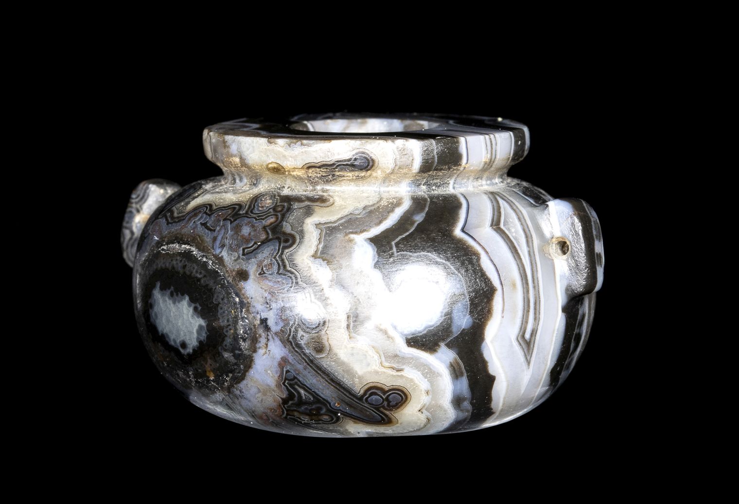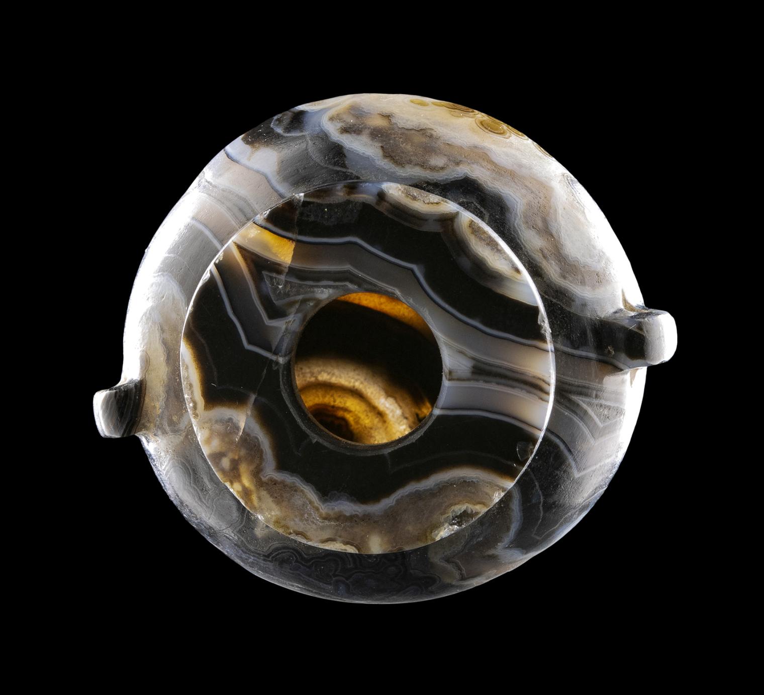 With rounded body and wide disc flat rim off set from the shoulders, with two perforated horizontal lug handles. The vessel form is typical from the Egyptian predynastic jar. Beautiful choice of the stone variety, rich of unusual inclusions and verrucae. Wear marks.
