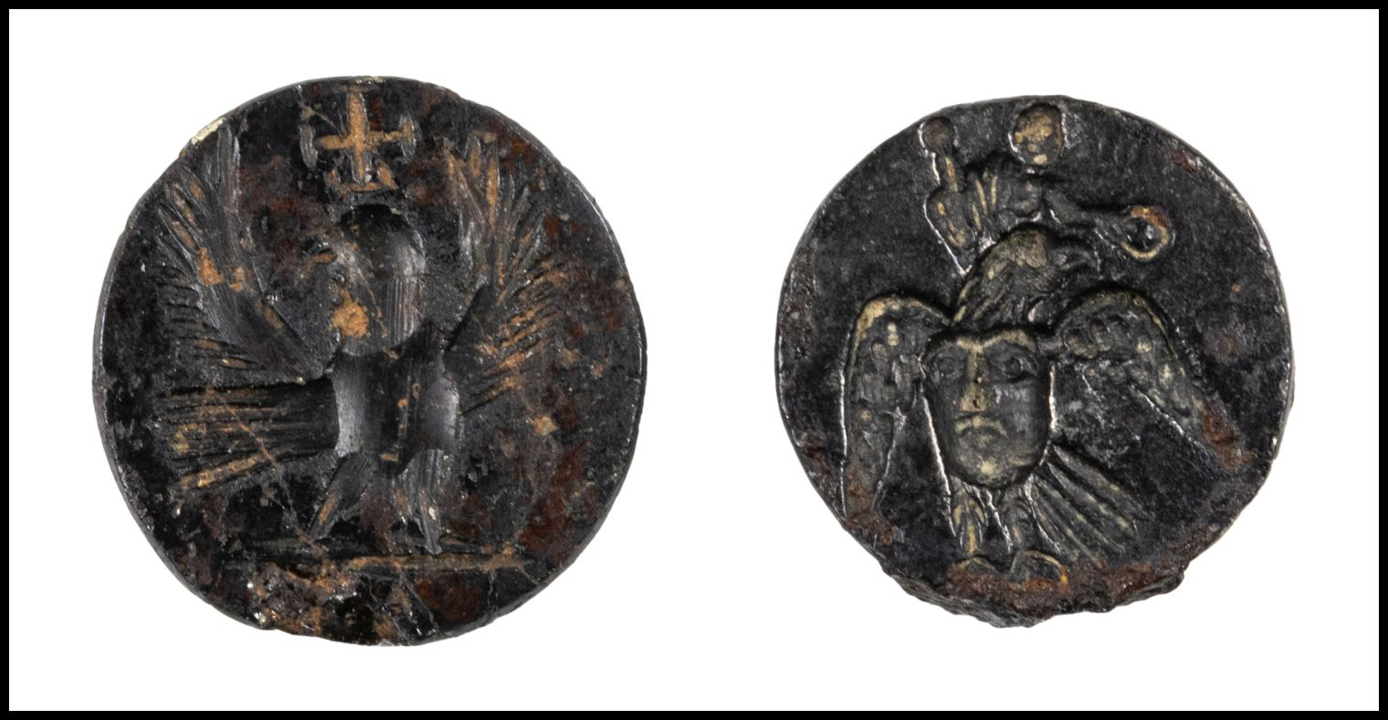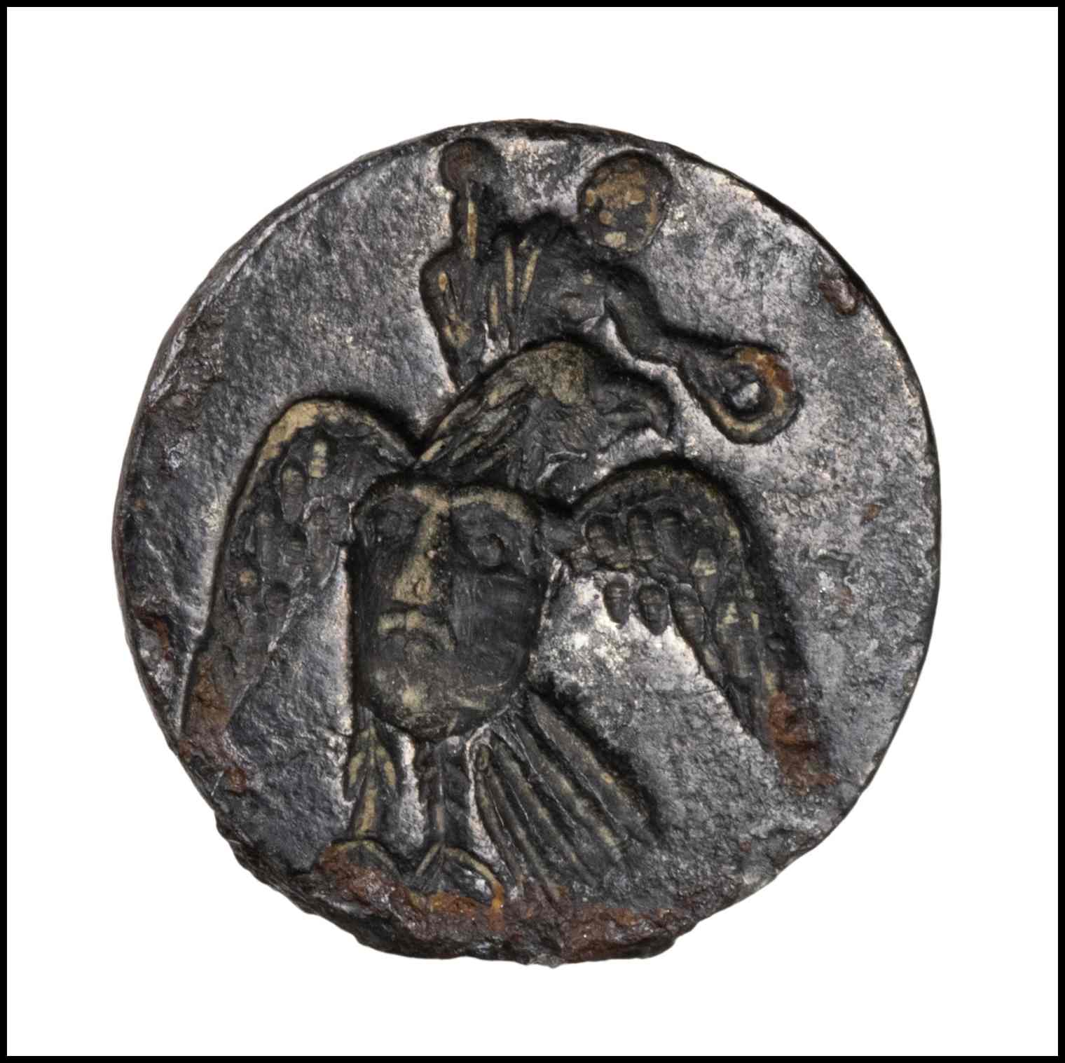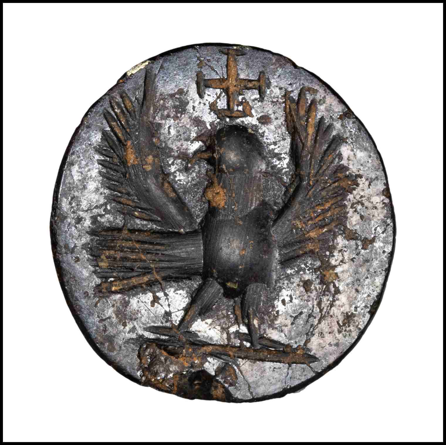 The eagle is standing, the wings wide-spreaded. On top a cross. Groundline. Traces of iron deposits. Wear marks on the surface of the stone. The silver impression depicts Zeus metamorphosis in eagle. Rare.
