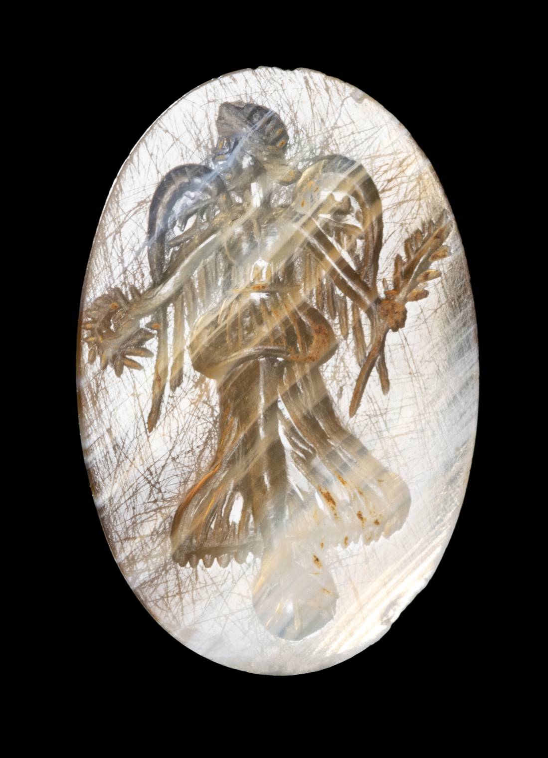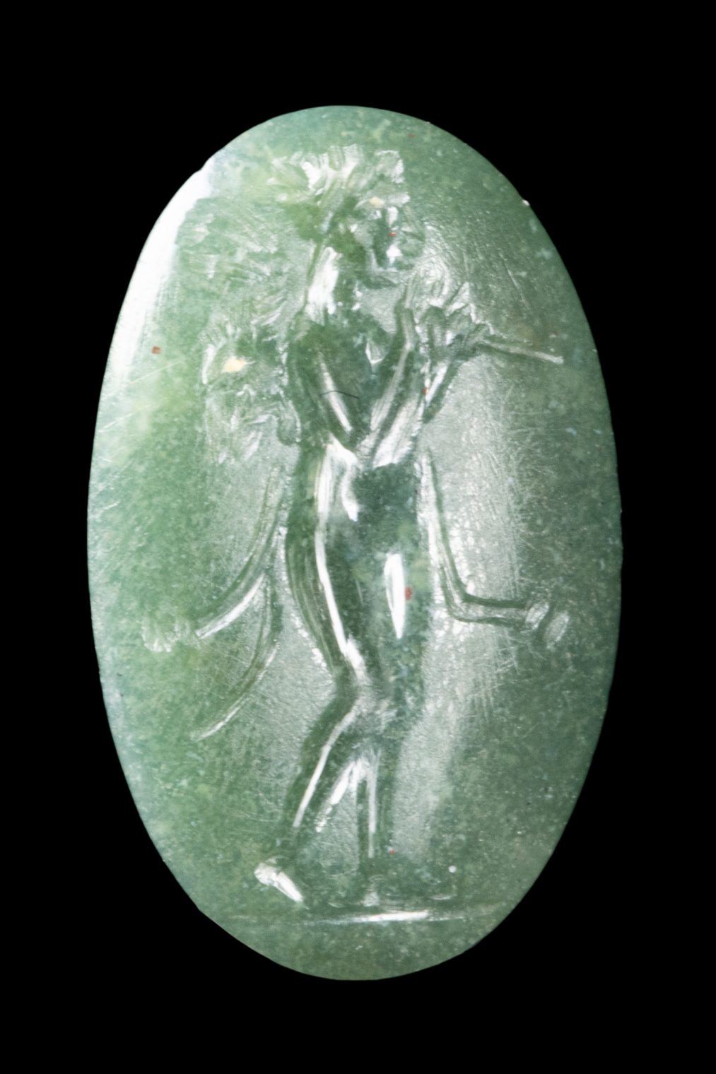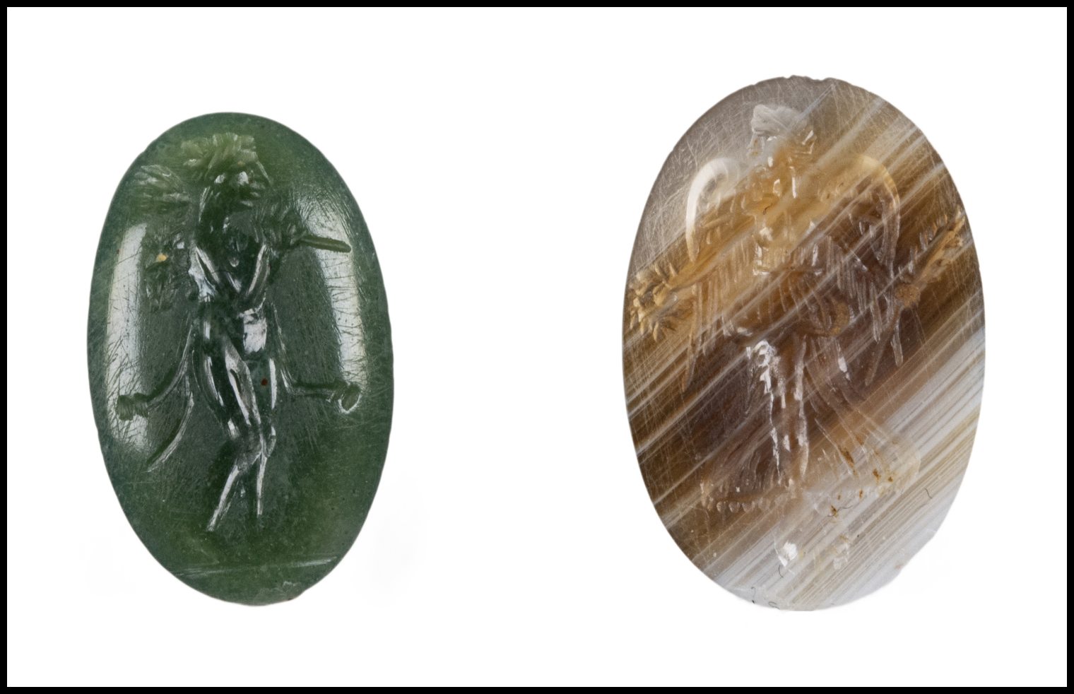 A LOT OF 2 EASTERN ROMAN GREEN CHALCEDONY AND AGATE INTAGLIOS. OMPHALE - NIKE.