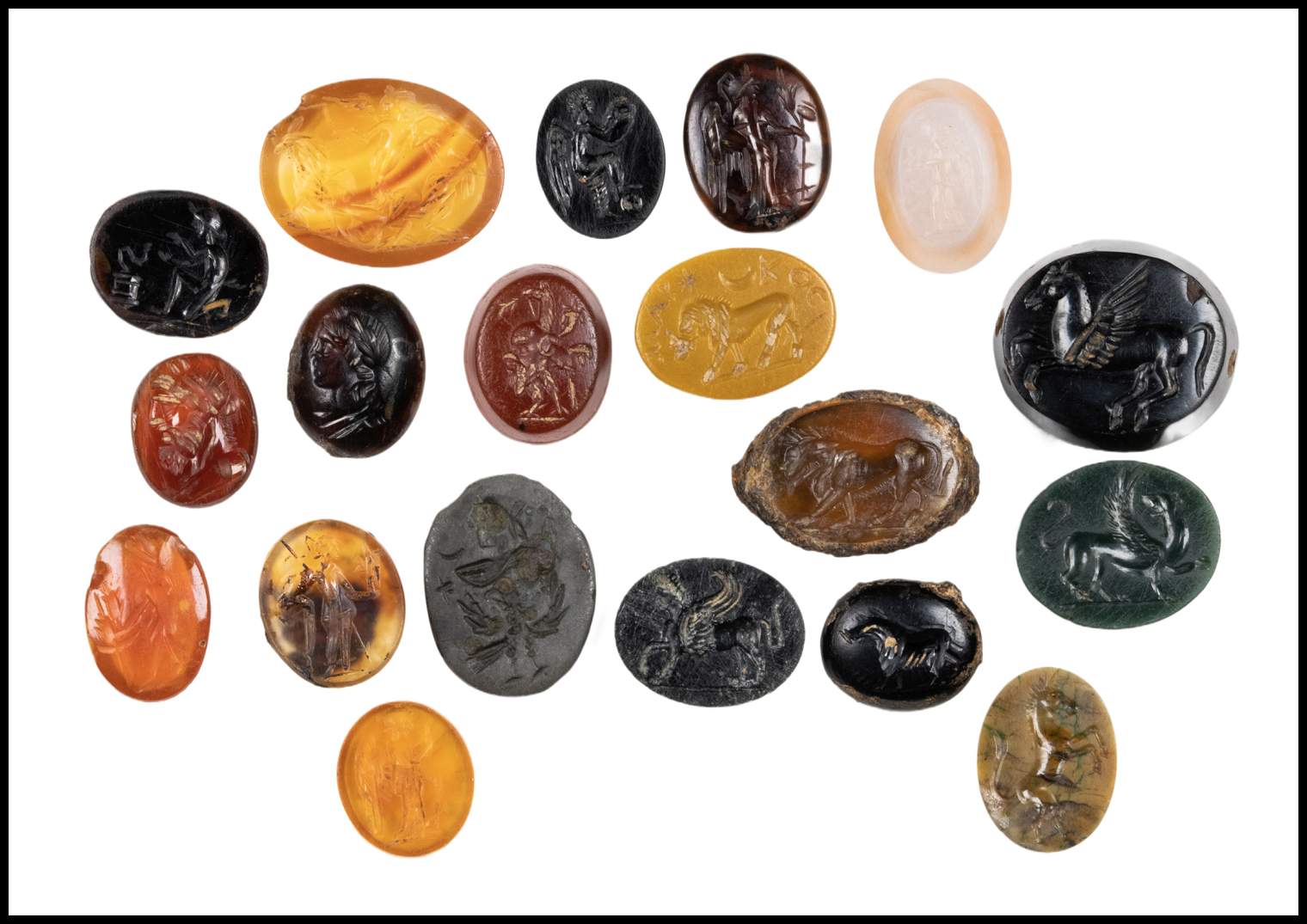 - A Roman agate intaglio: ritual scene with young male and snake; a Roman agate intaglio with Eros riding roosters; a Roman intaglio with Victory holding a laurel wreath; a Roman agateintaglio with Victory holding an ear of corn; a Roman agate intaglio with ???; a carnelian intaglio with a bearded male portrait facing left; a Roman garnet intaglio with Apollo portrait facing left; a Roman carnelian intaglio with gryllos; a gnostic yellow japser intaglio with lion,crescent moon and inscription; an Eastern Mediterranenan agate intaglio with Pegasus; a Roman carnelian intaglio with a character holding ear of corns; a Roman agate intaglio with Athena Nikephora standing right; a Roman hematite intaglio with emblema; a dark jasper intaglio with Sphinx; a Roman dark jasper intaglio with animal; a Roman prasium intaglio with winged panther; a Roman carnelian intaglio with Victory; intaglio with horse.