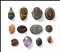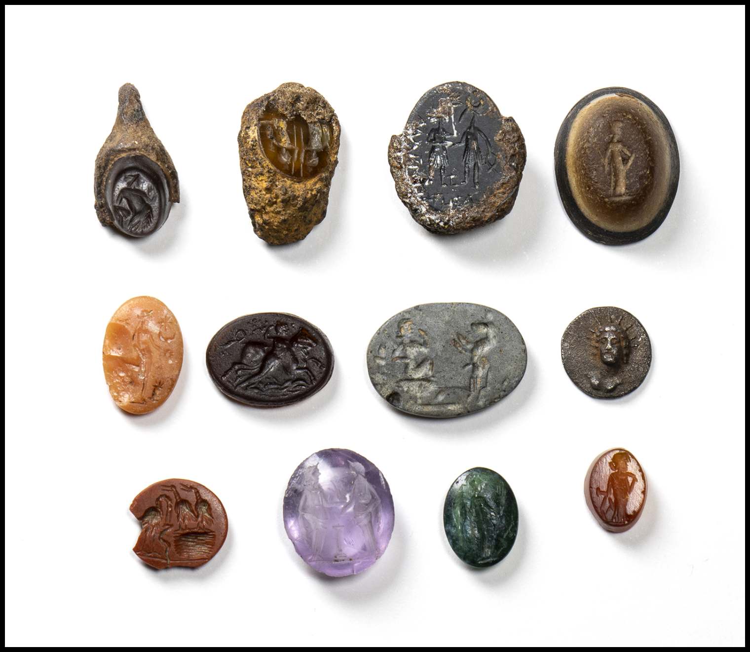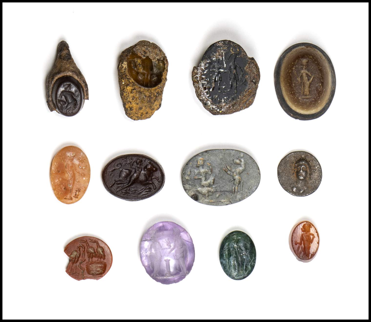 From left to right; a fragmentary bronze ring set with a jasper intaglio, male character; a fragmentary bronze ring set with an intaglio; a fragmentary bronze ring set with a gnostic hematite intaglio; an agate intaglio with a goddess; a carnelian intaglio with a priestress and astrological symbols; a glass impression with Jupiter as a bull and Europe; a gnostic impression with Harpocrates and Thot as a baboon; a bronze plauq e with Helios head; a red jasper intaglio with an ibis providing his feeding her birds with a snake; an amethyst intaglio with two characters facing each other; a green chalcedony intaglio with a goddess; a carnelian intaglio with a female character.