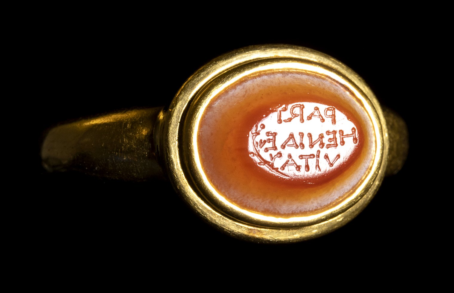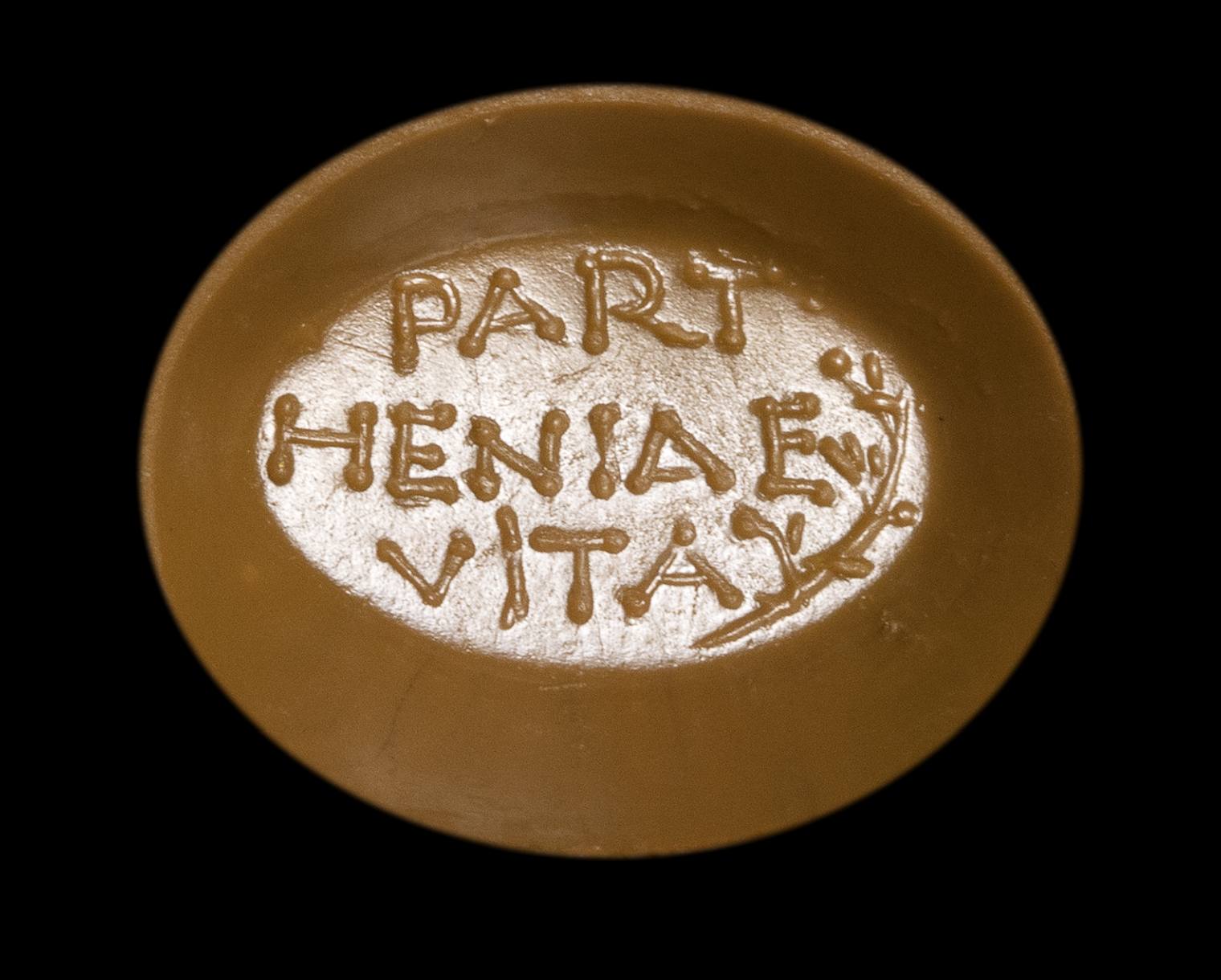Inscription from right to left, on three registers: PART-HENIAE-VITA. Olive branch. Wear marks.