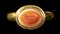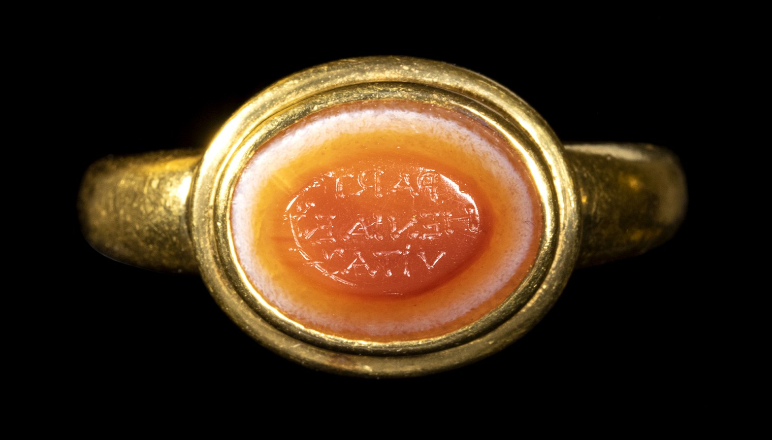 A ROMAN AGATE INTAGLIO SET IN A MODERN GOLD RING. INSCRIPTION.