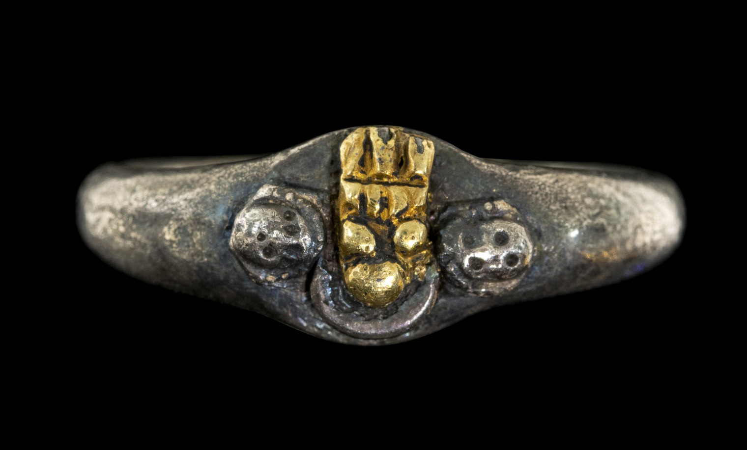 AN EARLY MEDIEVAL SILVER RING WITH SKULL HEADS AND CENTRAL GILDED EMBLEMA.