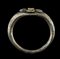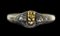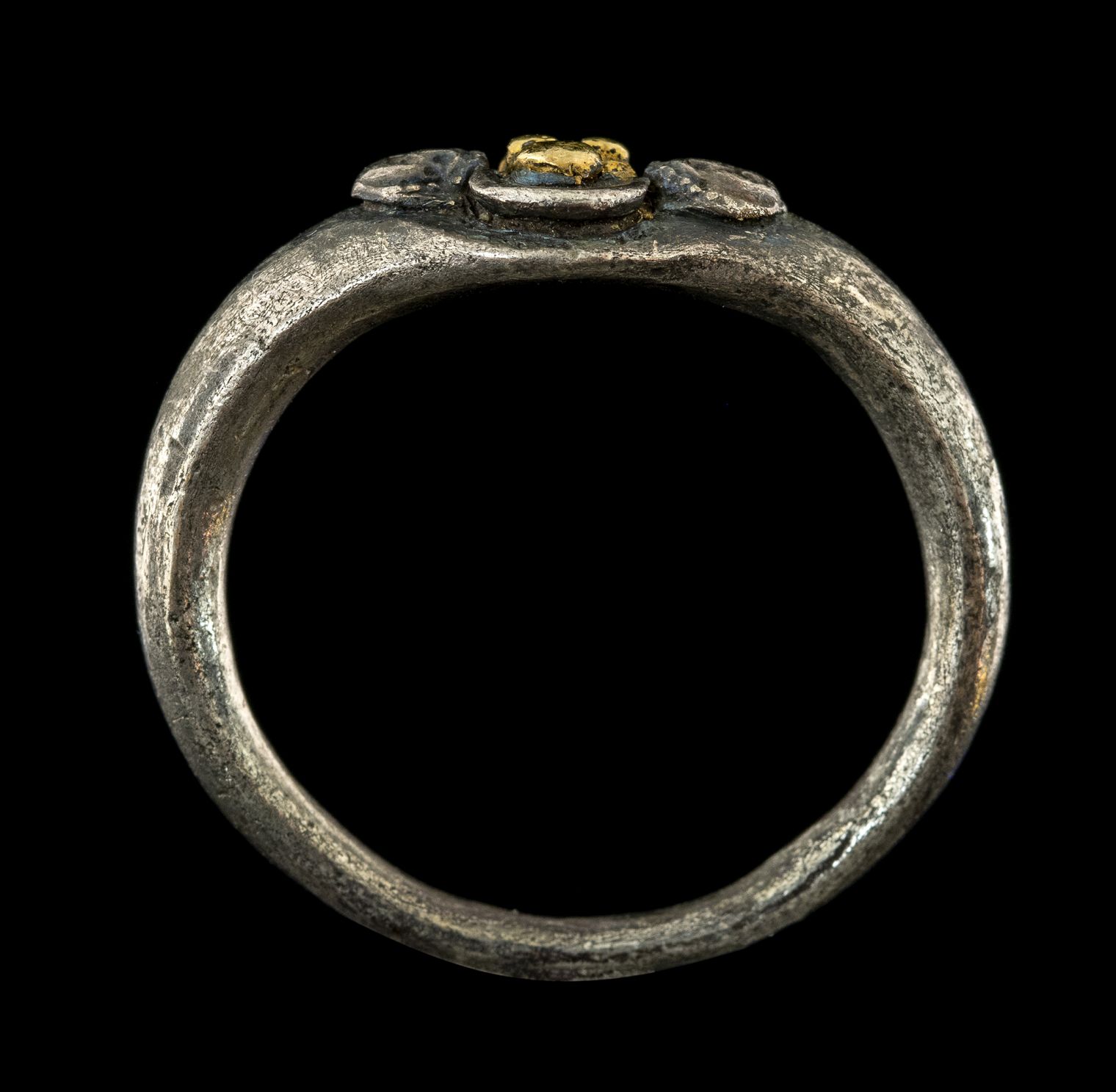 With rounded hoop expanding upwards and ending with an oval bezel with molded central gilded emblema (stem ?) framed by stylized skull heads. Wear marks. Rare.